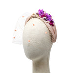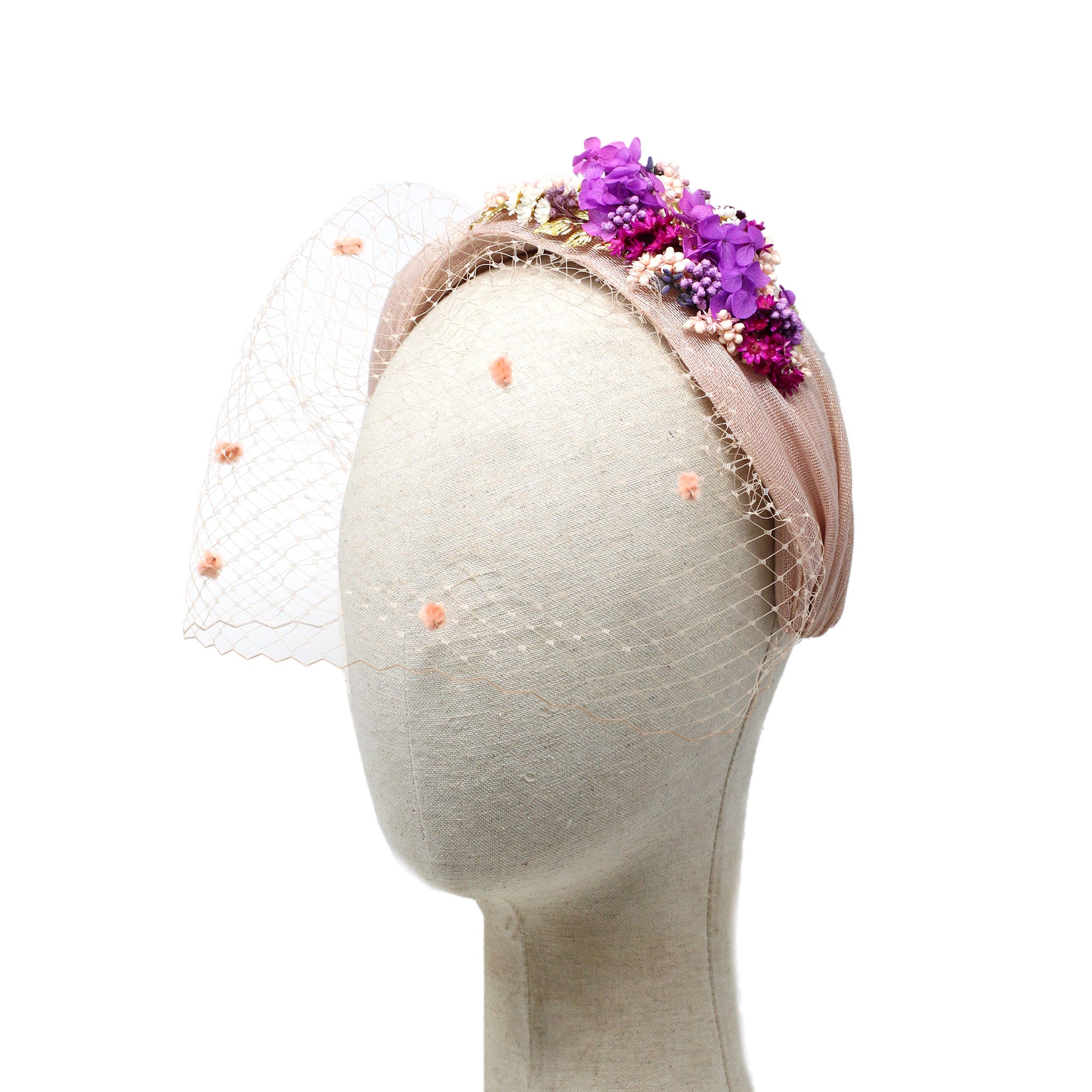 Diadema con diseño cruzado elaborada totalmente a mano son sinamay de color rosa nude. Decoración de flores preservadas en uno de sus laterales y  detalles joya en dorado.