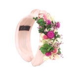 Diadema de nudo elaborada totalmente a mano con sinamay de color rosa nude. Lleva decoración con motivos florales en uno de sus laterales.