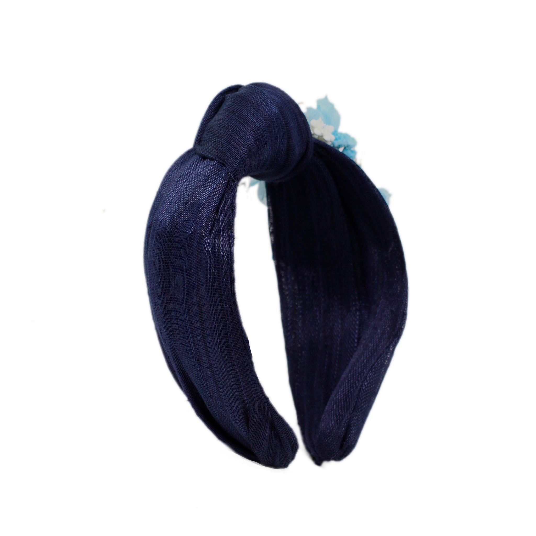 Diadema de nudo elaborada totalmente a mano con sinamay de color azul marino. Lleva decoración con motivos florales en uno de sus laterales.