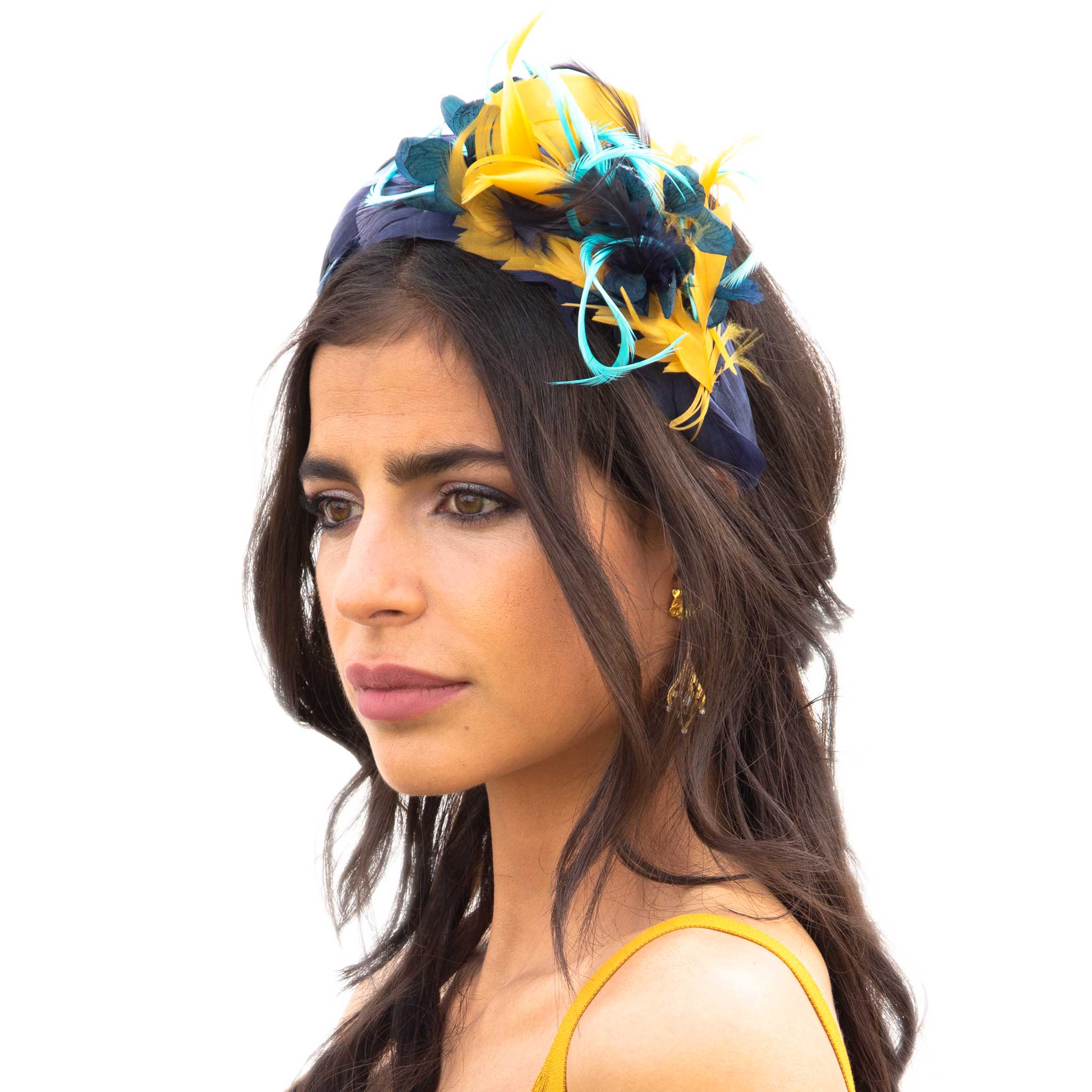 Diseño totalmente elaborado a mano a base de plumas tanto en su base como en su decoración lateral, la cual está compuesta de plumas de diferentes colores y tamaños. Este efecto aportará altura y por lo tanto estilizará el look.