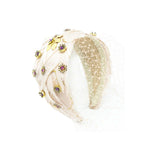 Diadema elaborada a mano con plumas con flecos dorados pintados a mano y decorado con piezas joya en tonos dorados y plateados y piedras semipreciosas.