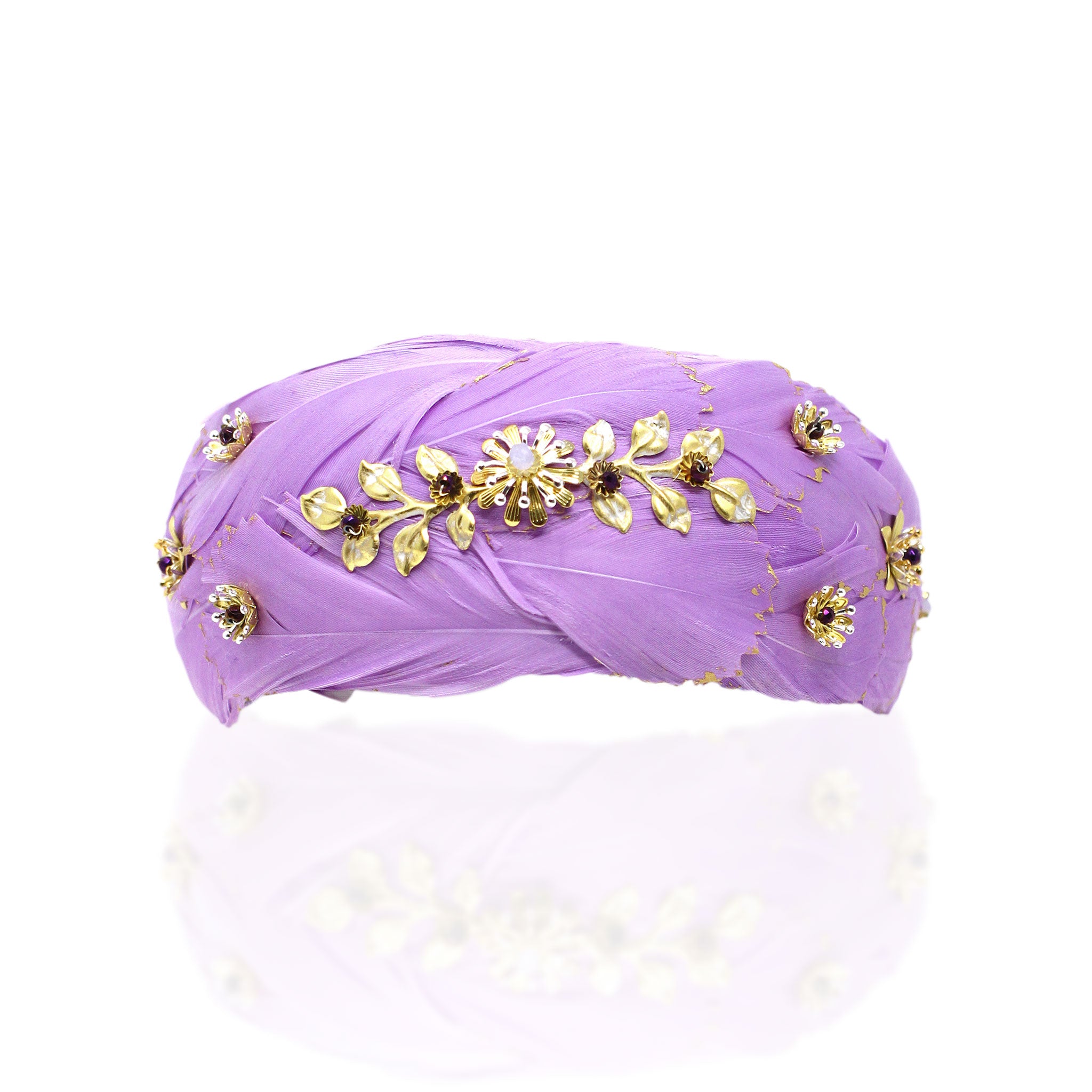 Diadema totalmente elaborada a mano recubierta de plumas y decorada con joyas y piedras semipreciosas. Los filos de cada pluma van pintados a mano.