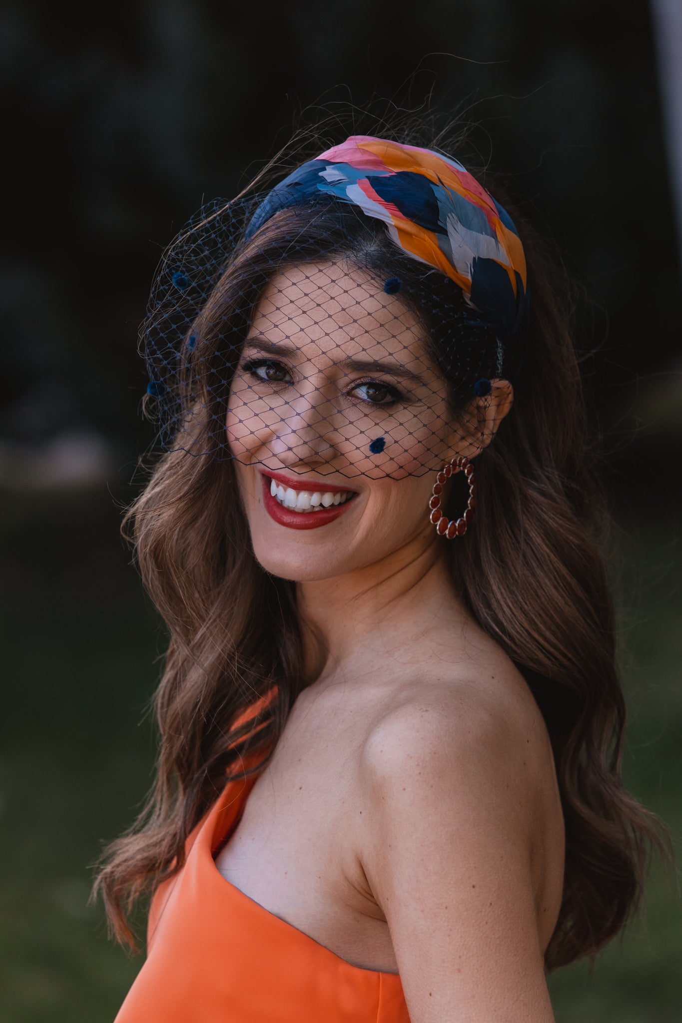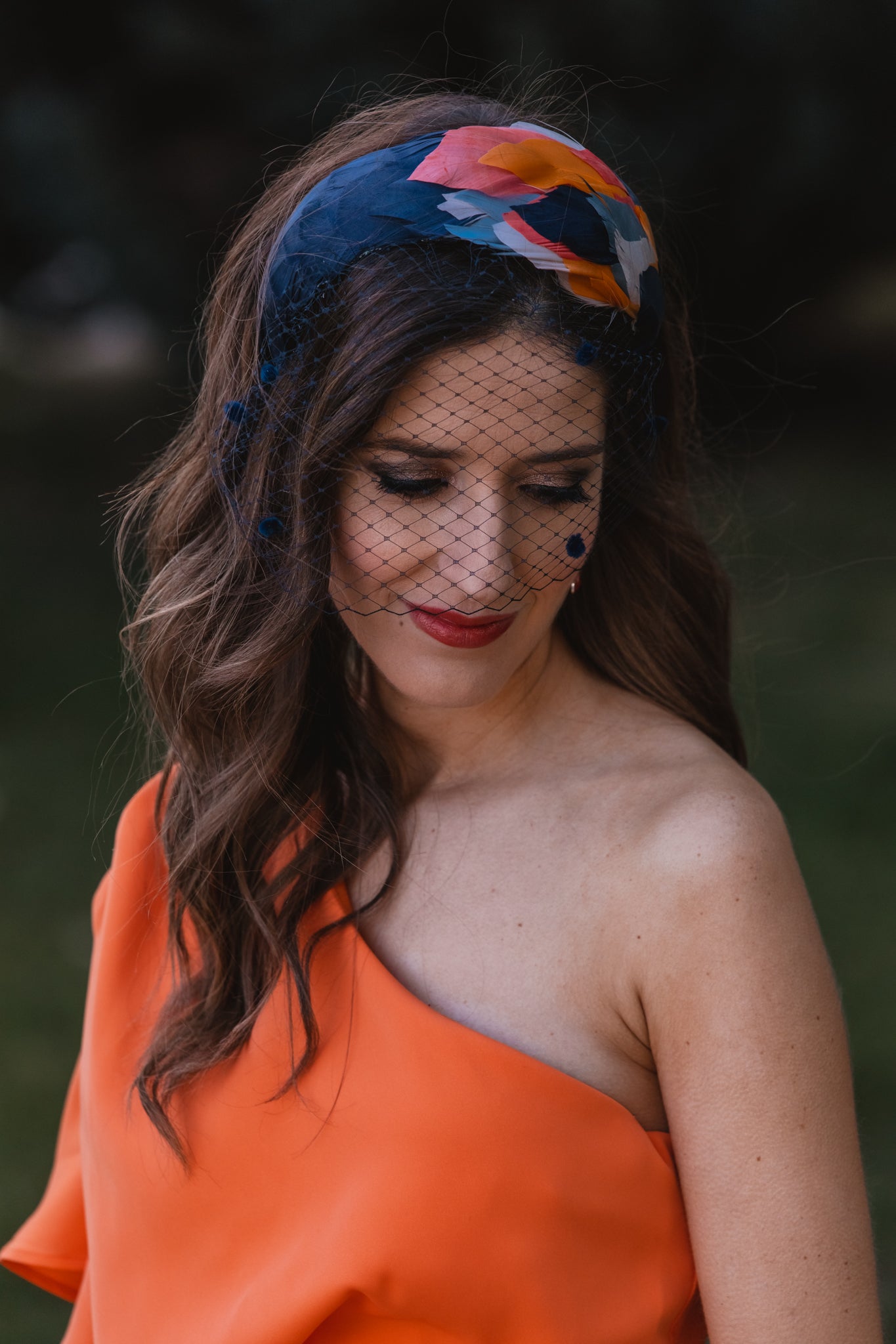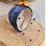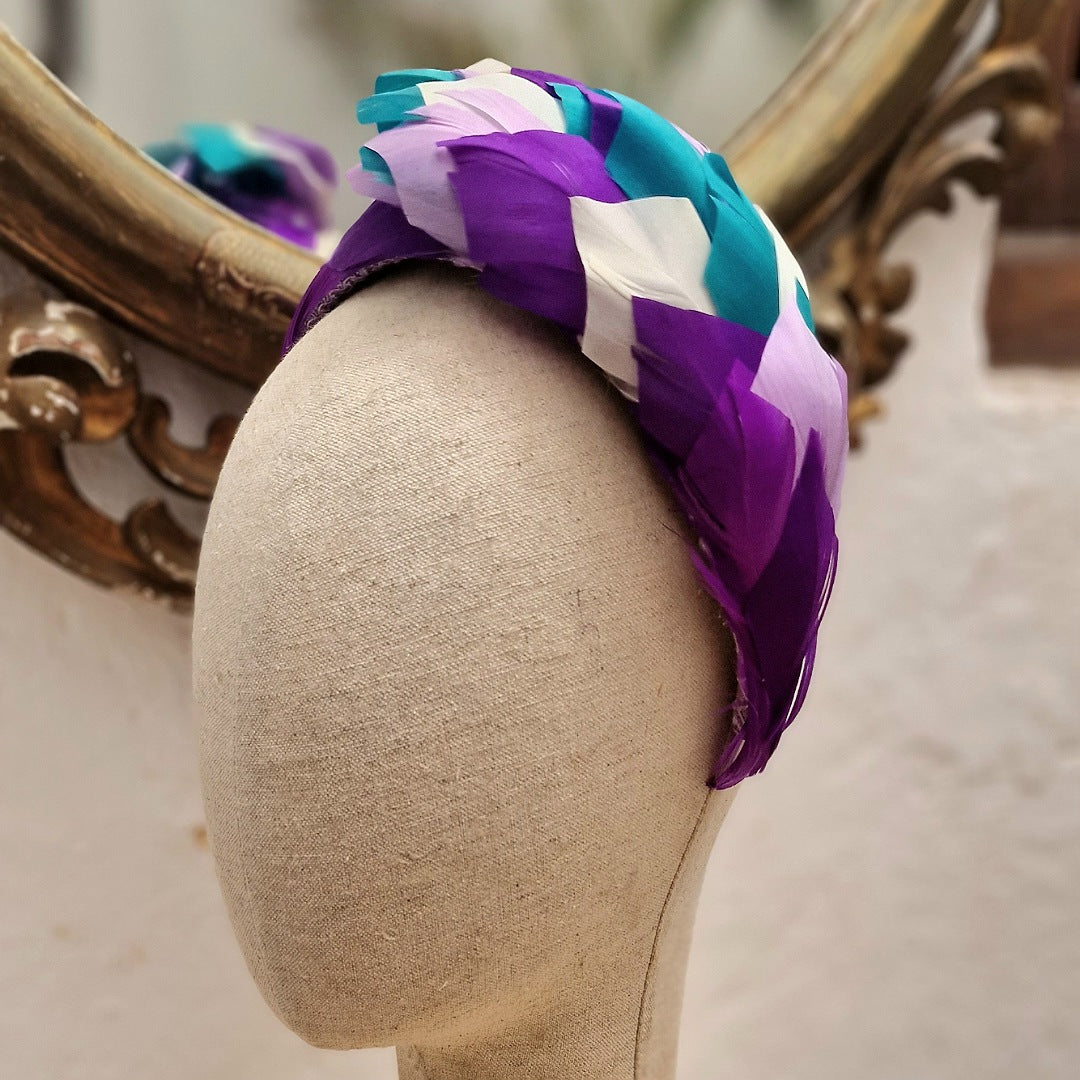 Diadema de plumas de colores alegres. Su decoración lateral puede ir pegada a la estructura de la diadema si quieres un diseño más sencillo o levantada si lo que quieres es conseguir un toque diferente y altura.