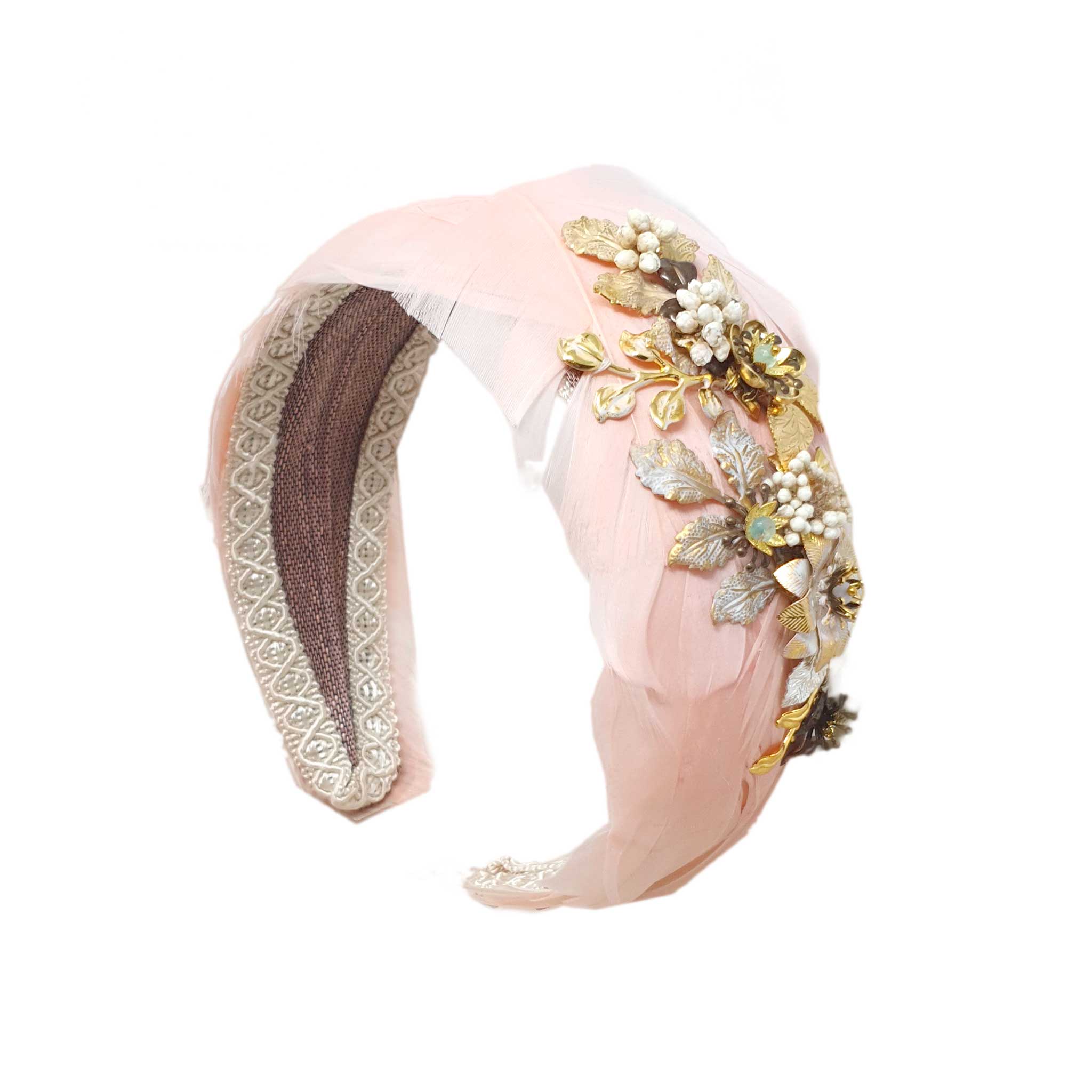 Diadema elaborada totalmente a mano con plumas en una tonalidad rosada, decorada en uno de sus laterales con piezas joya. Esta pieza ha sido creado para ser llevada tanto por novias como invitadas.