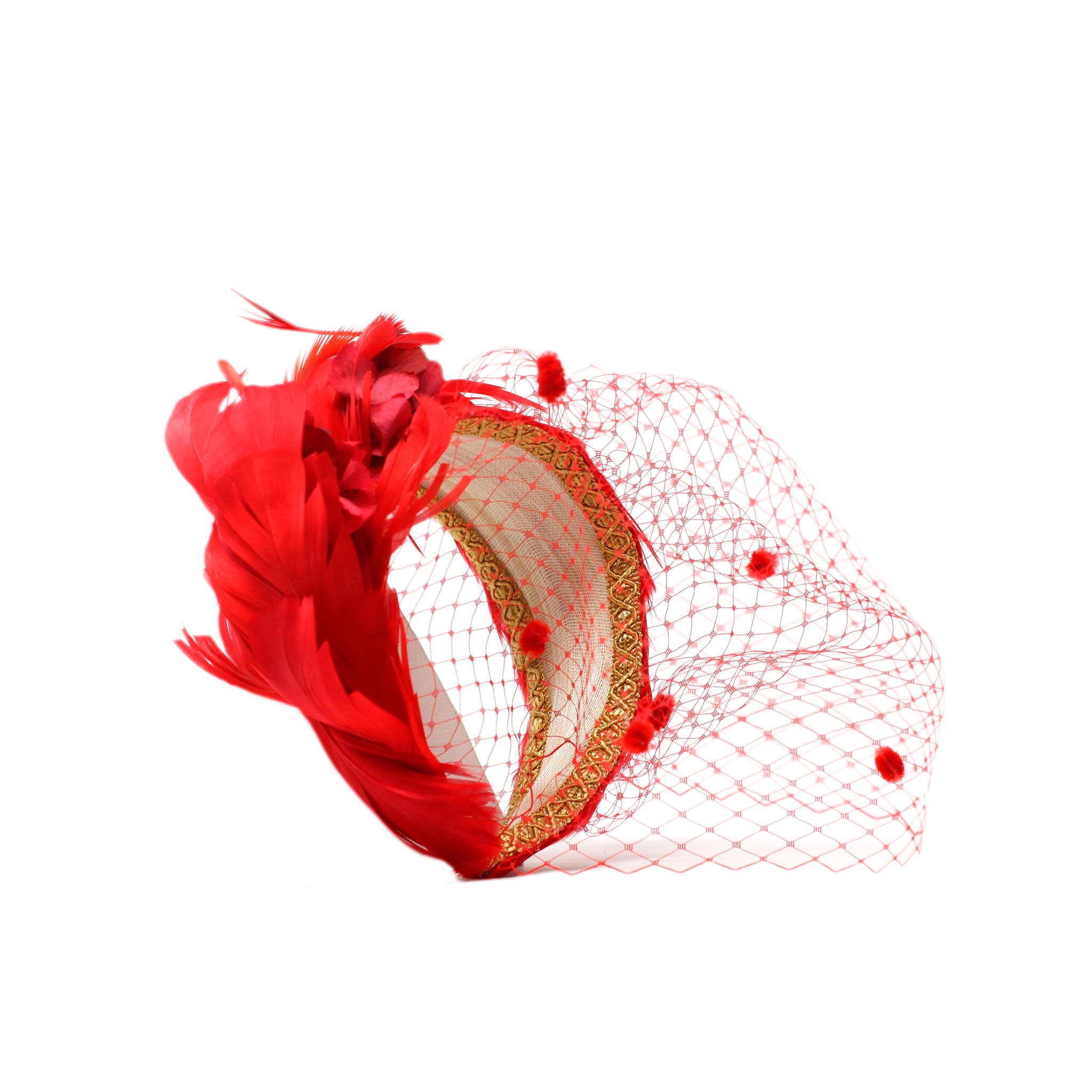 Diadema elaborada totalmente a mano a base de plumas rojas. Puedes elegir la diadema con o sin velo corto de tul.