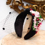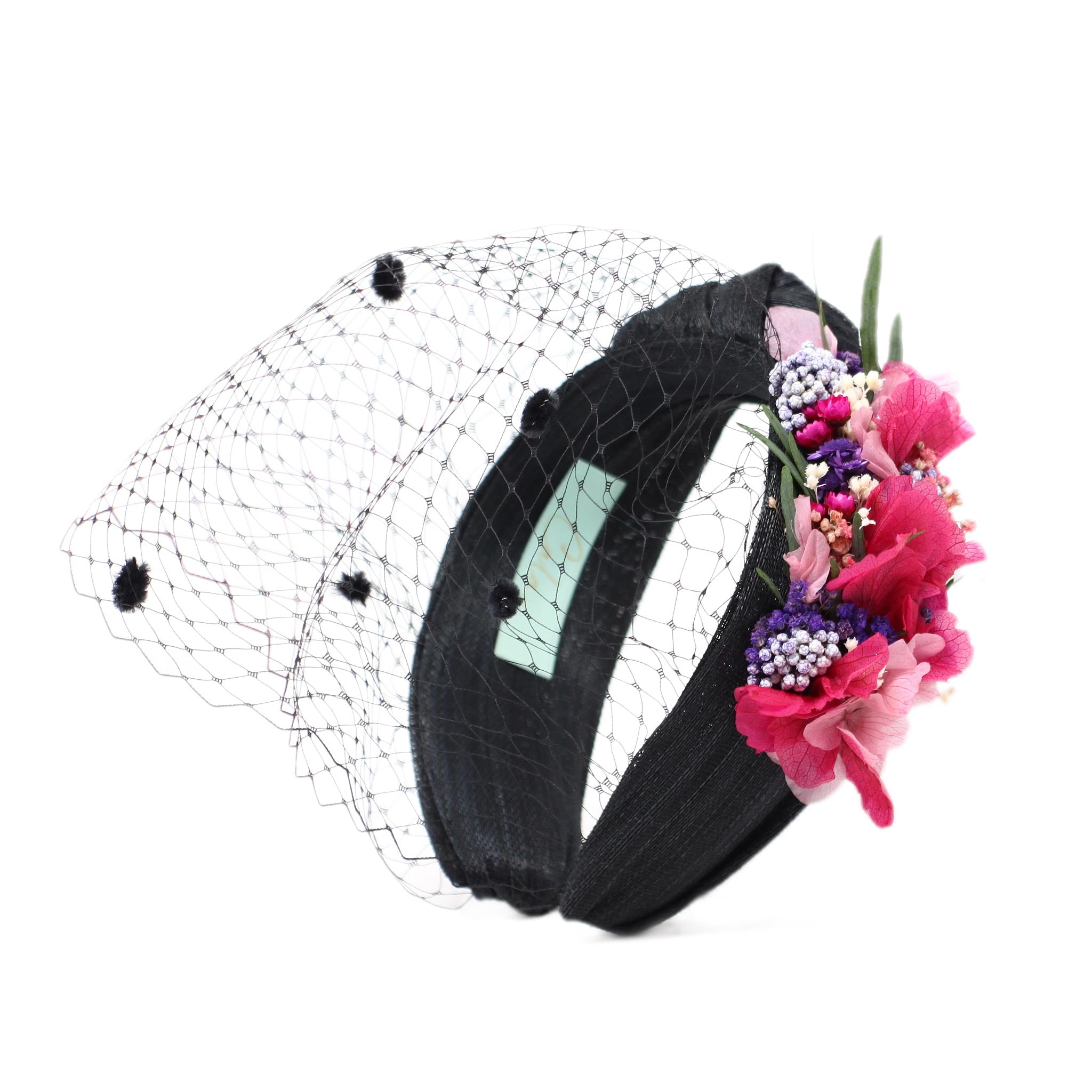 Confeccionada a mano con tejido de sinamay seda en tono negro, se distingue por su refinada decoración con flores naturales preservadas.