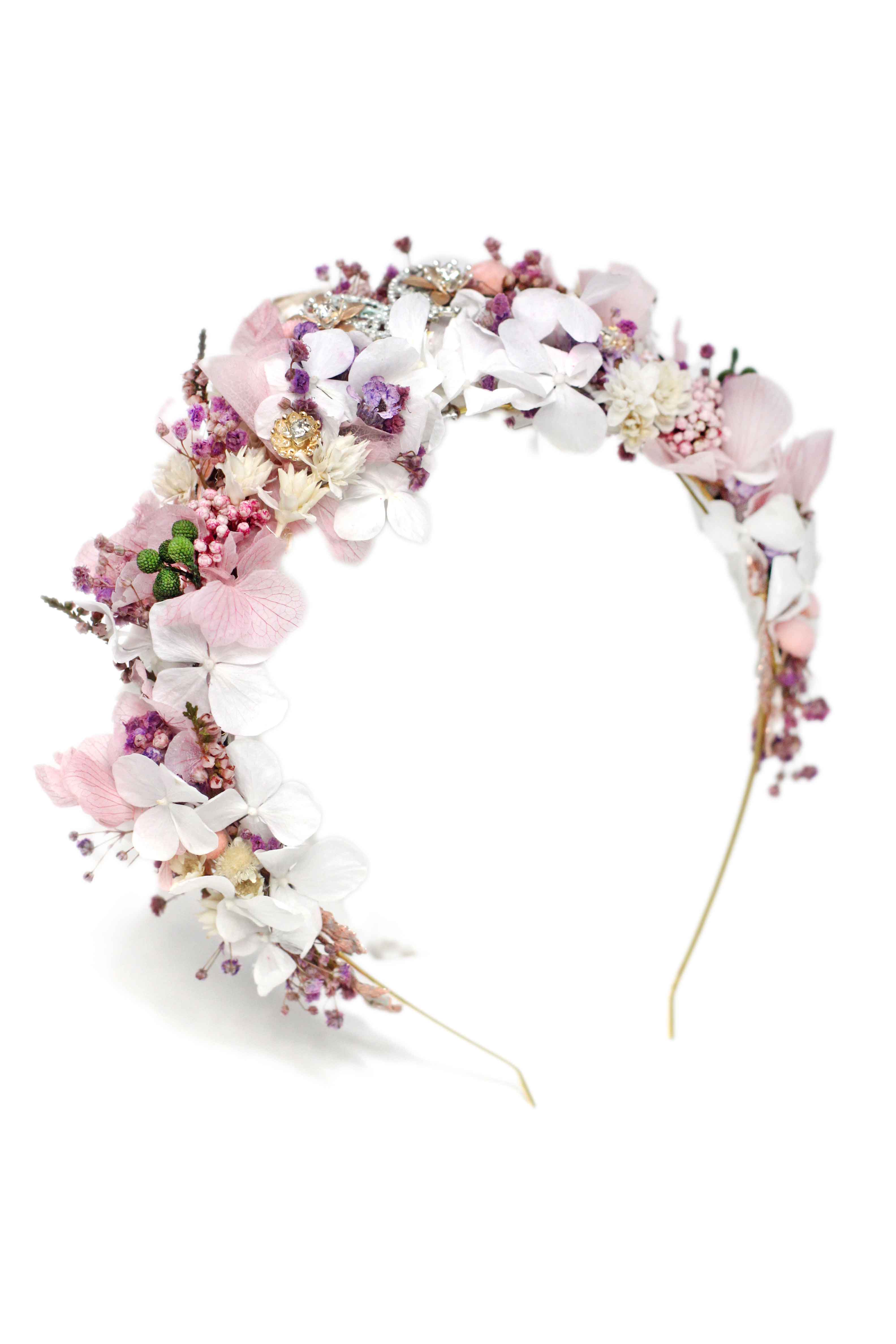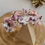 Diadema de flores naturales preservadas en tonos morados, rosas, blancos y algún detalle verde. Terminado con detalles joya en forma de hojas y flores.
