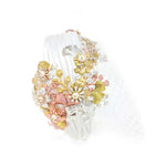 Esta preciosidad es una de esas locuras que salen del taller de Lilian cuando se encuentra muy inspirada. Es una diadema de tela blanca decorada con una variedad de piezas joya en tonos dorados, plateados y oro rosa. Además tiene perlas naturales en el centro de las flores joya.