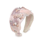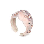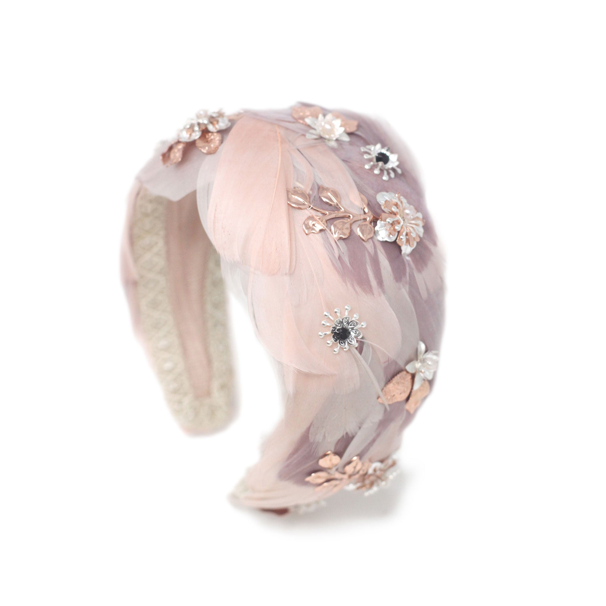 Diadema totalmente elaborada a mano con plumas en tonalidades rosadas. Decorada con piezas joyas simulando la plata y el bronce.