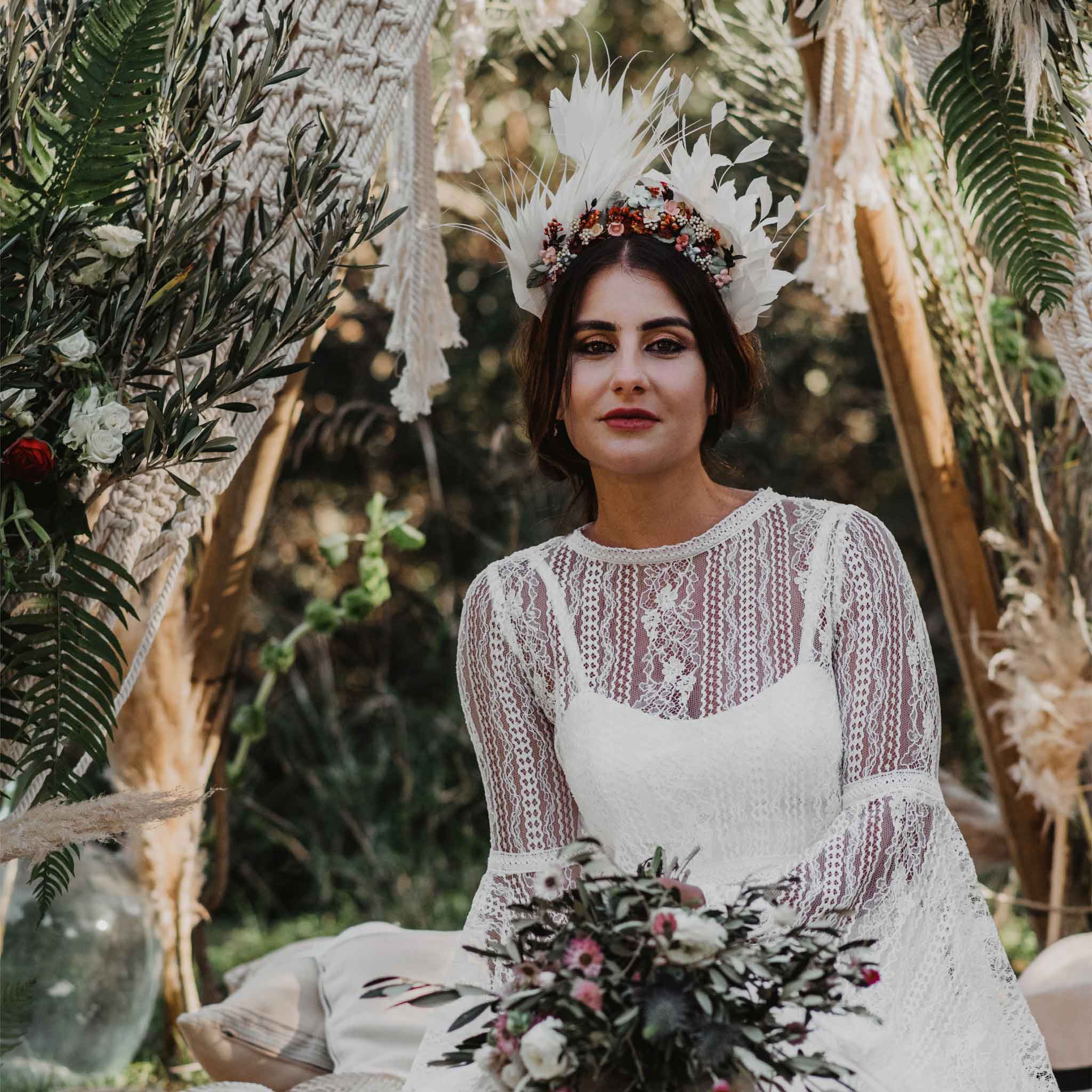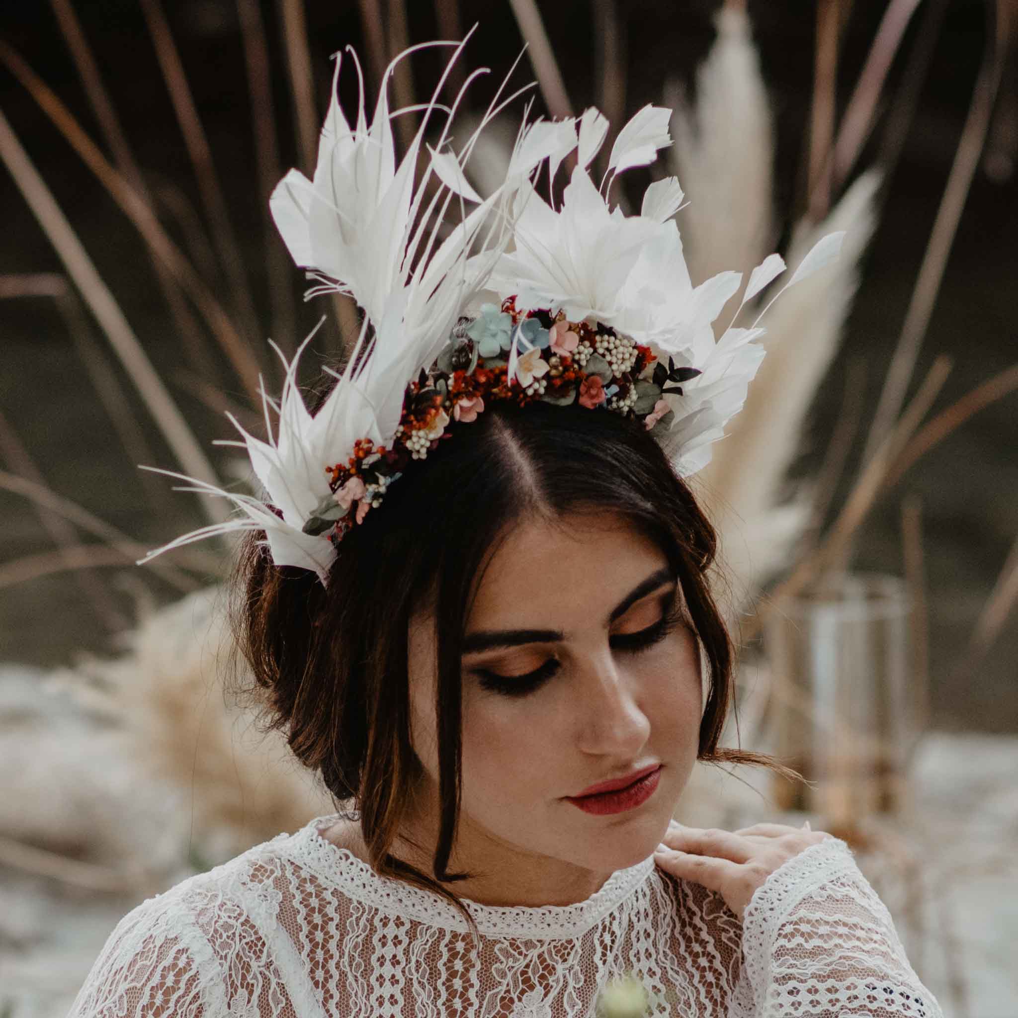¡Este es el tocado perfecto para aquellas novias potentes que no quieren pasar desapercibidas! Lo mejor de todo es que este diseño tiene dos versiones: con o sin las plumas. Es decir, la podemos elaborar en una sola diadema o bien la podemos hacer para que puedas quitar y poner las plumas.