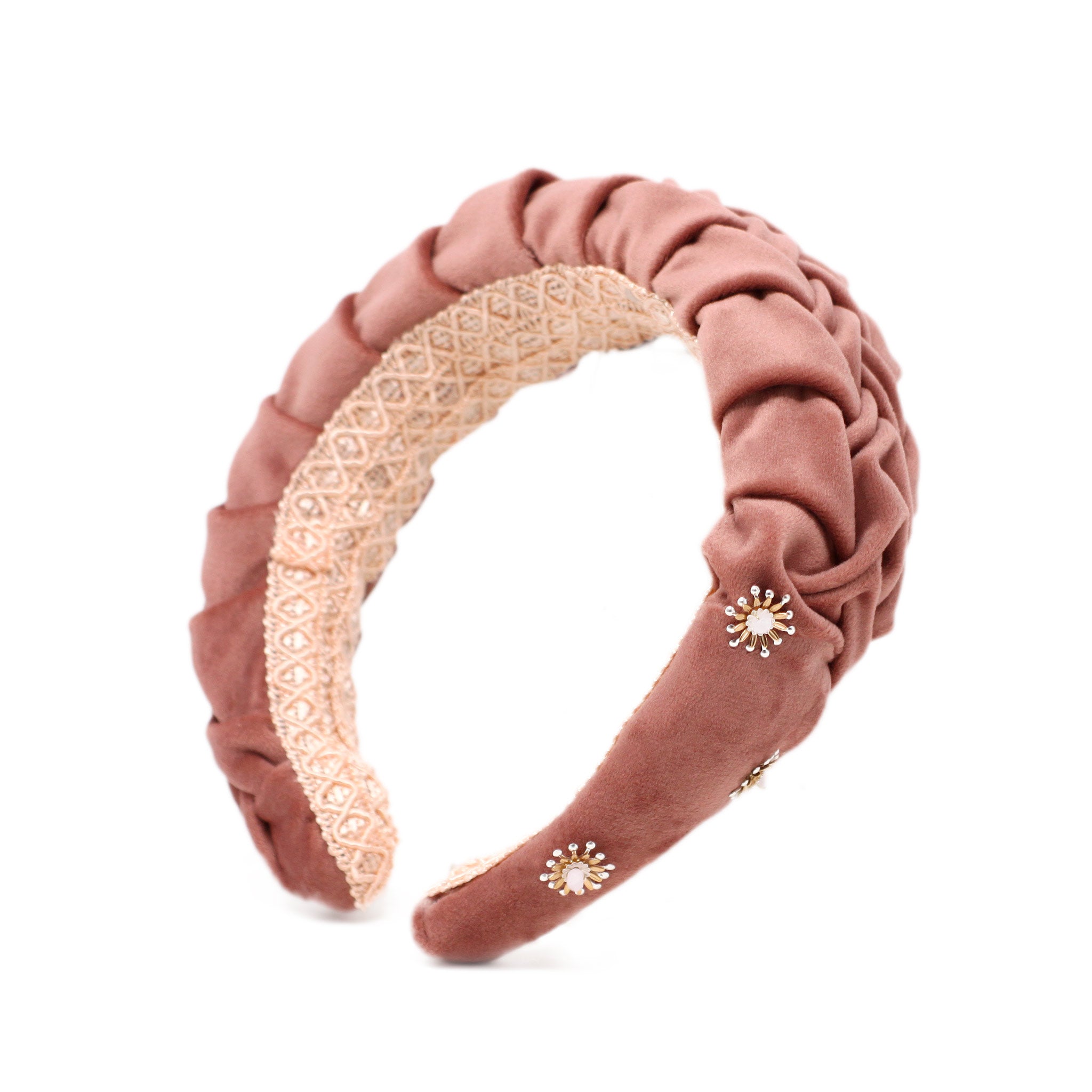 Diadema acolchada trenzada a mano en terciopelo con detalle de decoración joya. Una pieza ideal para darle ese toque diferente a tu look de invierno, y un extra de volumen tremendamente favorecedor.