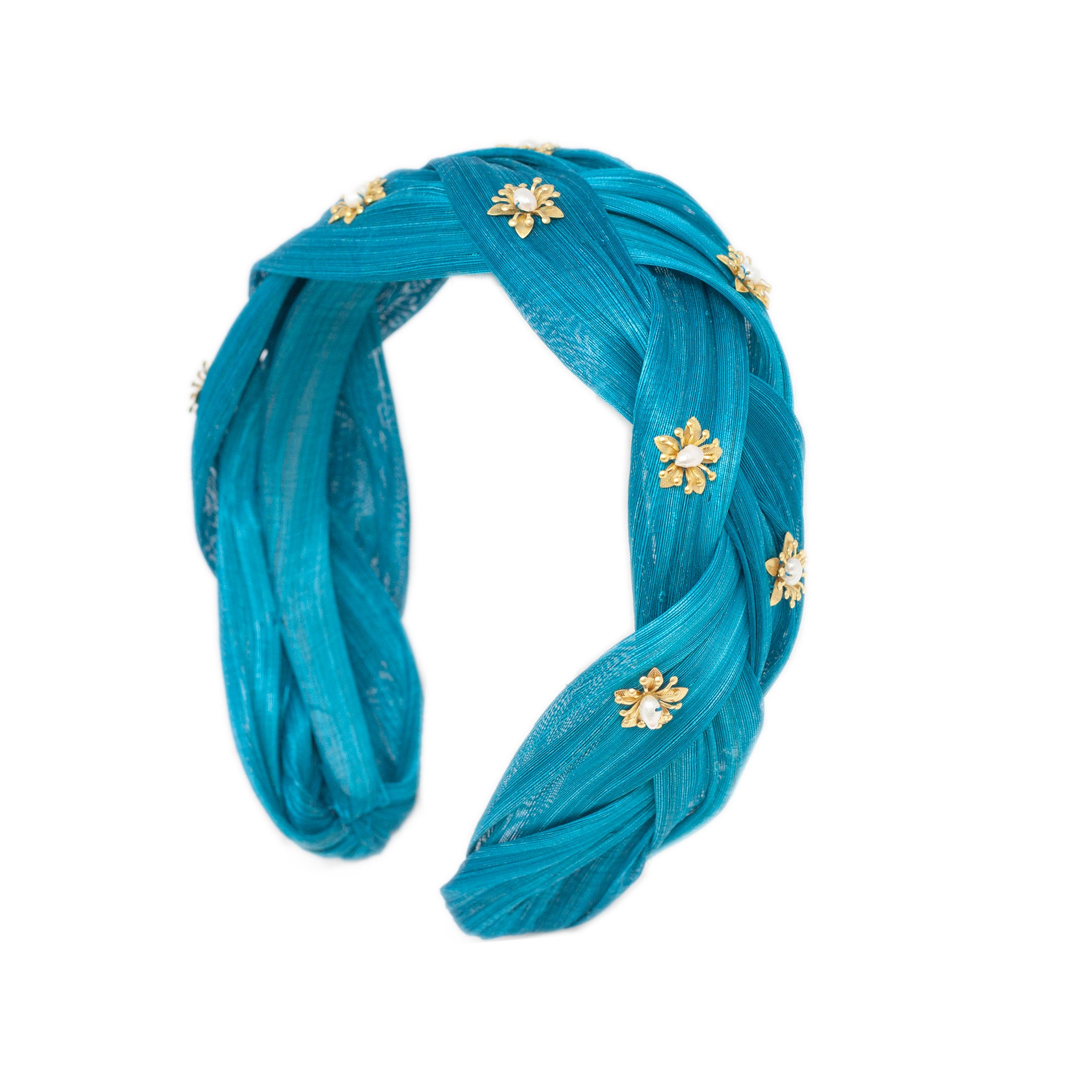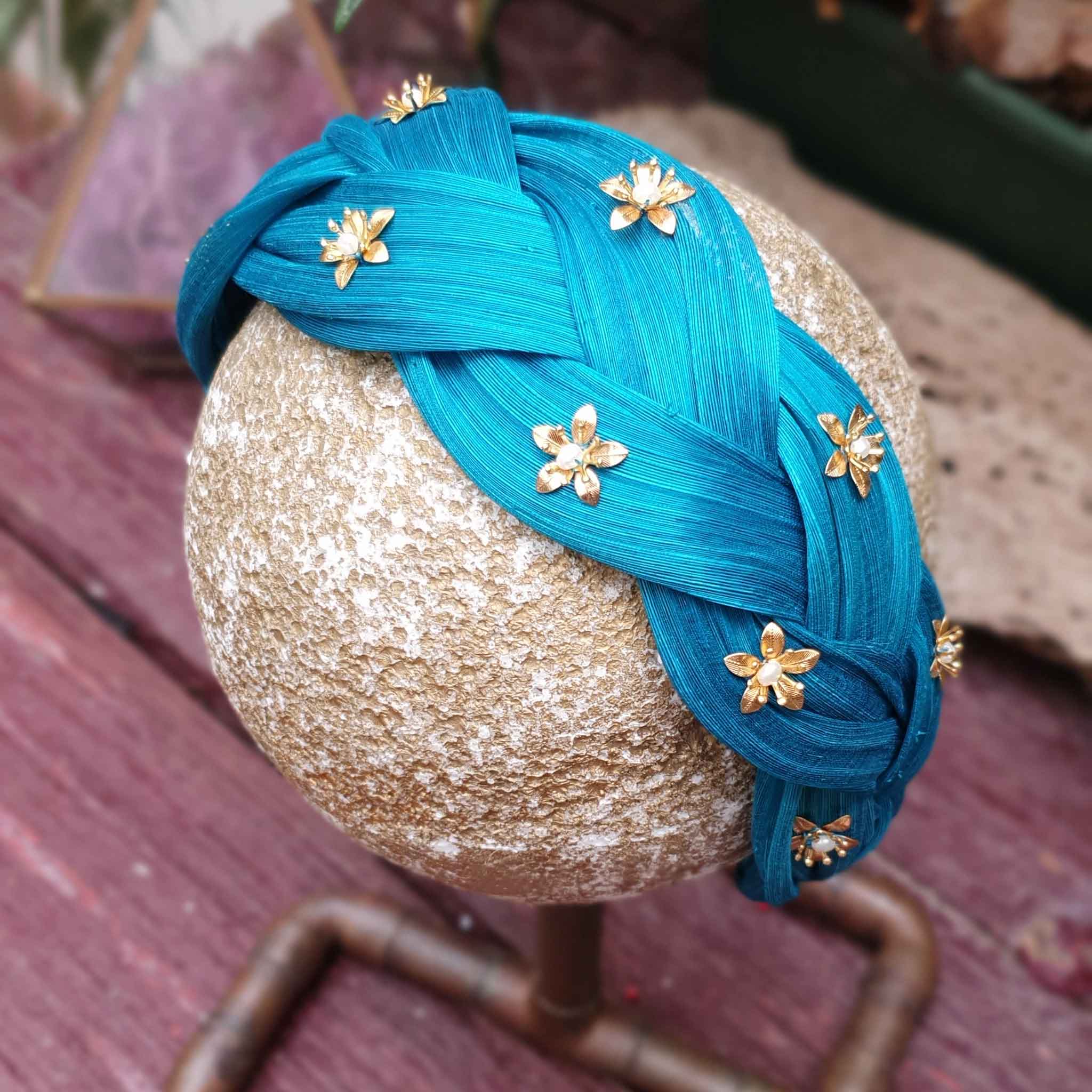 Diadema de sinamay abaca seda trenzada totalmente elaborada a mano, decorada con detalles de estrellas bronceadas o florecitas joya doradas. Esta preciosa diadema aporta un poco de volumen a tu look y es ideal para añadir ese toque final a tu look.