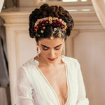 ¡Esta diadema es una auténtica maravilla! Está elaborada mezclando piezas joya, piezas de porcelana y flores preservadas para crear una pieza totalmente única. Su altura y ramos de flores joya que se extienden por la corona de la cabeza harán que te sientas espectacular en tu gran día.