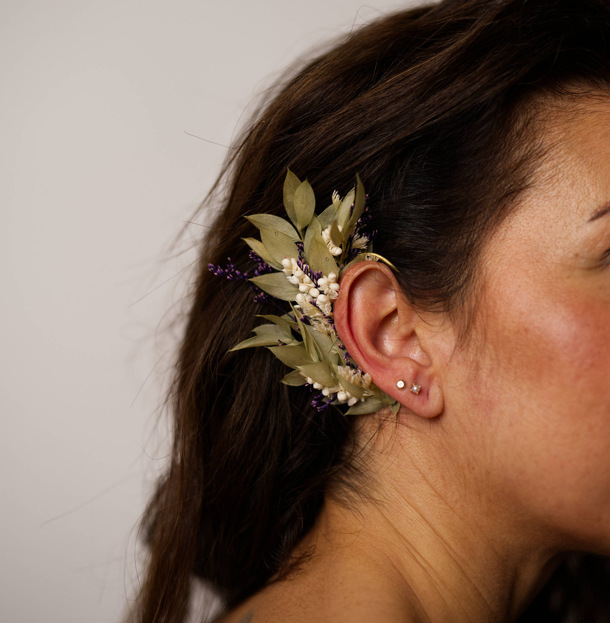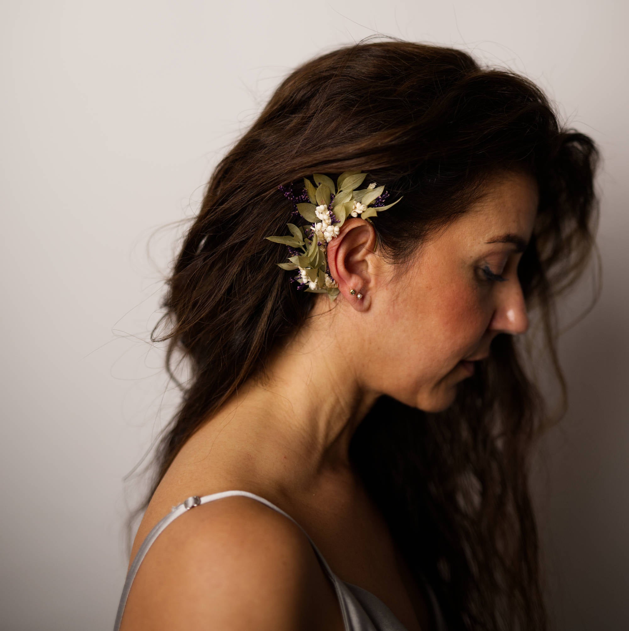 Está decorado con flores y hojas naturales preservadas, dispuestas con precisión para crear una estética natural, sutil y elegante. Su diseño aporta un toque original y refinado, perfecto para quienes buscan un accesorio diferente y con personalidad.