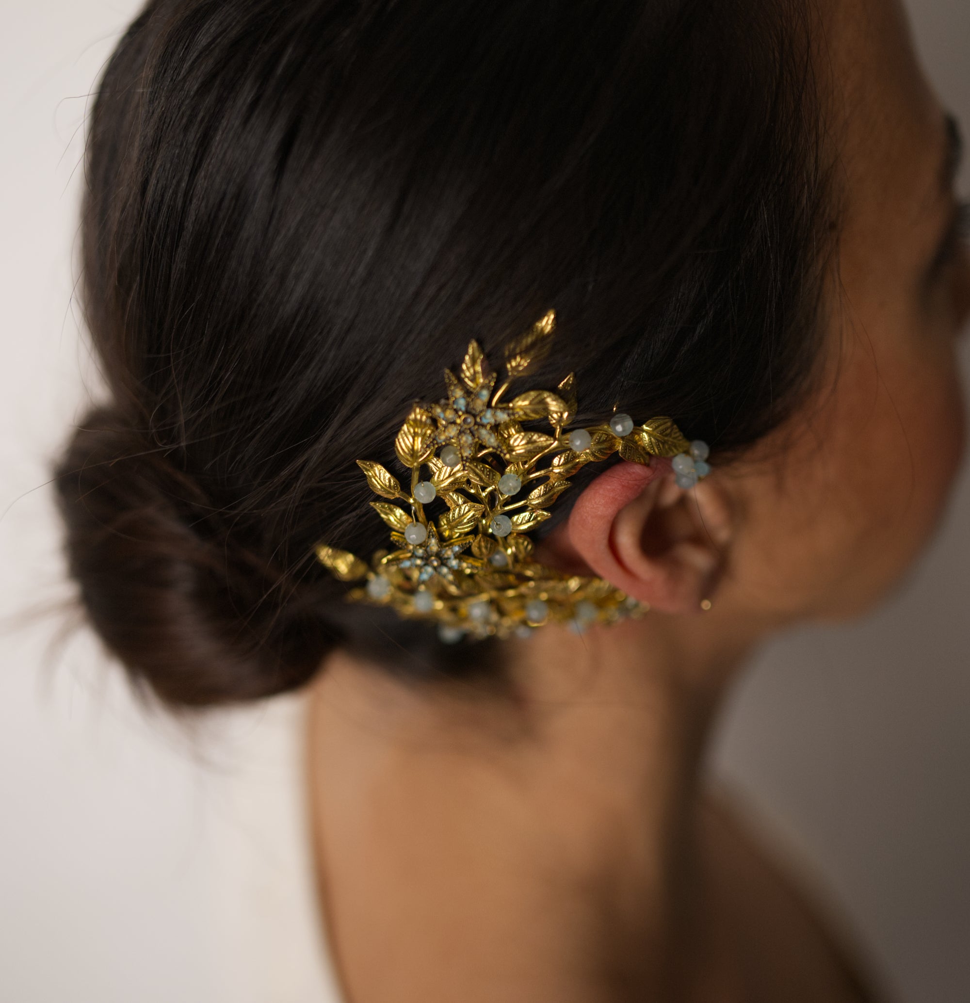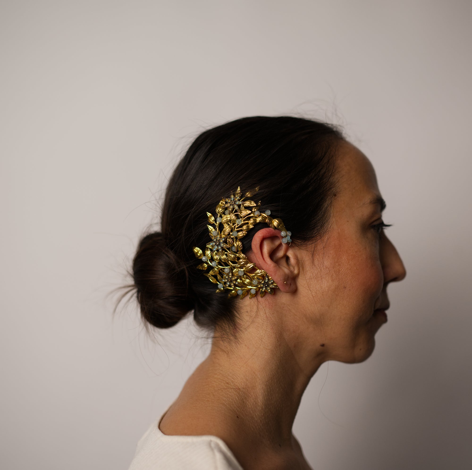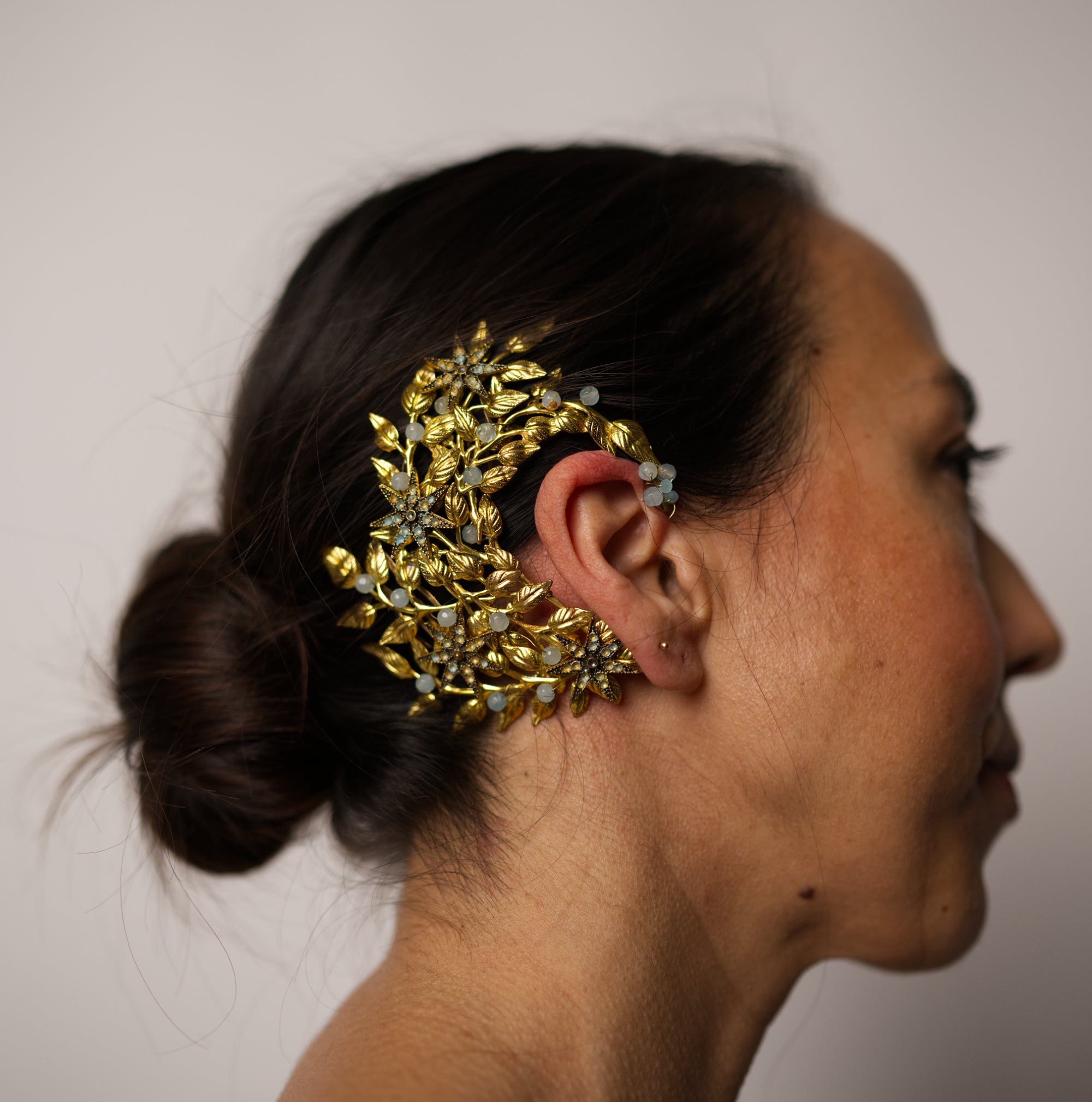 Ilse es una pieza joya artesanal, tipo earcuff o trepador, diseñada para aportar un toque original y sofisticado al look. Está compuesto por un delicado ramaje joya en tono dorado, adornado con cuentas de cristal y estrellas, creando un diseño luminoso y elegante.