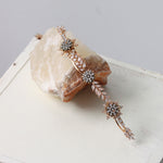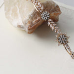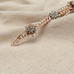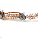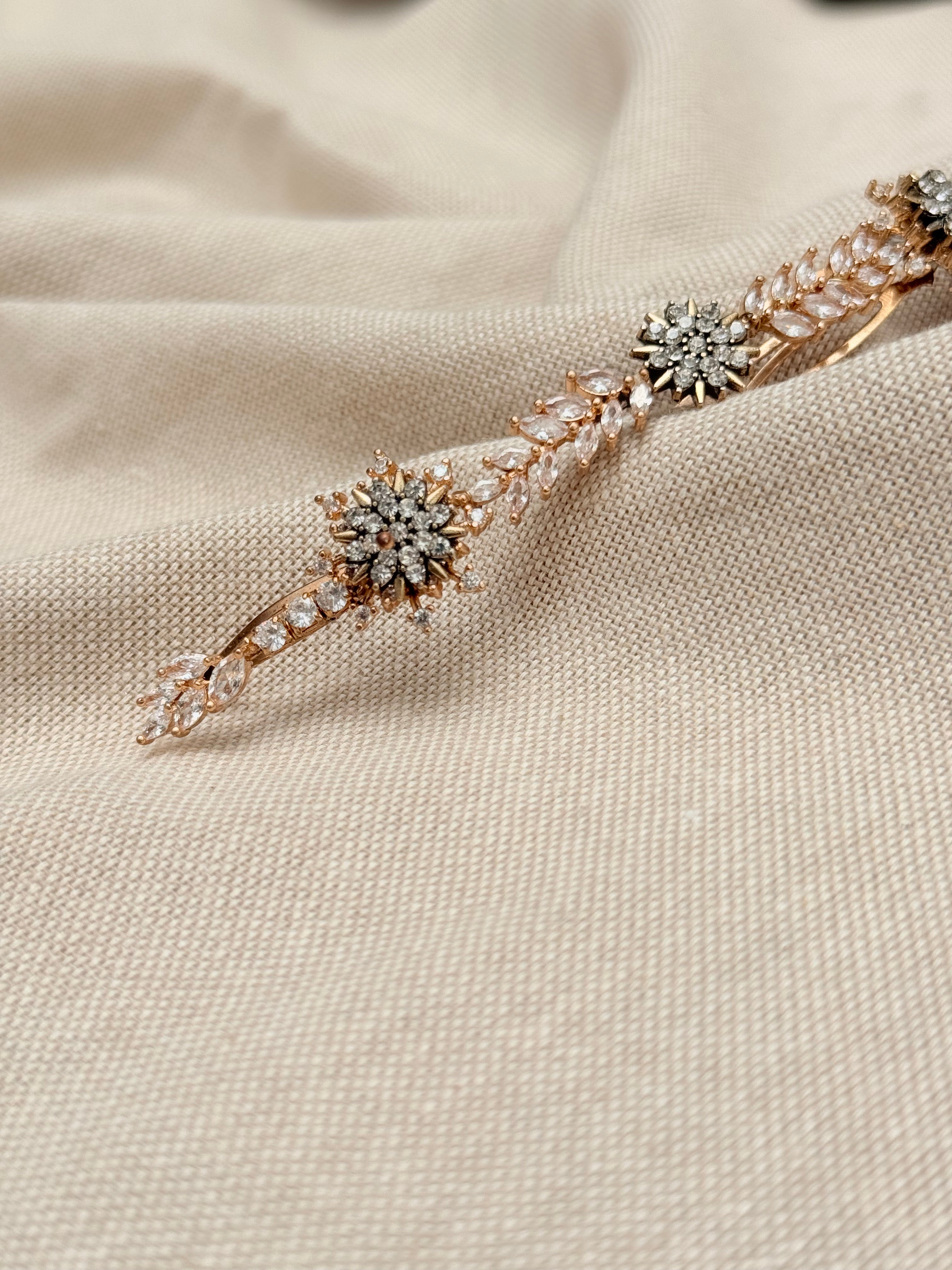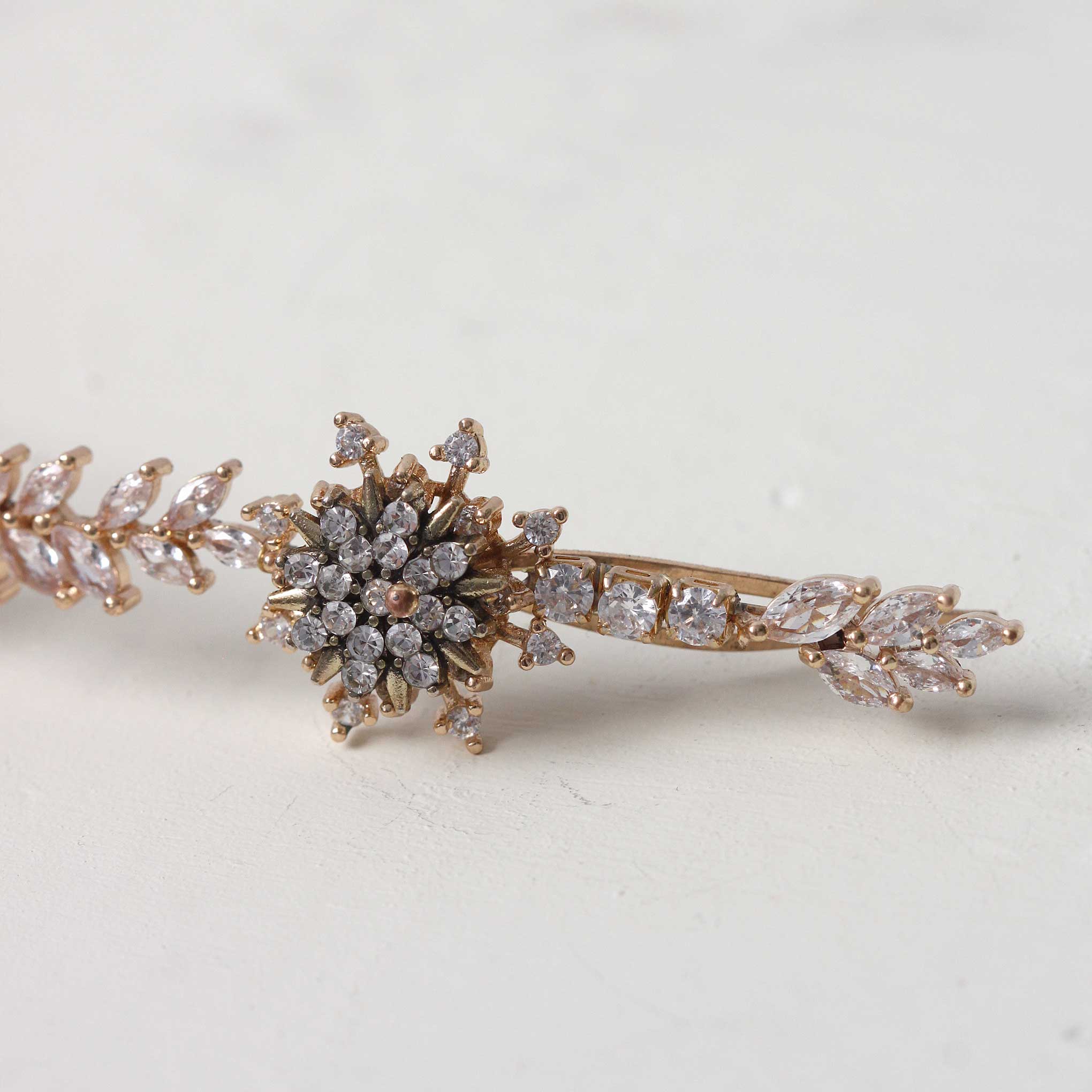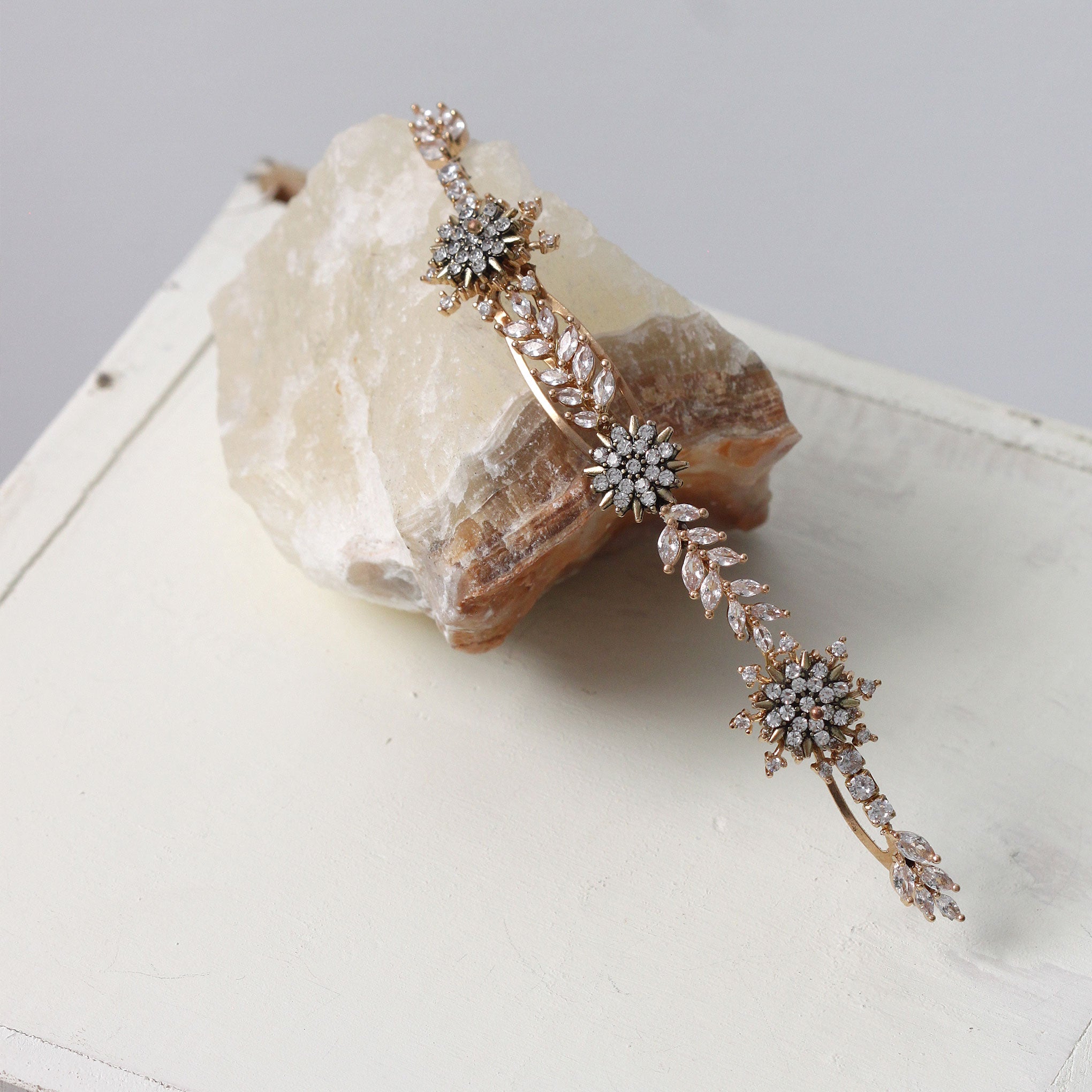 Delicado y único, este mini cubre raíz está diseñado y fabricado a mano con mimo artesanal. Su estructura en metal dorado rosado sirve de base para un entramado de ramas en cristales que evocan la naturaleza, acompañadas de pequeñas estrellas empedradas que aportan un brillo sutil y elegante.