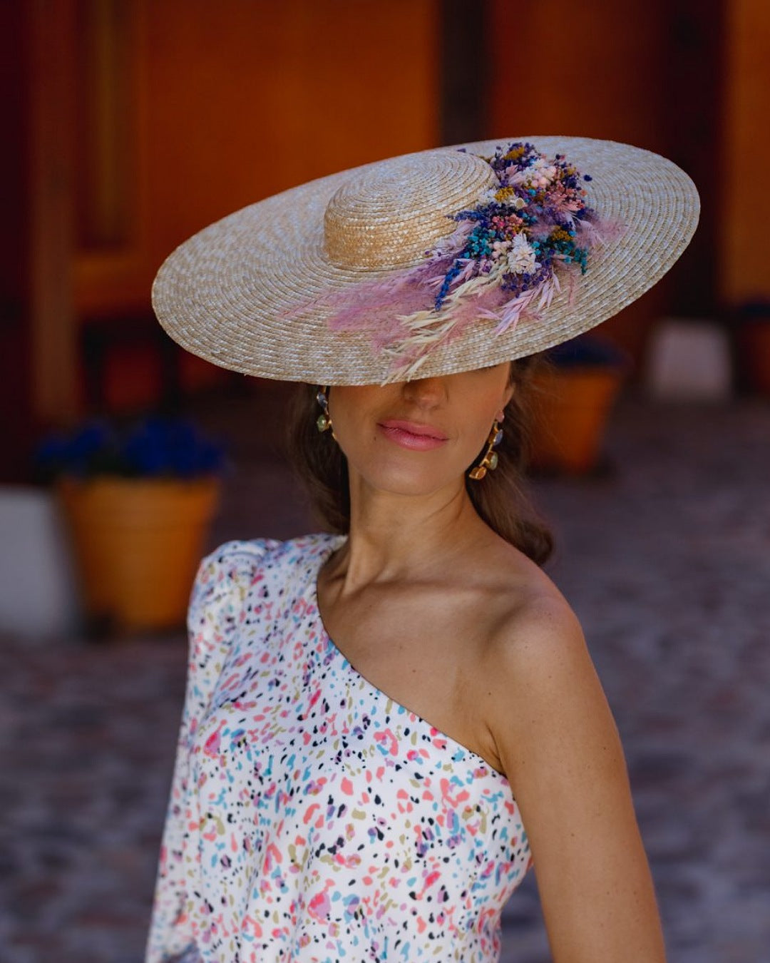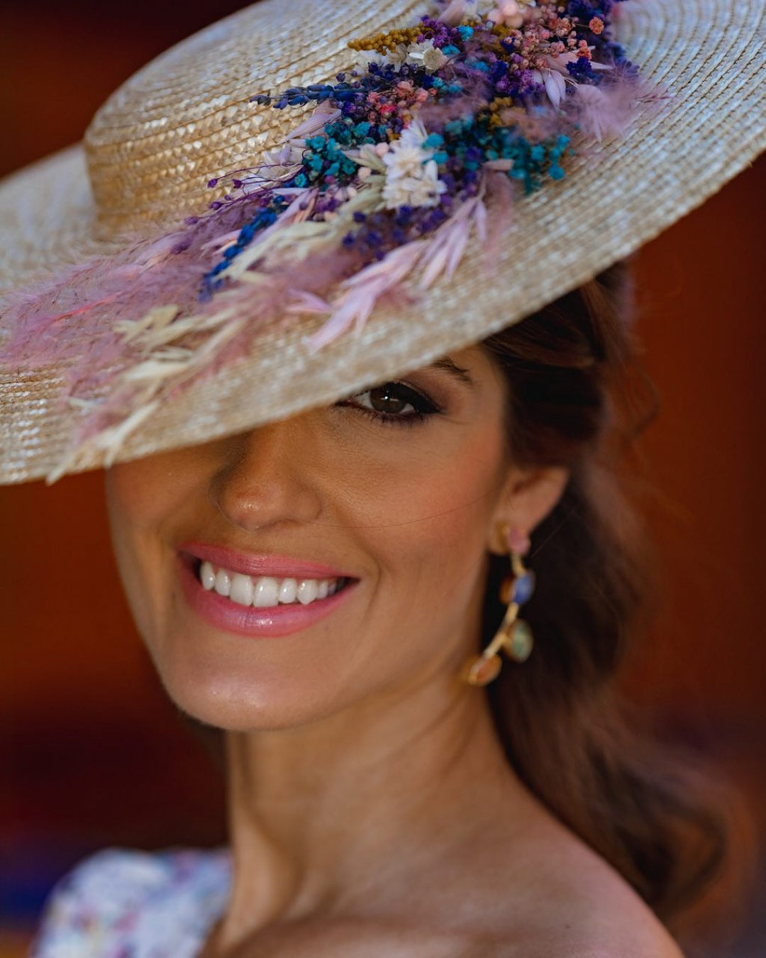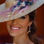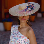 Pamela totalmente elaborada a mano de manera artesanal con una preciosa base natural, decorada con piezas flores naturales preservadas. Para adaptarla a la cabeza, le hemos puesto una diadema metálica súper cómoda para que la sujeción sea total.