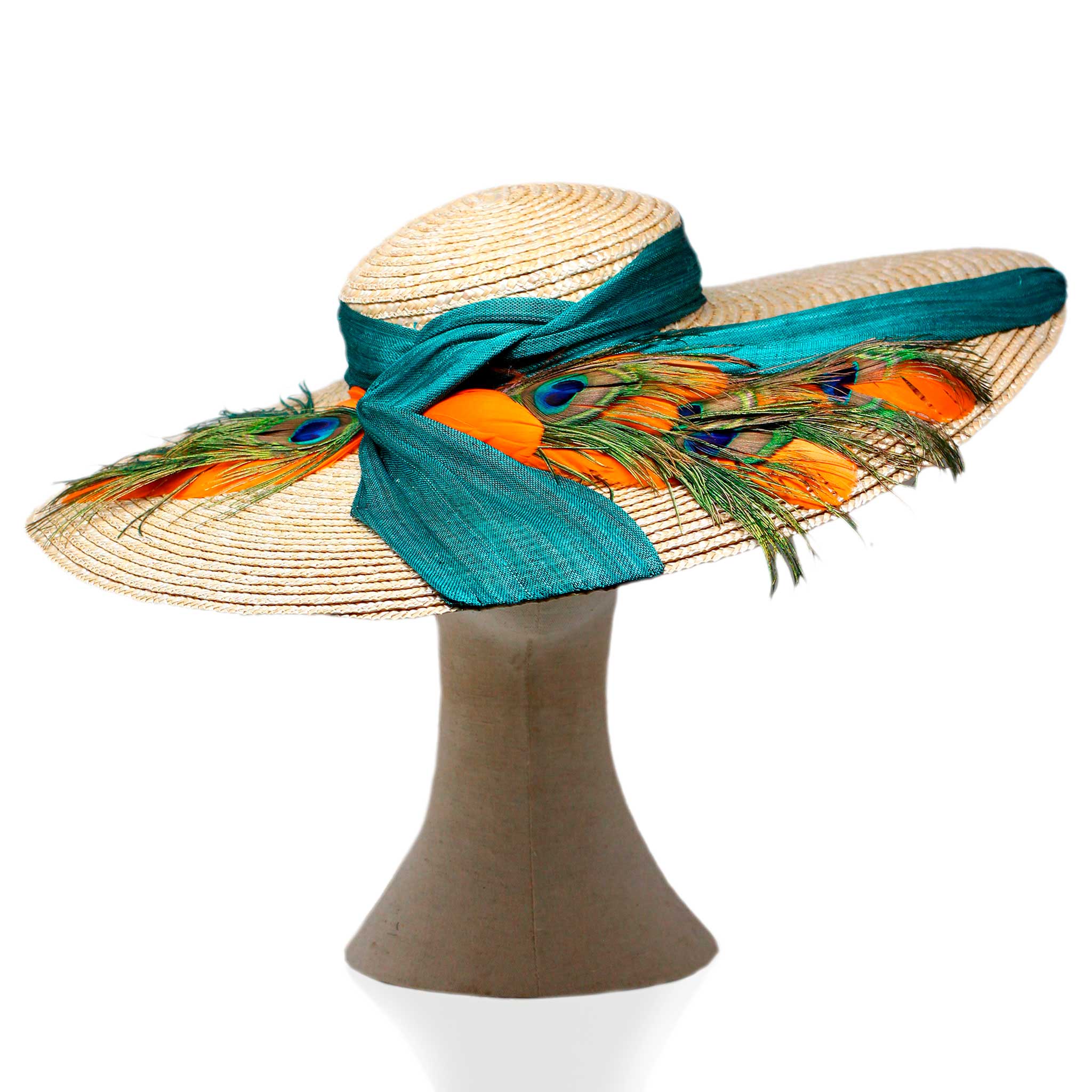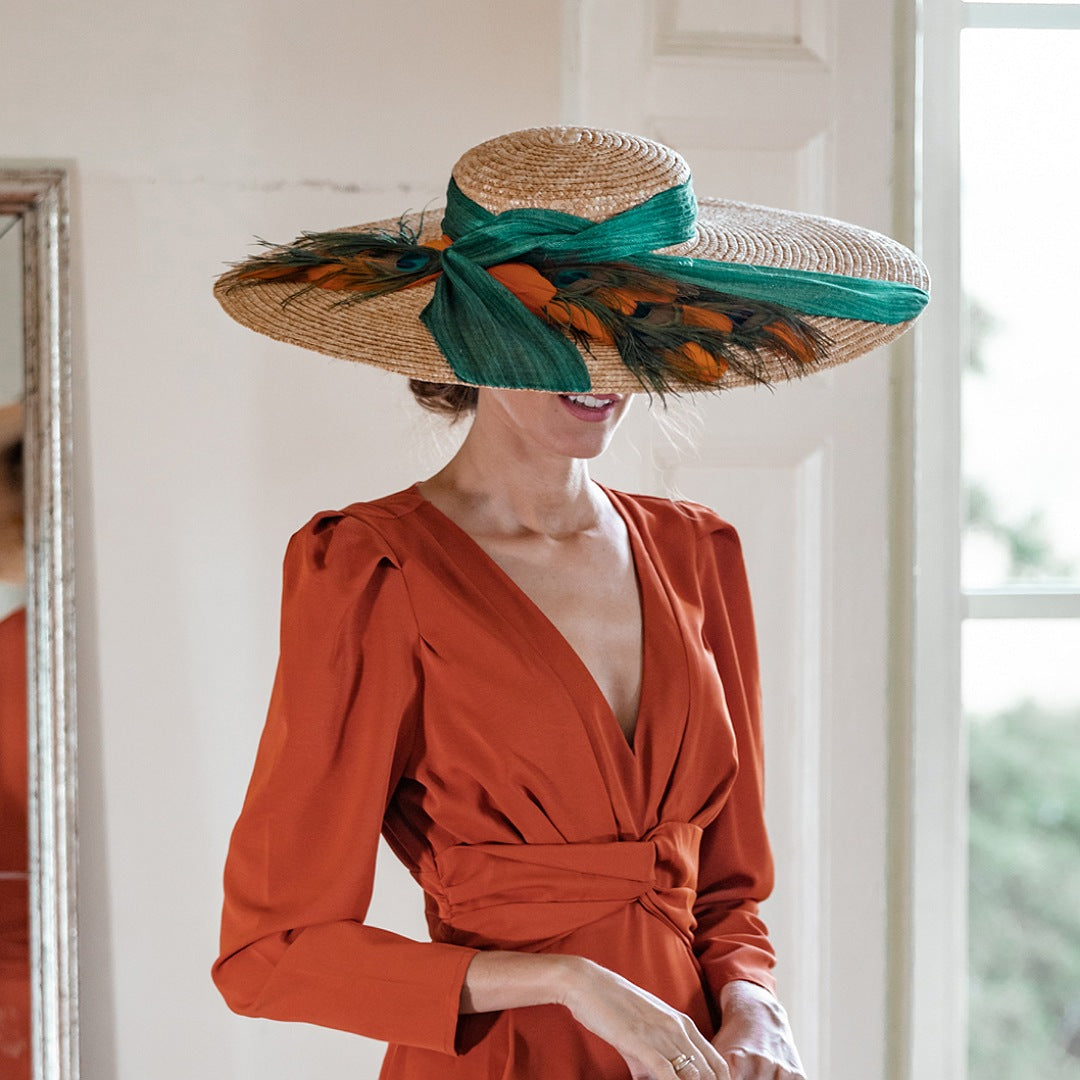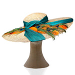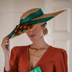 Pamela totalmente elaborada de manera artesanal en  tonos naranjas y verdes acompañado de una gran lazada de sinamay en color verde también.