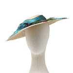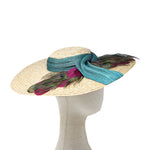 Pamela totalmente elaborada de manera artesanal en  tonos naranjas y verdes acompañado de una gran lazada de sinamay en color verde también.