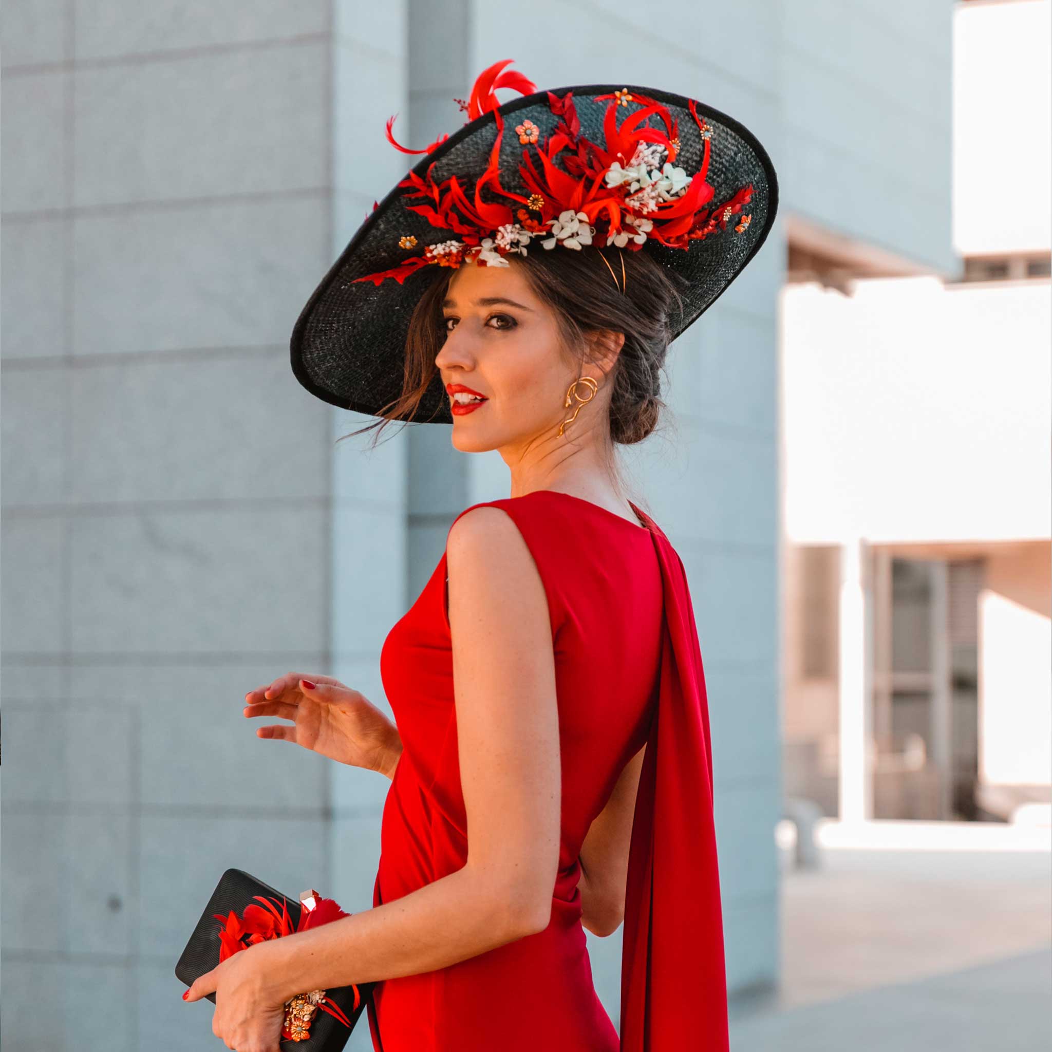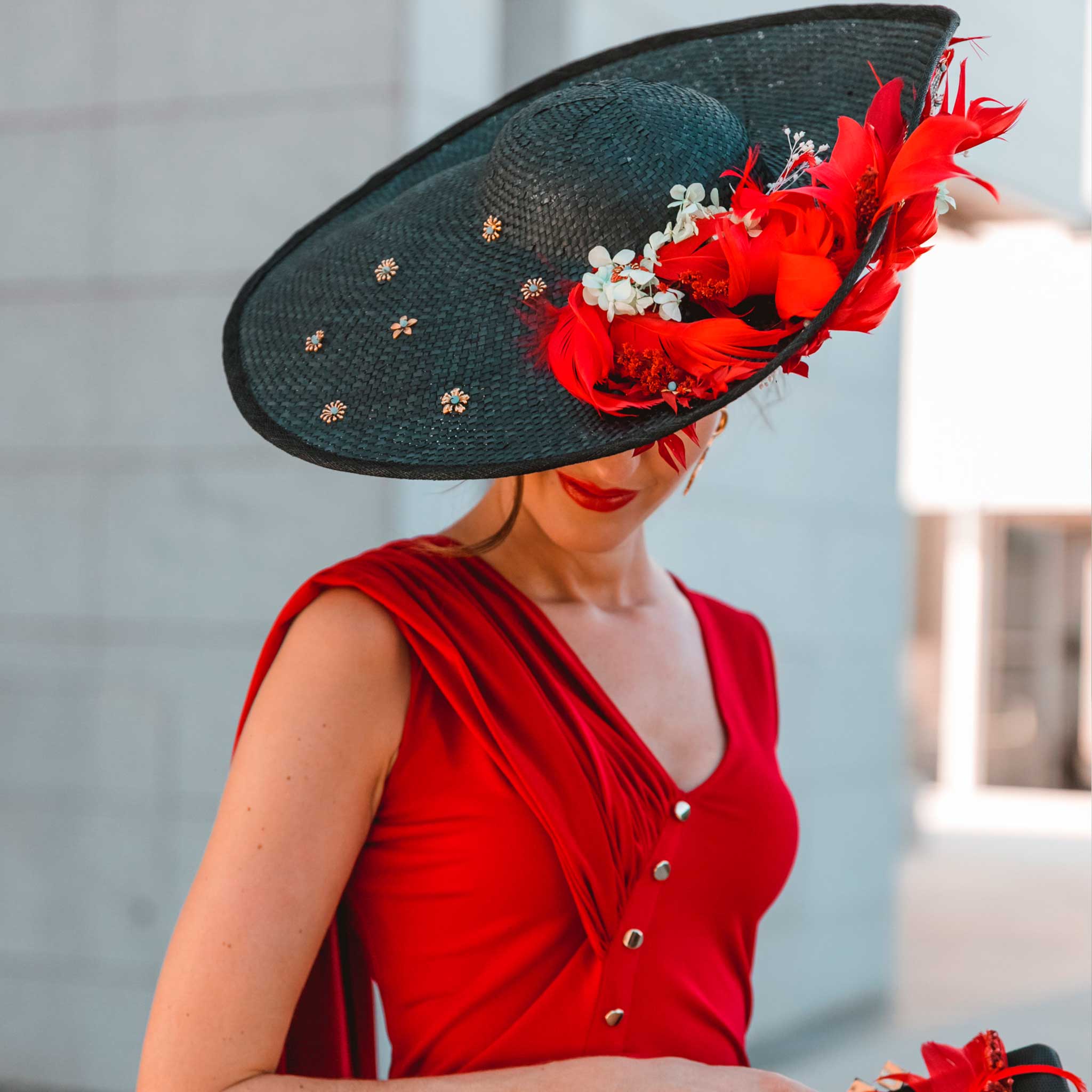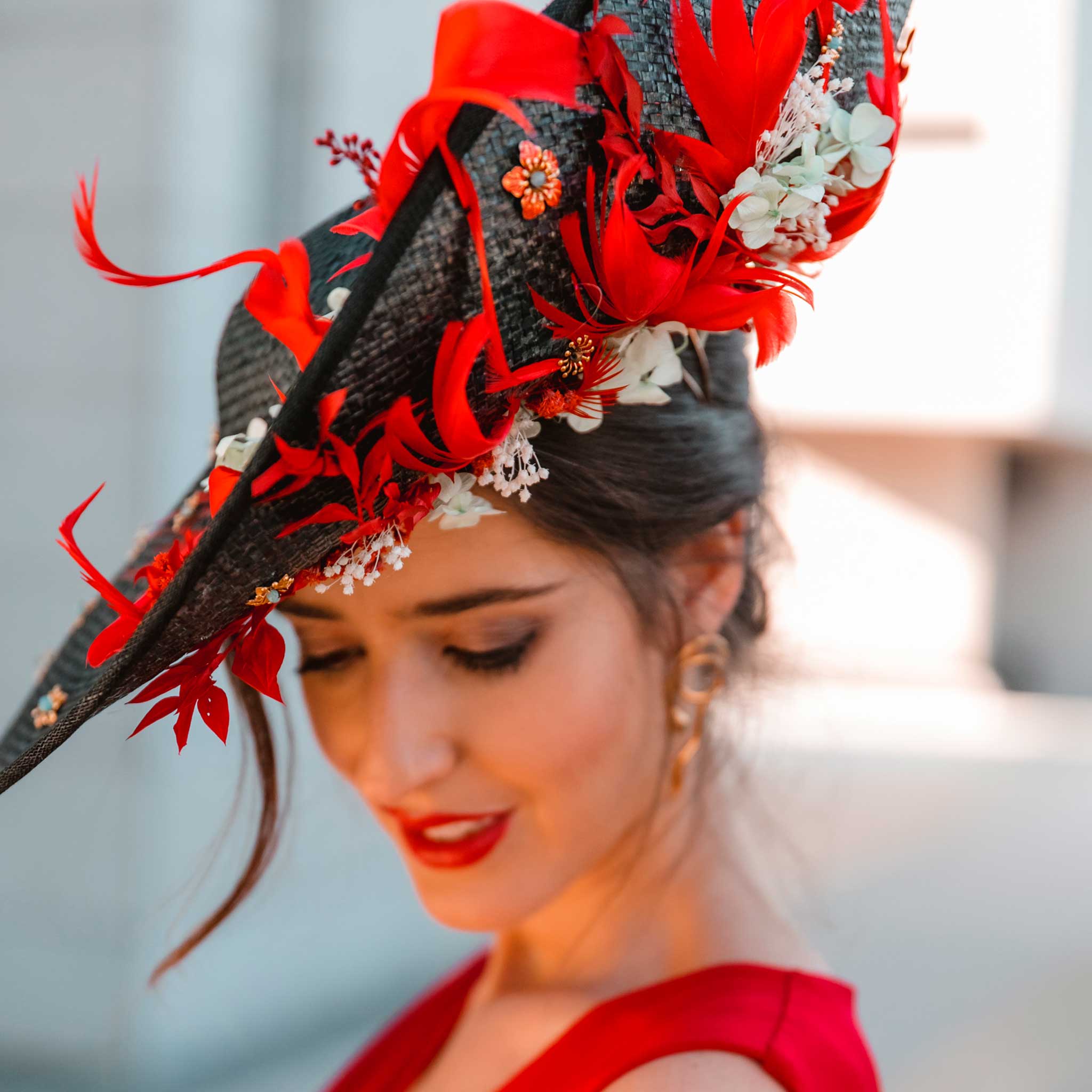 Pamela totalmente elaborada a mano con una base negra de ala ancha con detalles en pluma roja, flores naturales preservadas y joyas