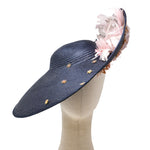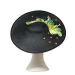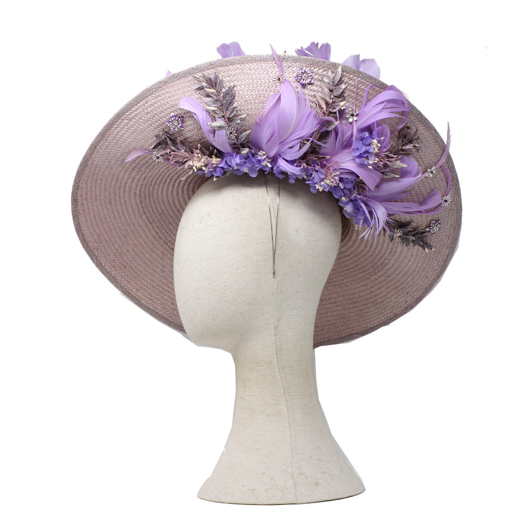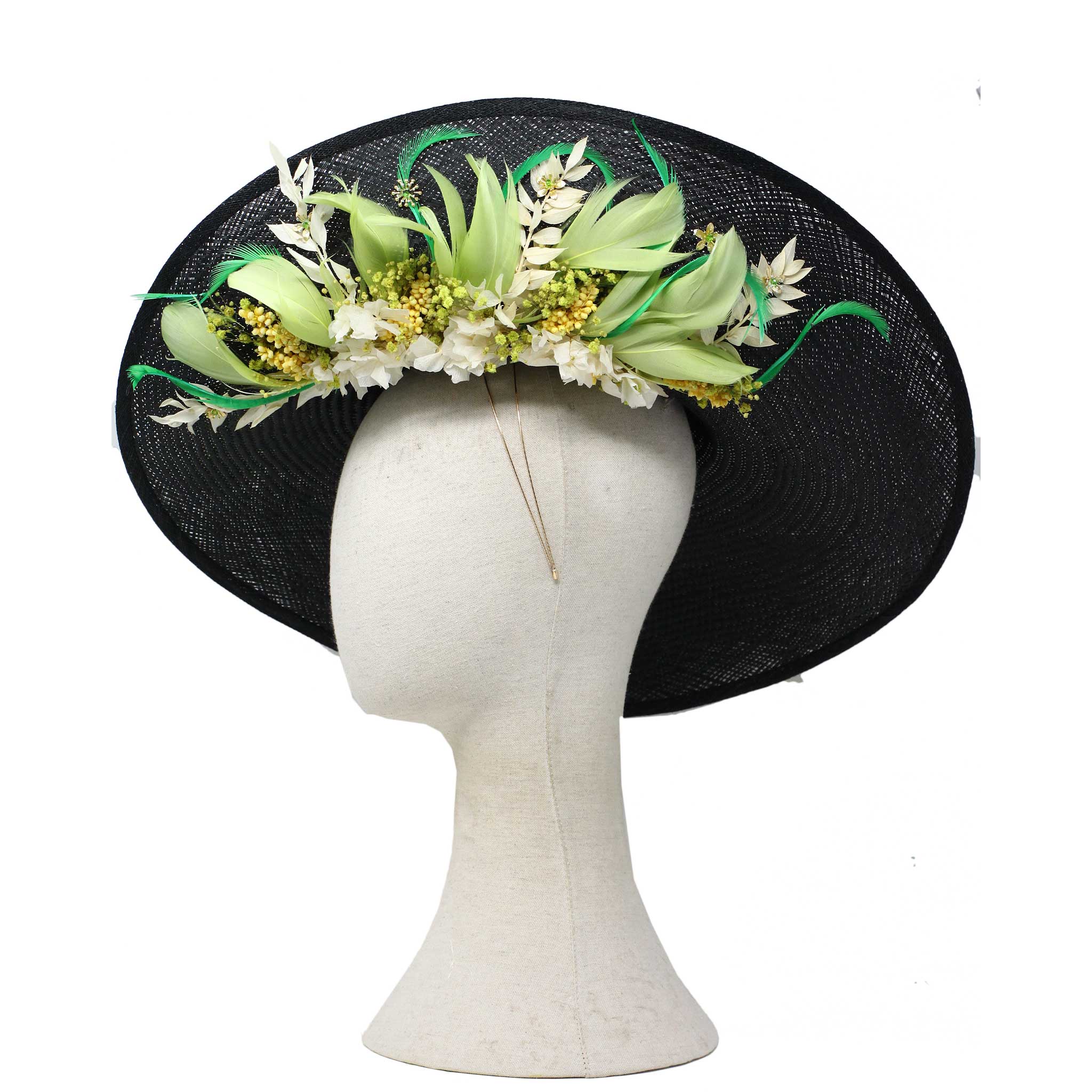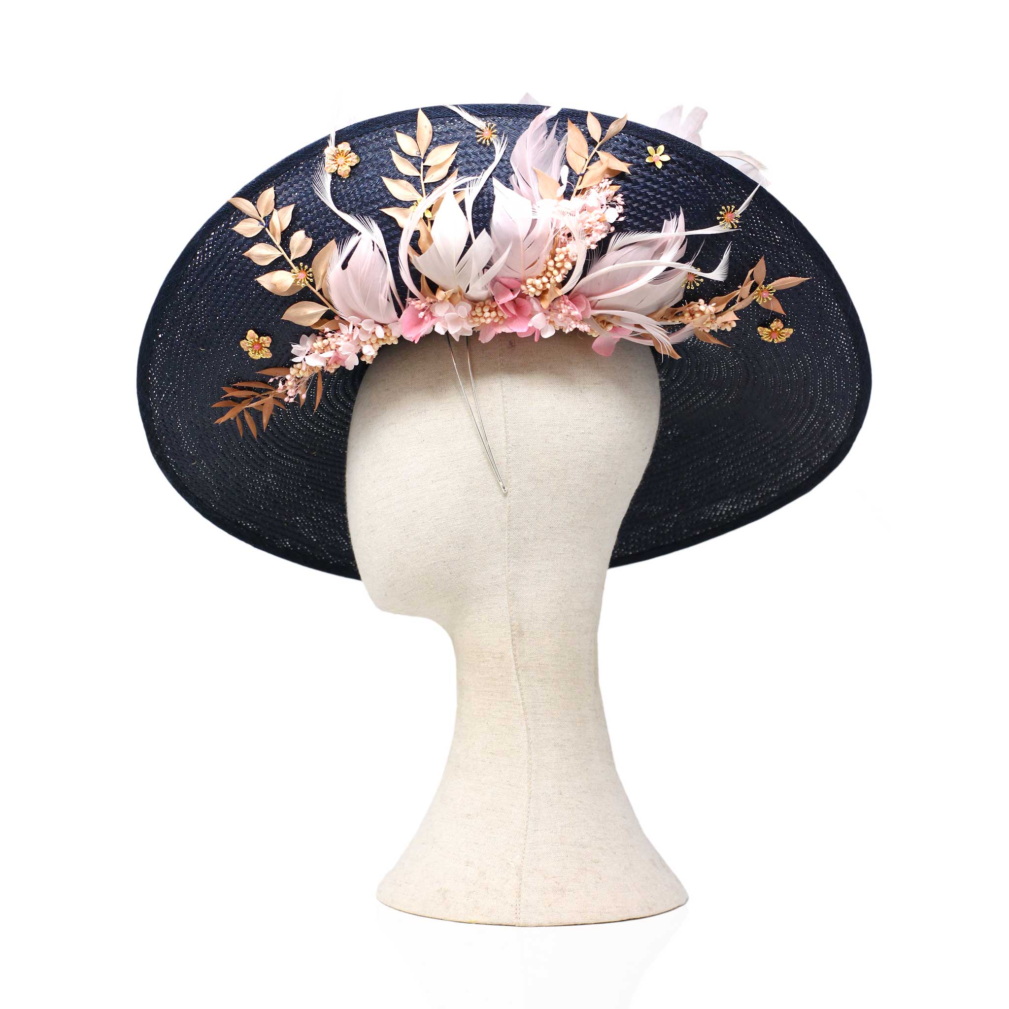 Pamela totalmente elaborada a mano con una base negra de ala ancha con detalles en pluma roja, flores naturales preservadas y joyas