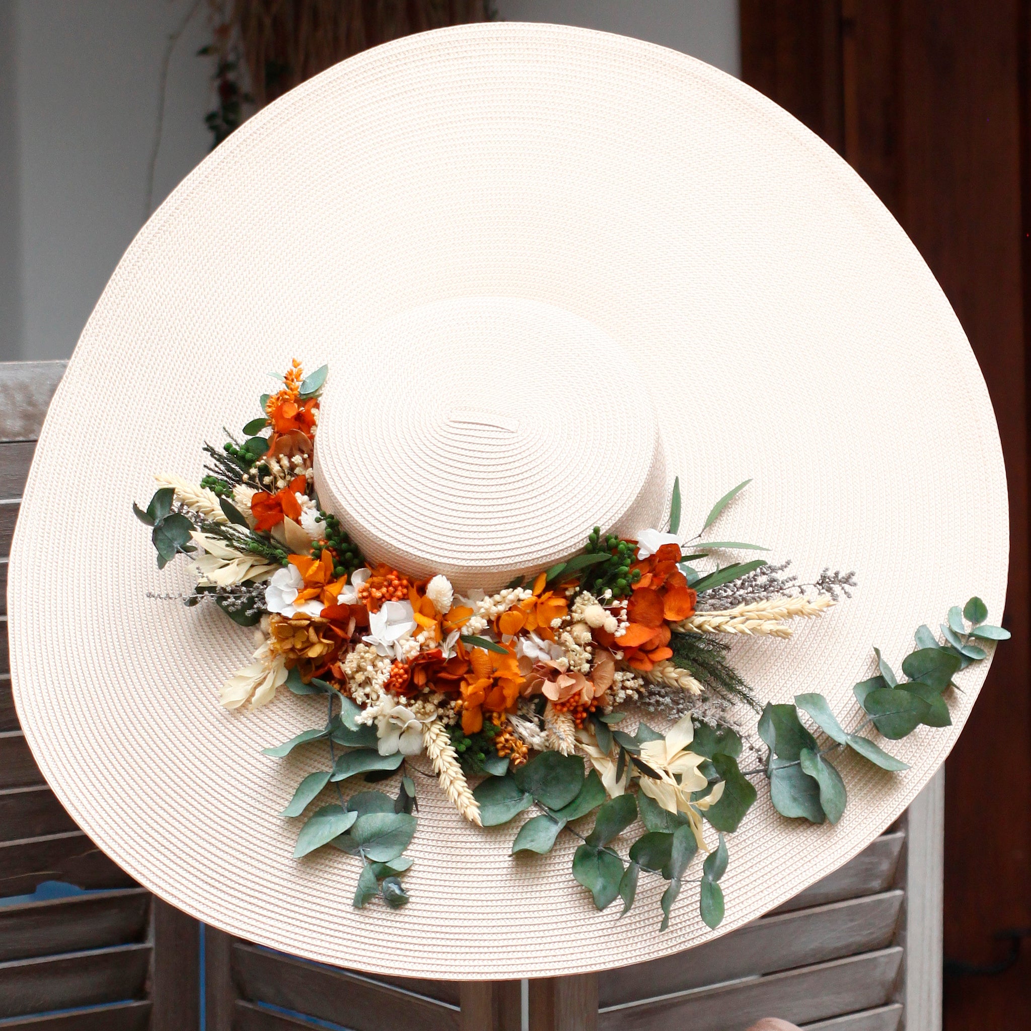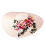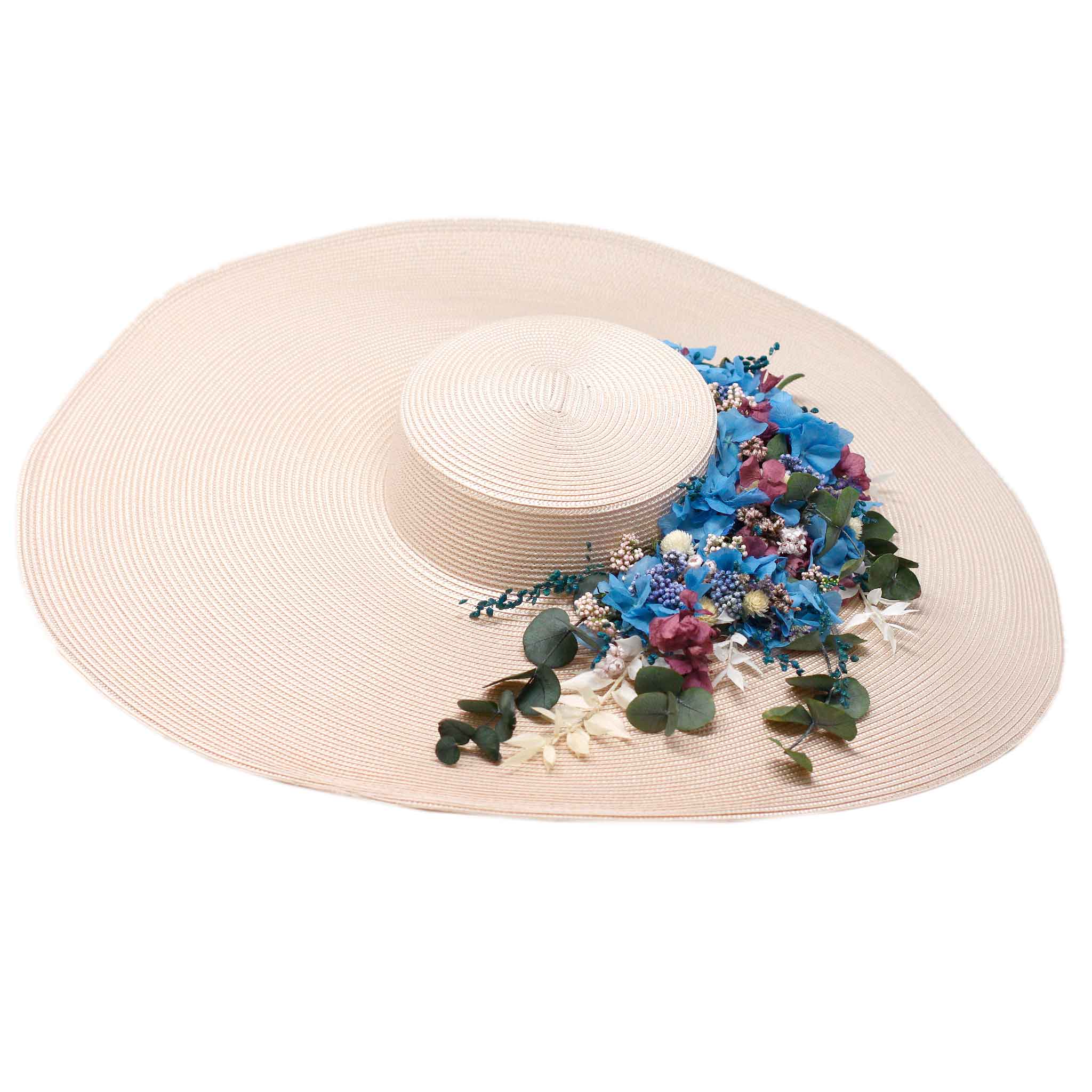 Pamela de ala ancha en tono champán o beige decorada a mano con una variedad de flores y hojas naturales preservadas.