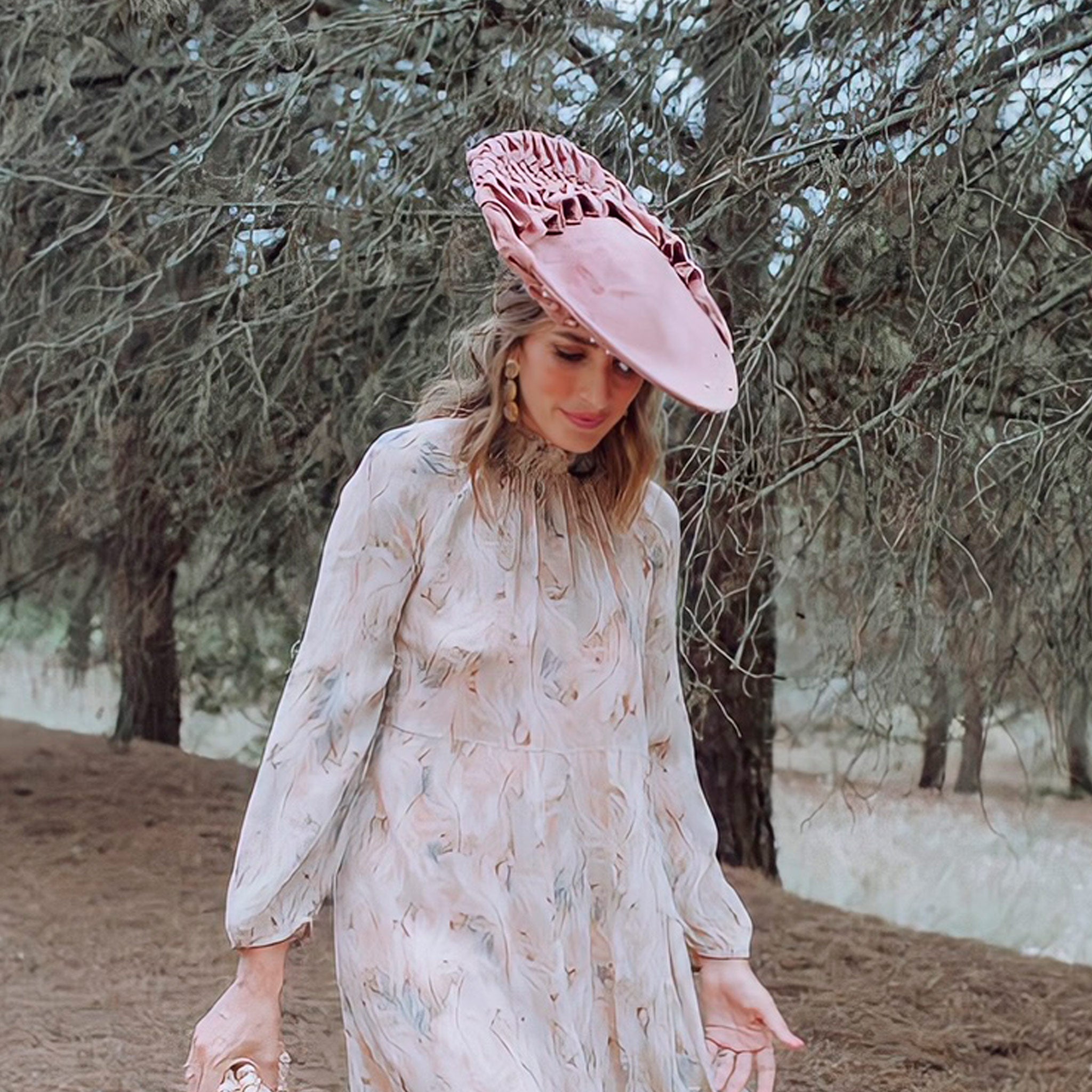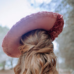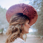 Pamela totalmente elaborada de manera artesanal recubierta de una delicada tela de terciopelo con un efecto fruncido en uno de sus laterals y detalles joyas por la parte inferior.