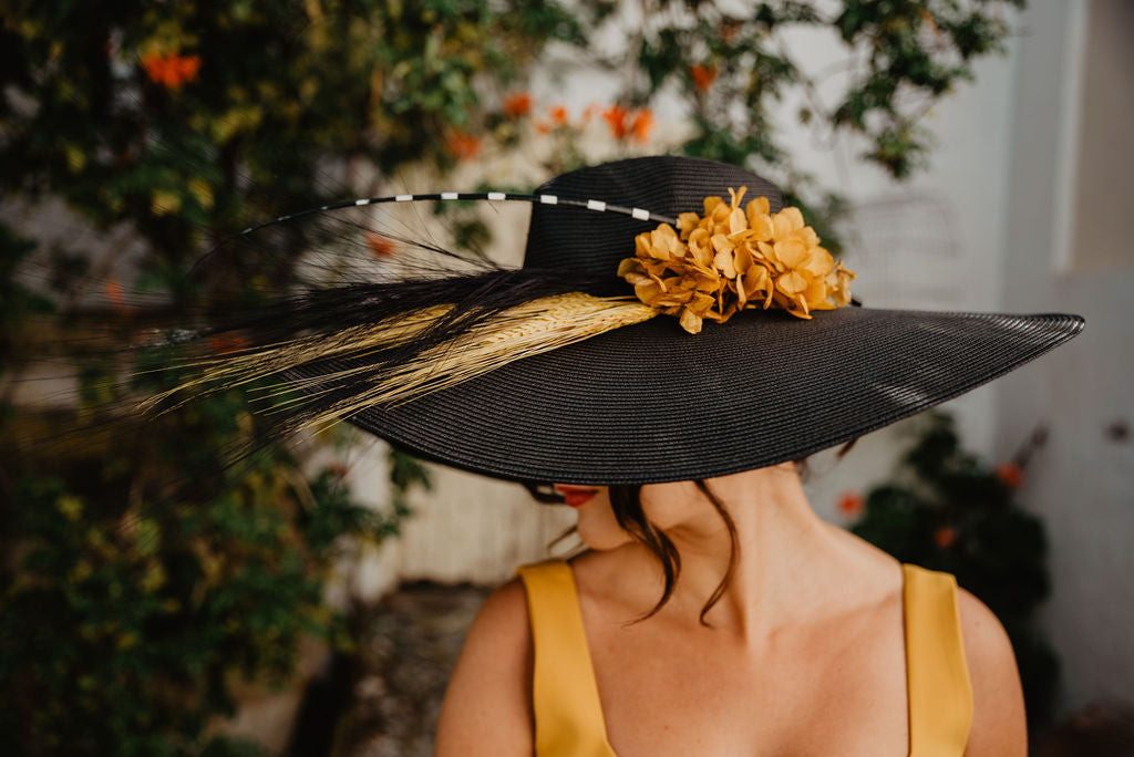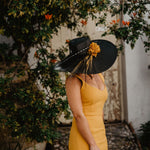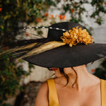 Pamela totalmente elabora a mano de ala ancha con base negra, decorada con raquis bicolor, y decoración floral en tonos naturales.