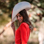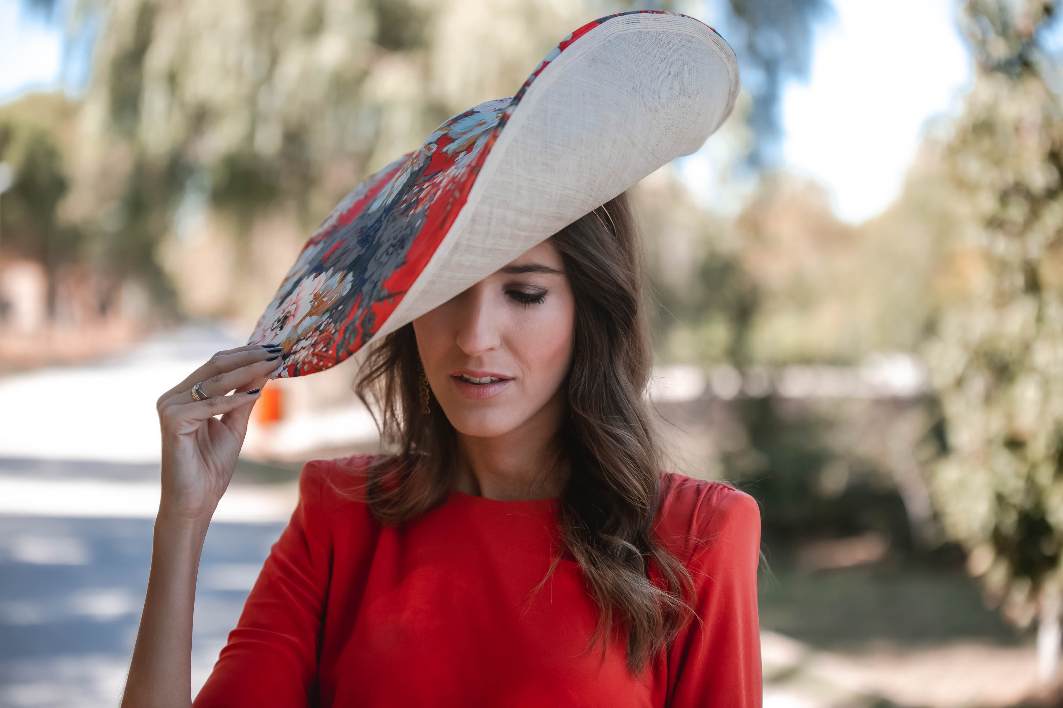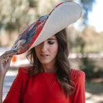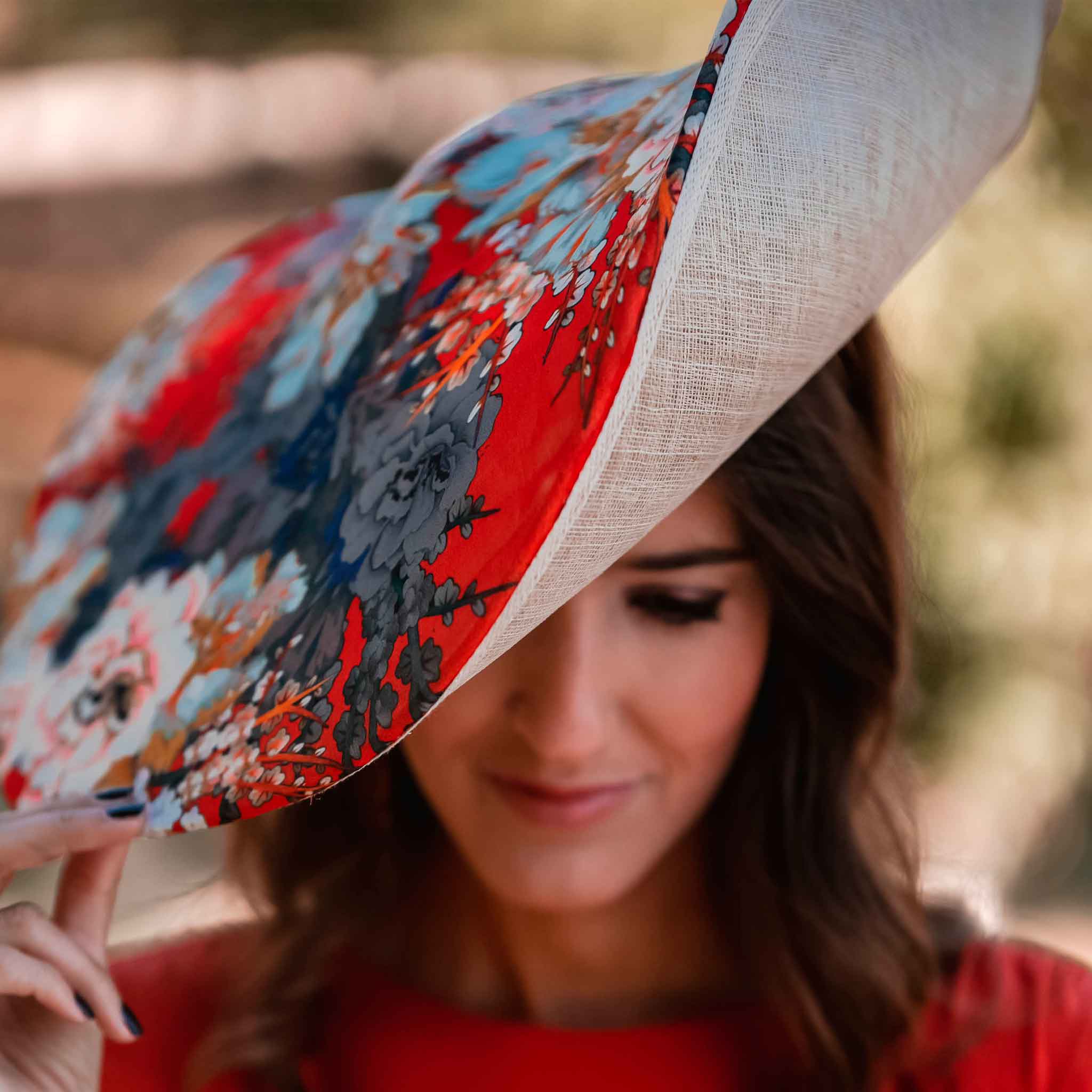 Pamela estilo plato decorada con una preciosa tela de estampado. Esta pieza es ideal para dar el toque final a un look sencillo. Su caída lateral es muy favorecedora.