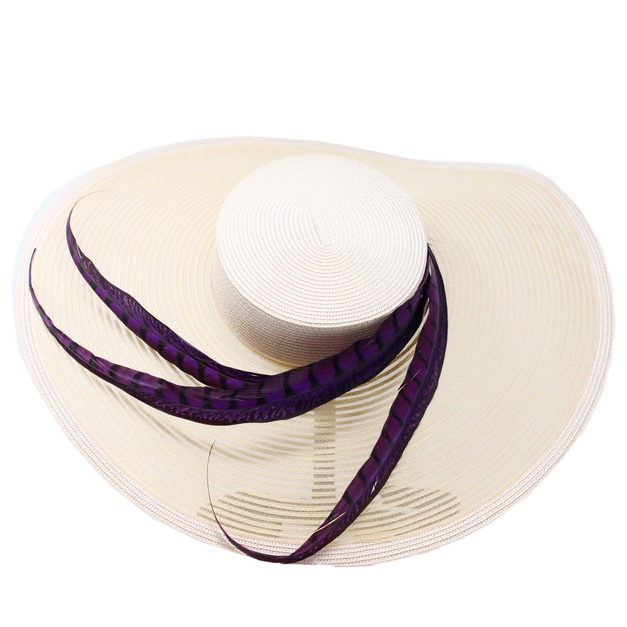 Pamela totalmente elaborada a mano con base en crudo decorada con plumas de color morado.