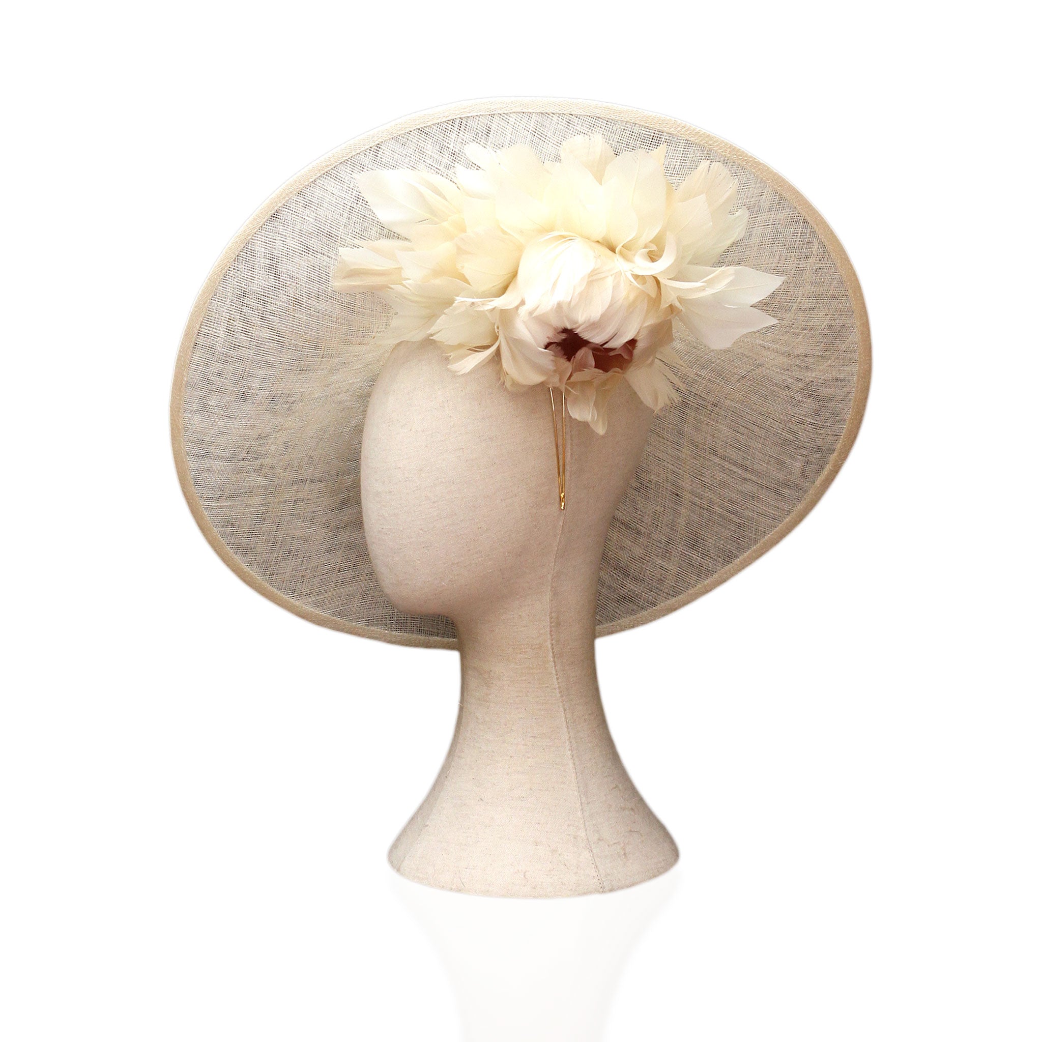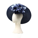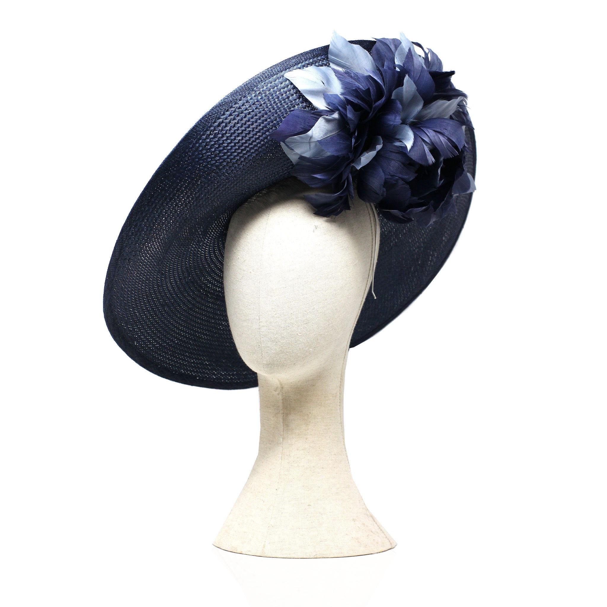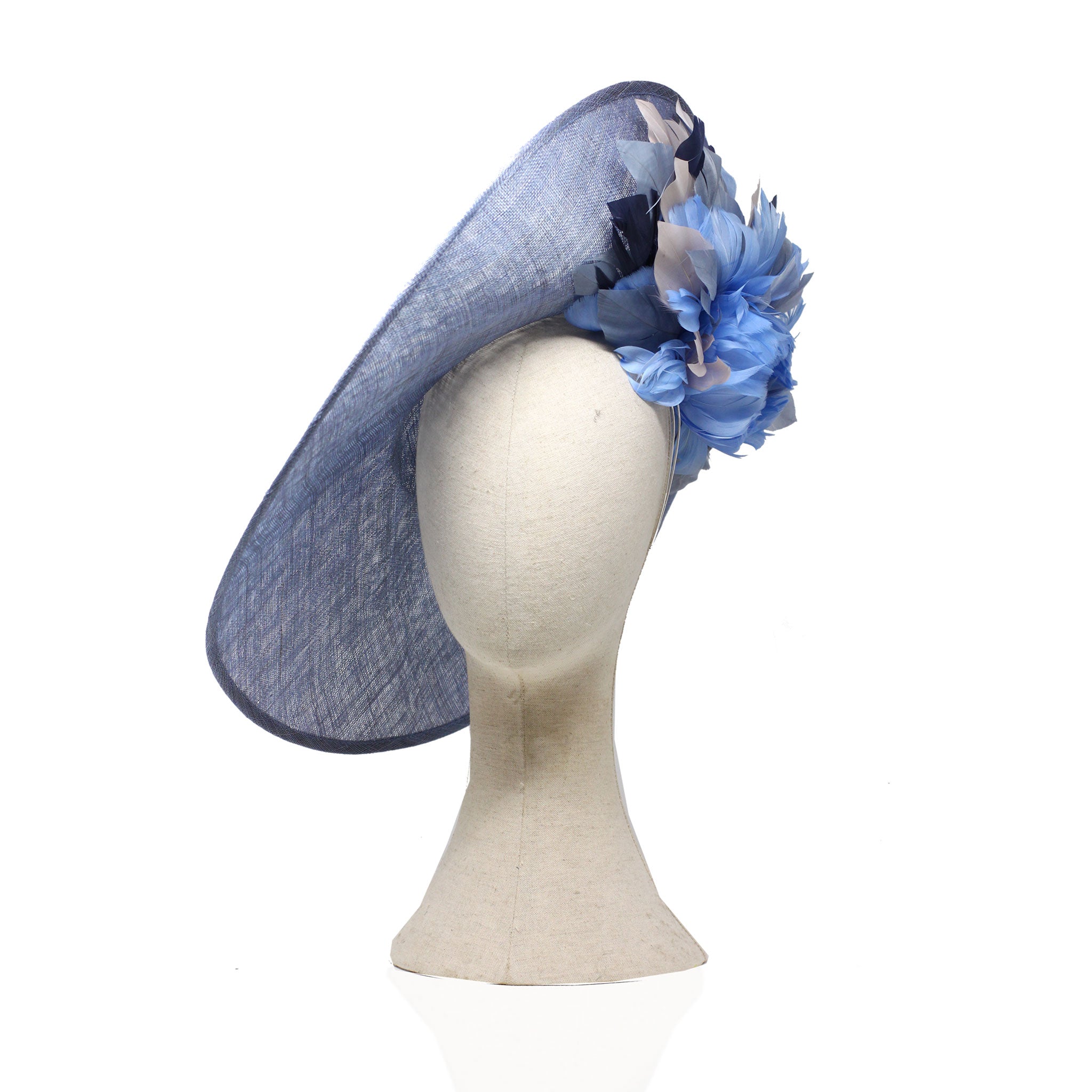 Pamela de ala alta que da altura además de estilizar, con una decoración de plumas formando una peonia con cascada de plumas den diferentes colores.