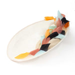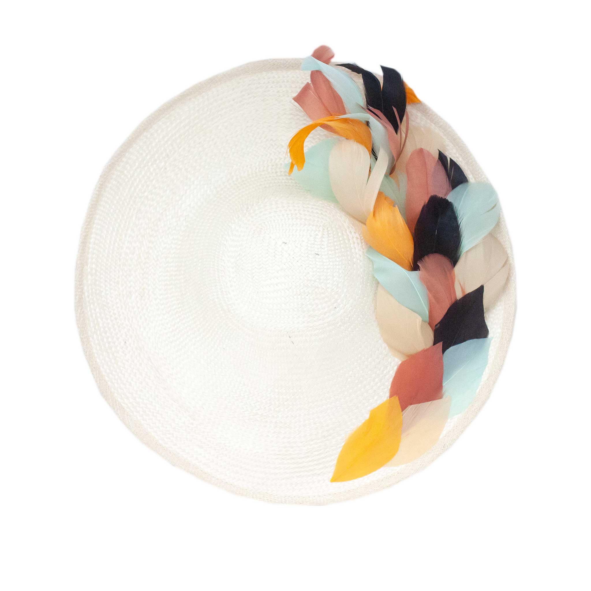 Pamela estilo plato totalmente elaborada a mano con base en tono crudo y decorada con plumas en diferentes tonalidades.
