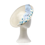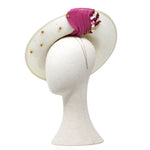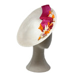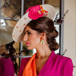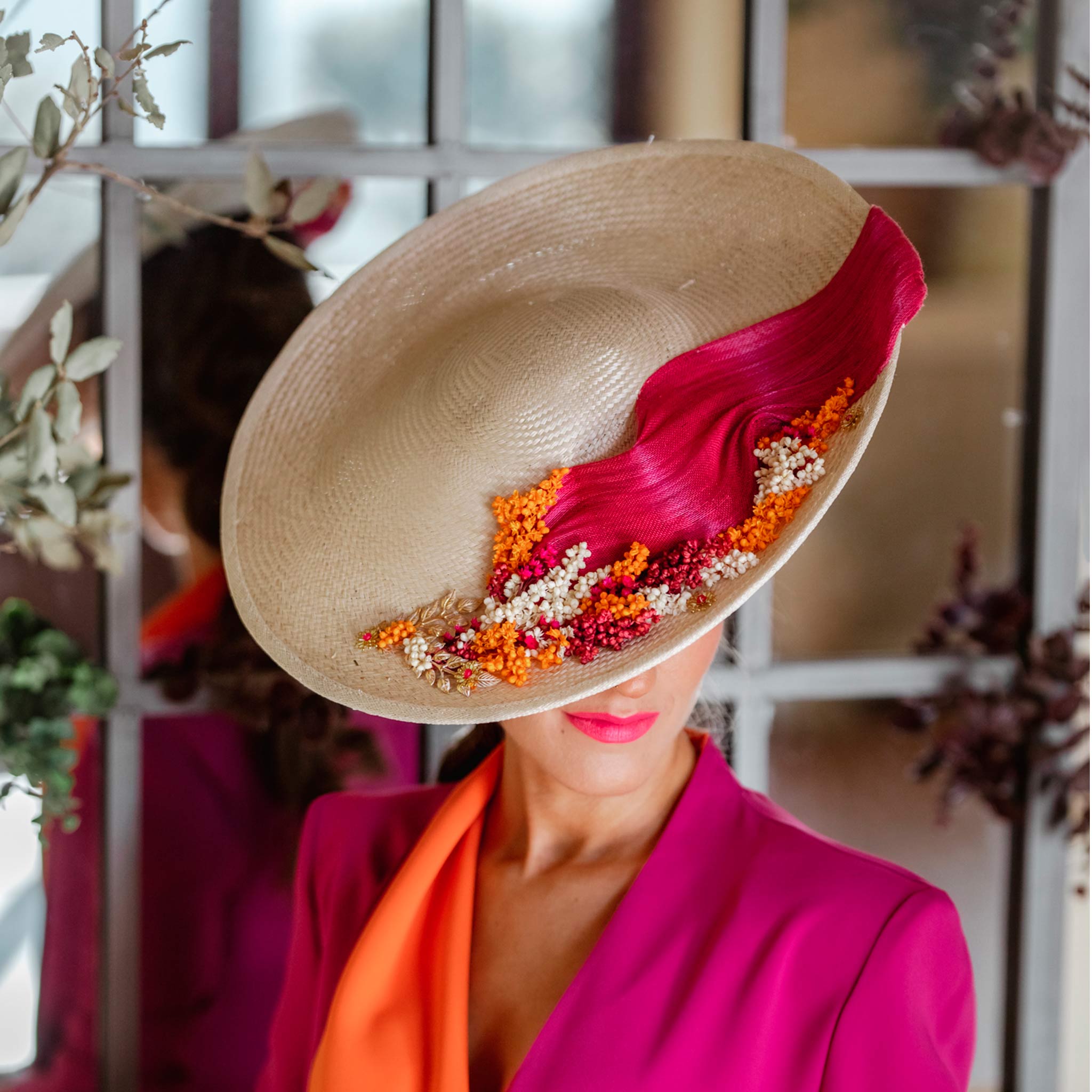 Pamela estilo plato decorada con flores naturales, detalles joya y seda de Sinamay en tonos naranjas y fucsia. Incorpora una diadema metálica para una mayor sujeción y comodidad