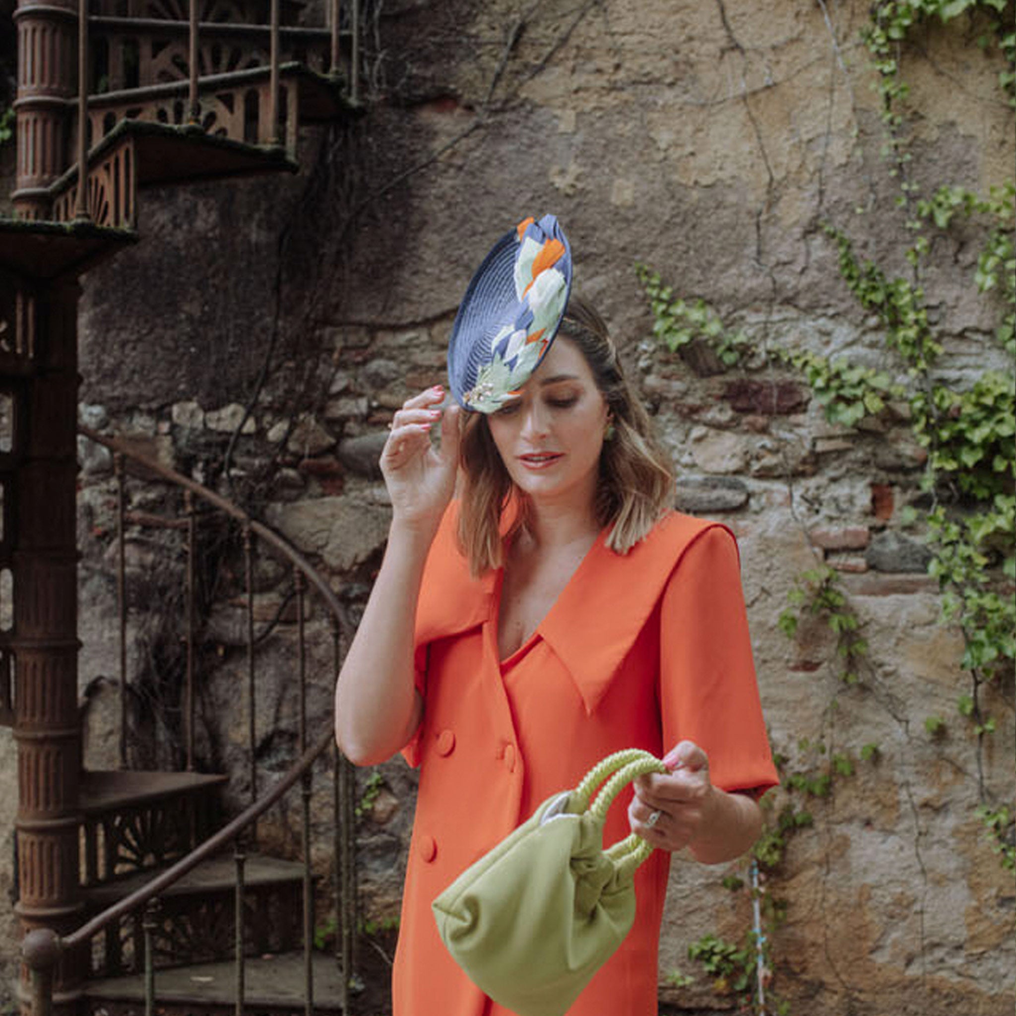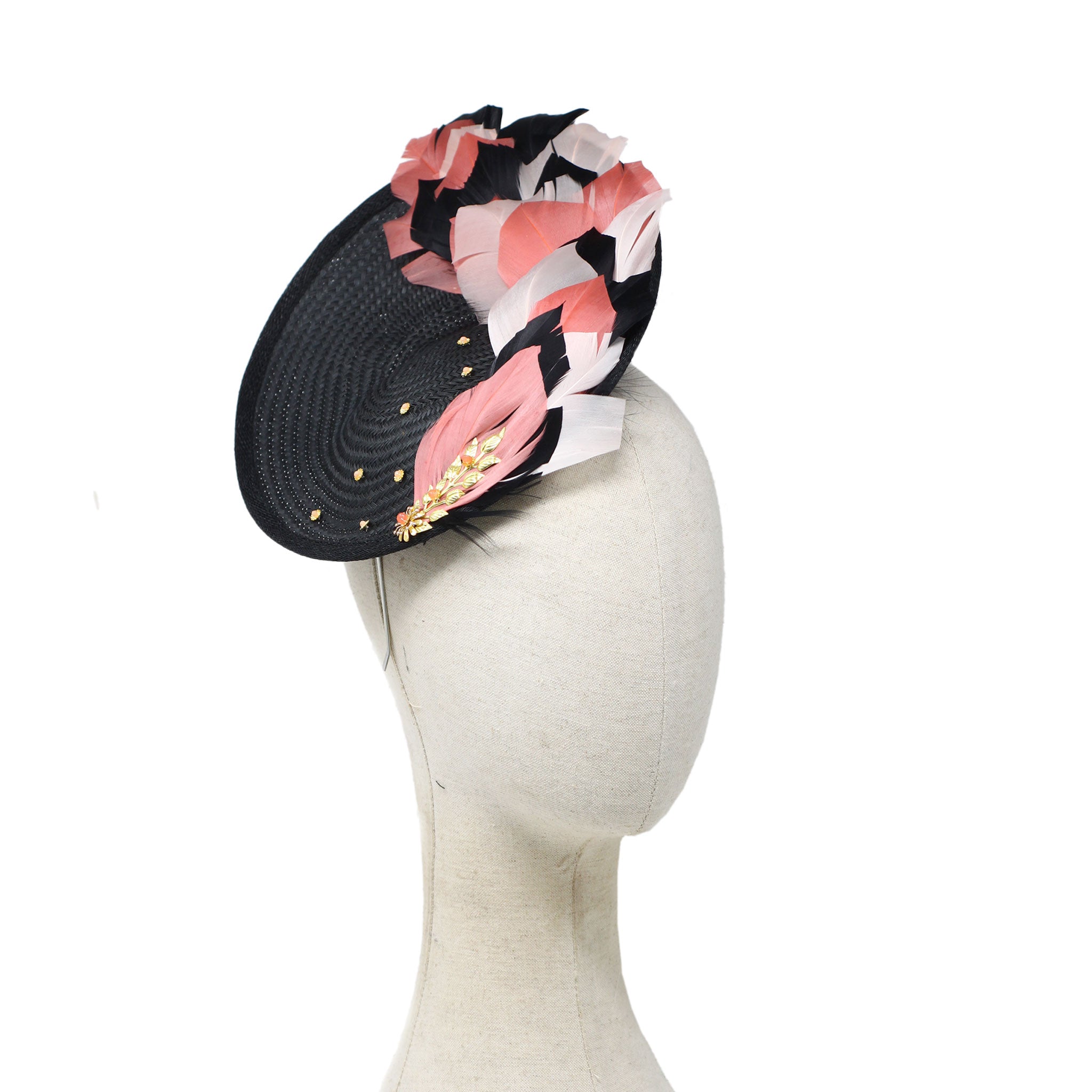 Pamela estilo plato con base azul marino decorada con plumas en diferentes colores. Terminada con pequeños broches joya, tanto en la parte superior como en la inferior, que añaden el toque final perfecto.