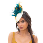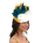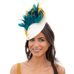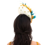 Pamela estilo plato con la base en tono crudo decorado con diferentes plumas en verde agua y mostaza. Terminado con un pequeños broches joya que añaden el toque final perfecto y una diadema metálica para ajustarla a la cabeza. Puedes escoger llevarlo con o sin un velo de tul con plumeti.