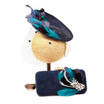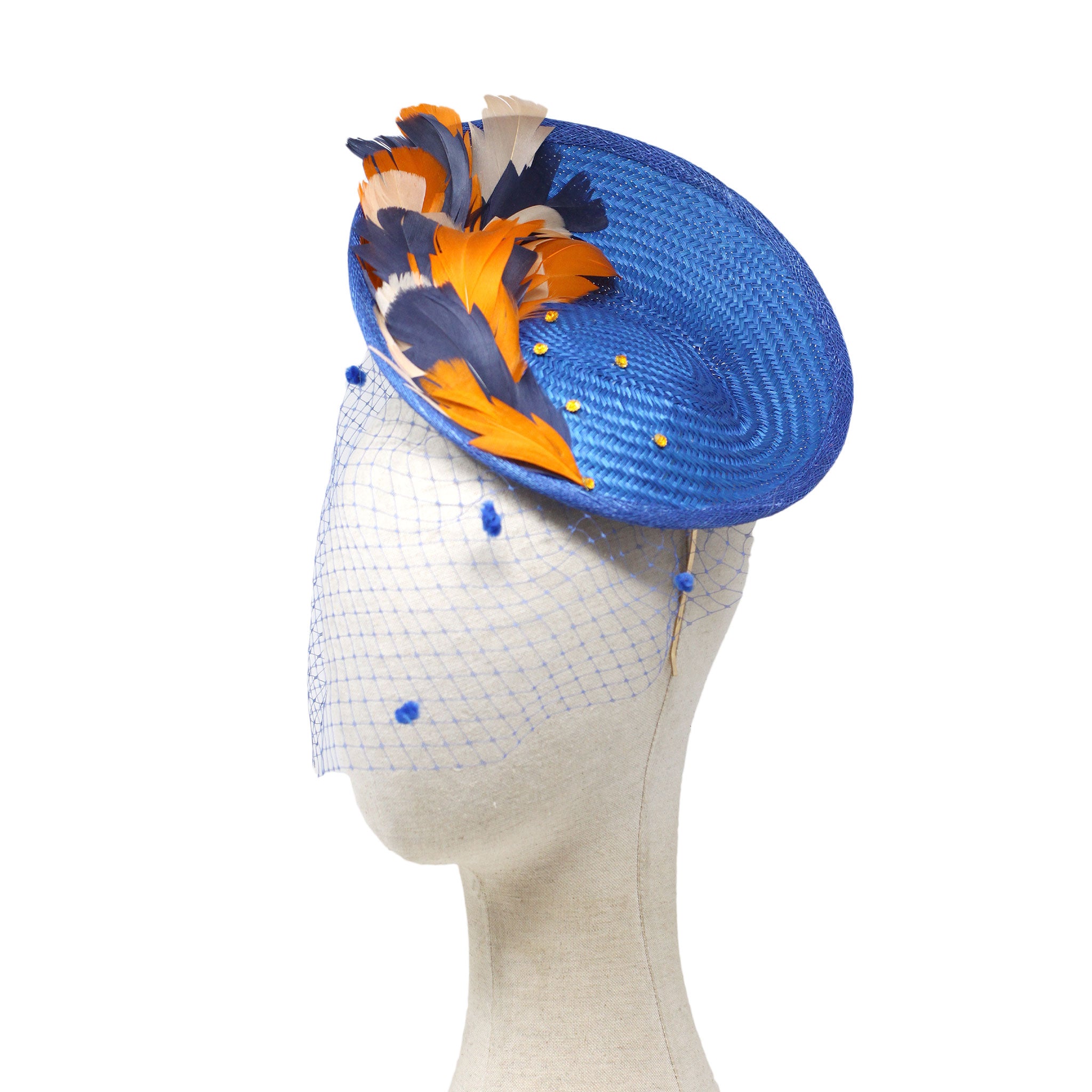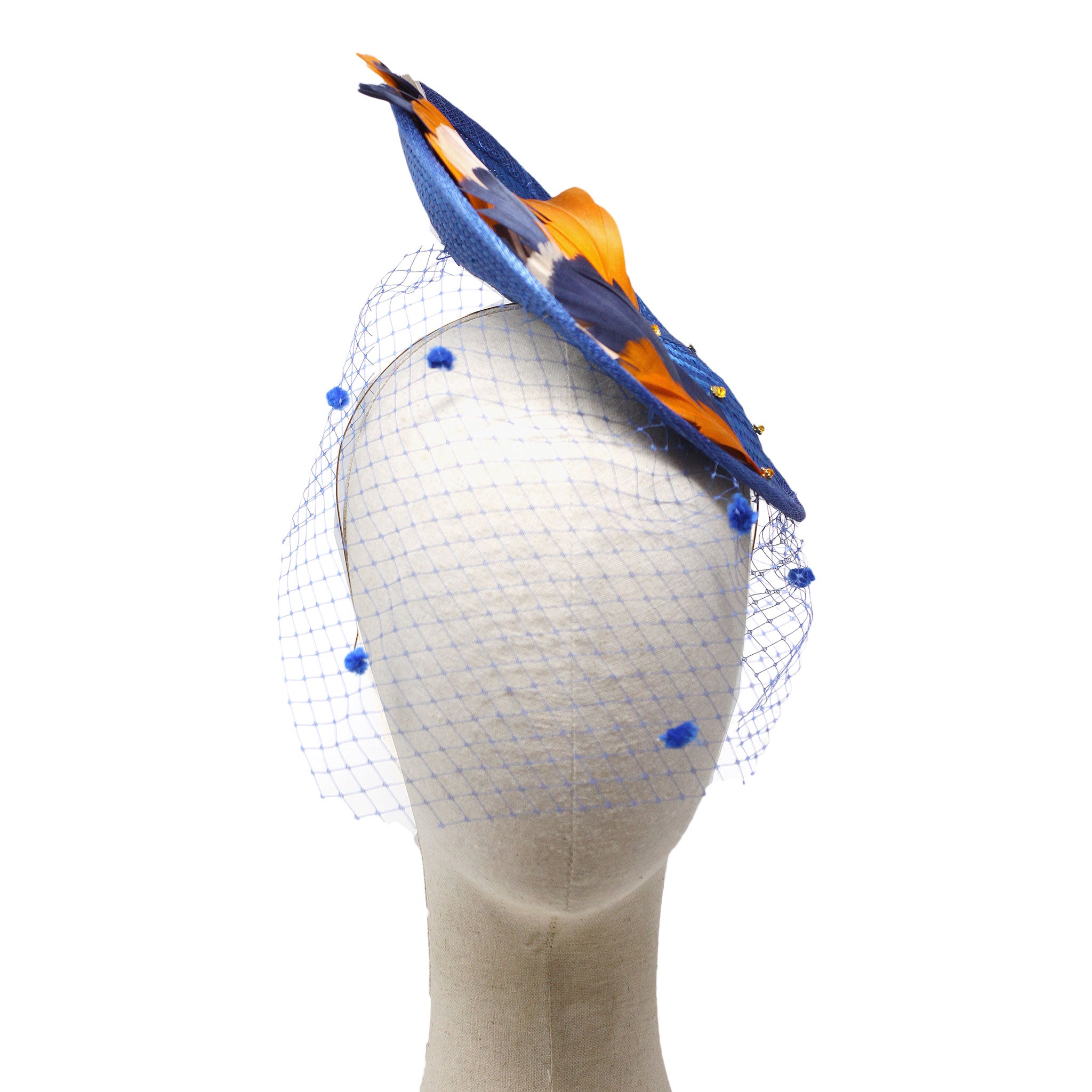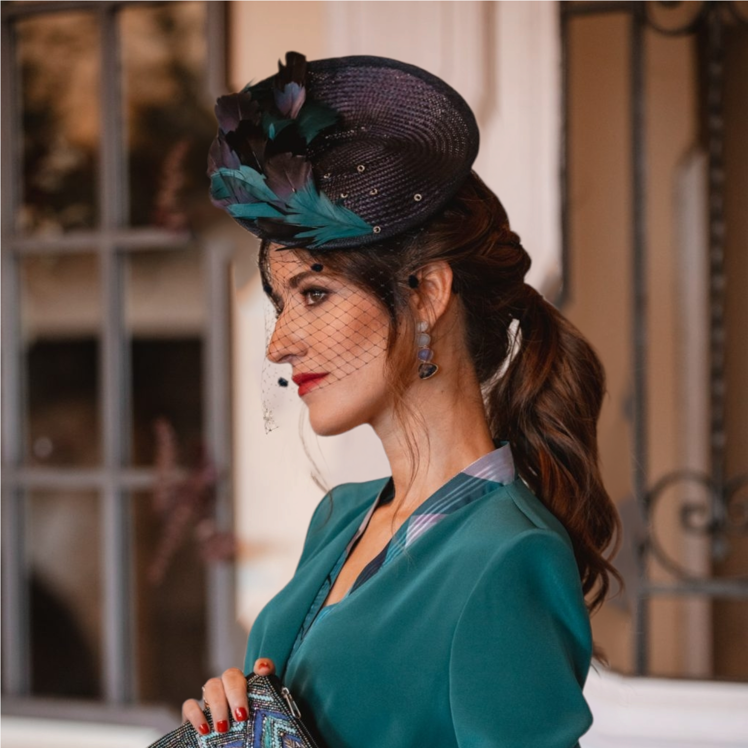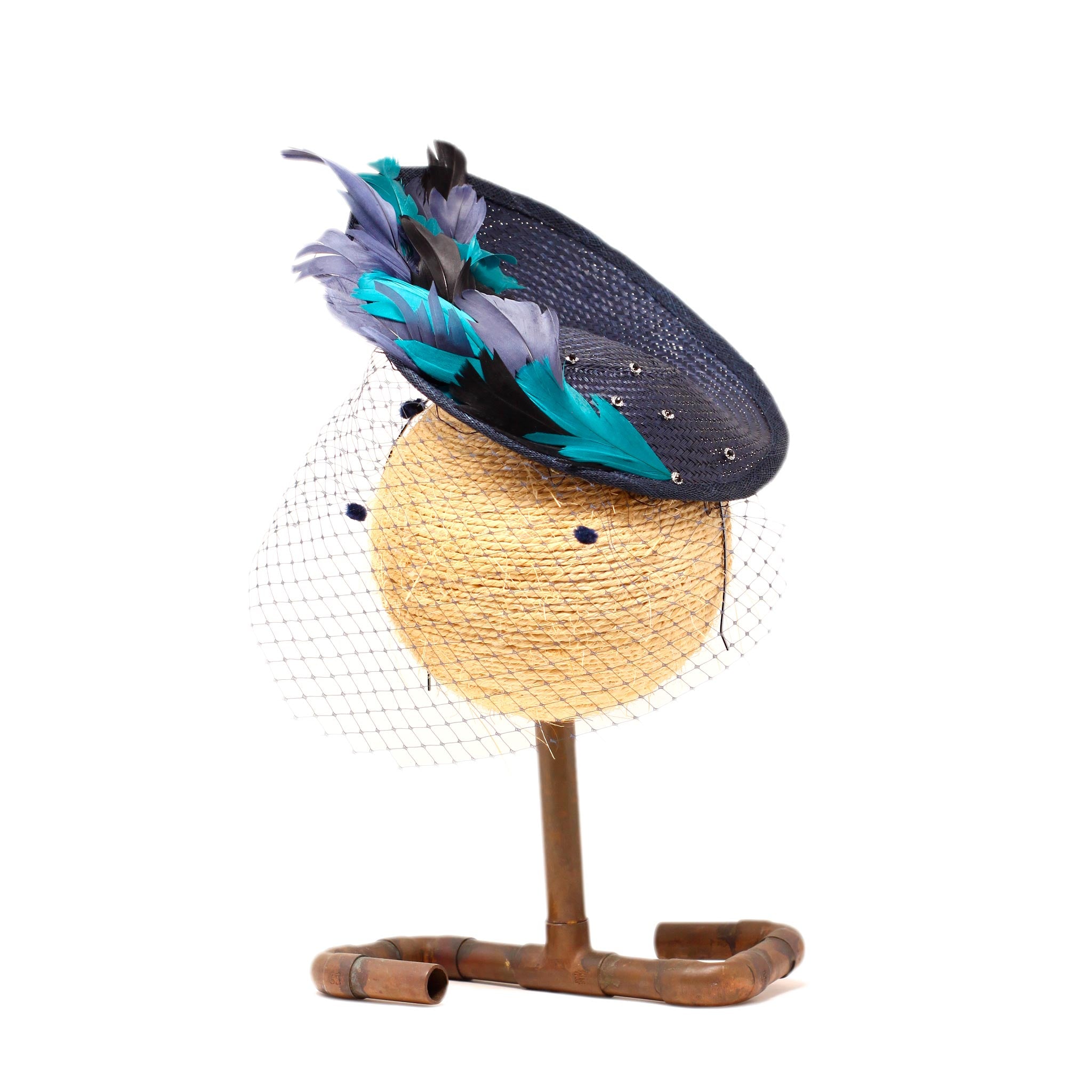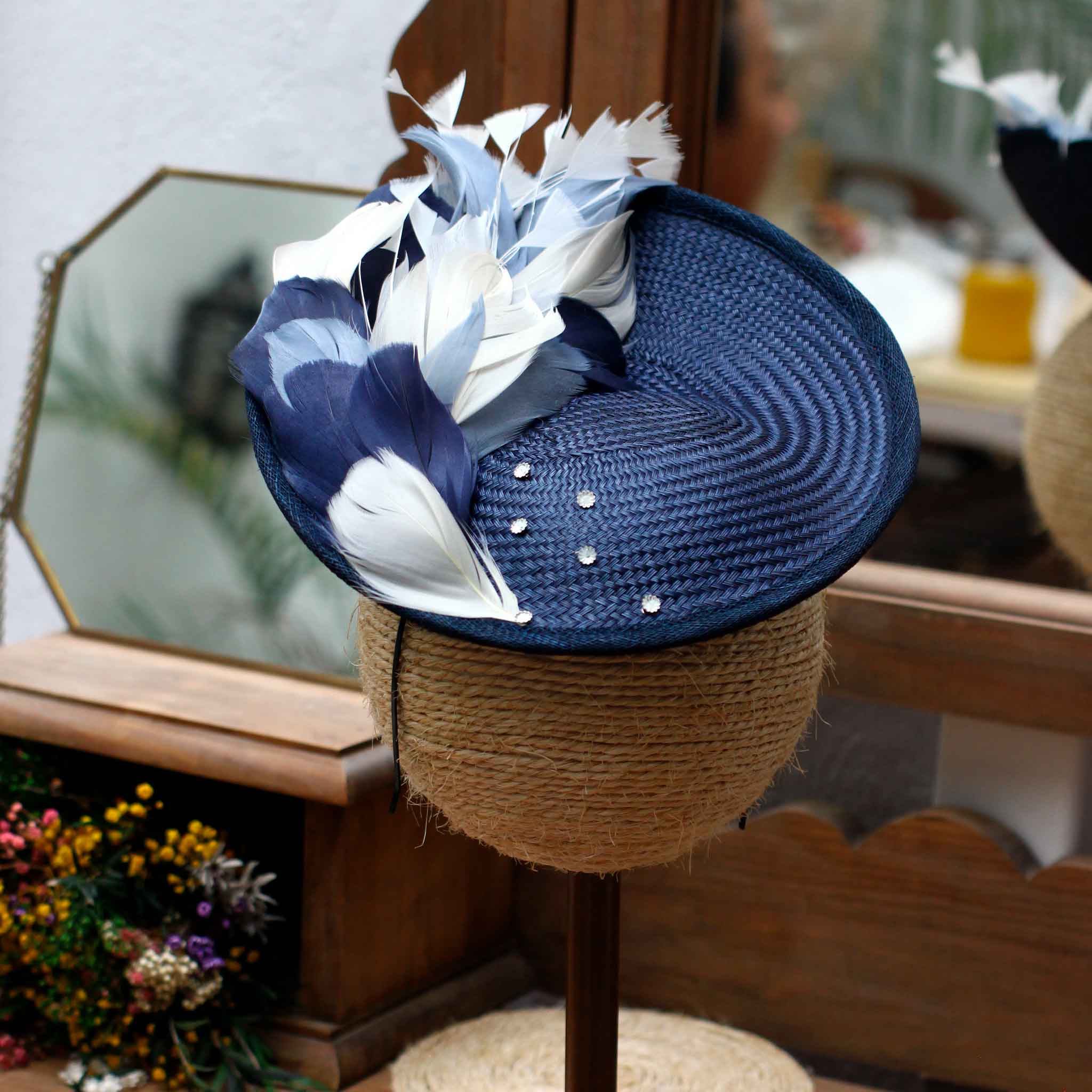 Pamela estilo plato con base azul marino decorada con diferentes plumas en tonos azules y petróleo. Terminada con pequeños broches joya, tanto en la parte superior como en la inferior, que añaden el toque final perfecto, y una diadema metálica para ajustarla a la cabeza. Puedes escoger llevarlo con o sin un velo de tul con plumeti.