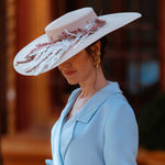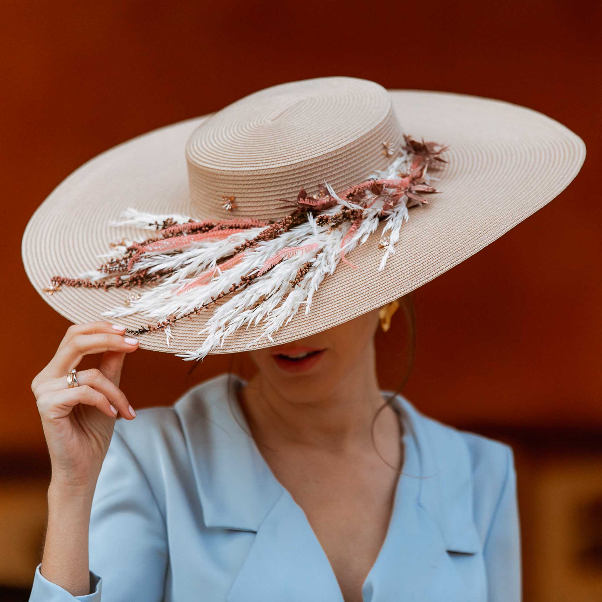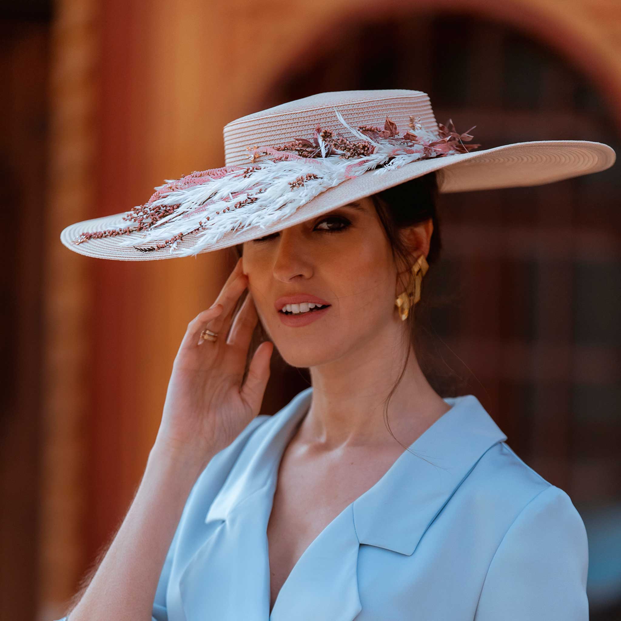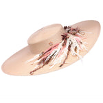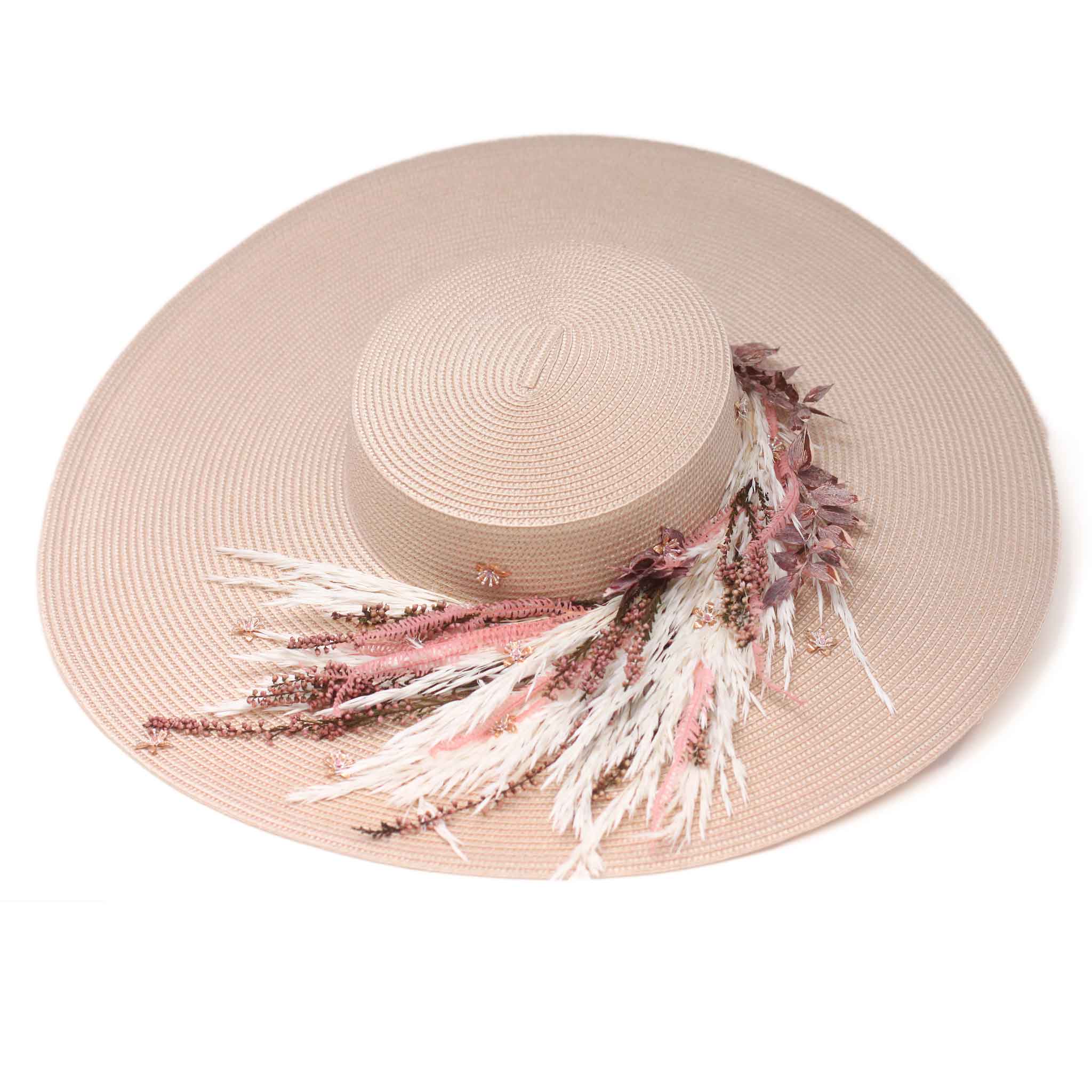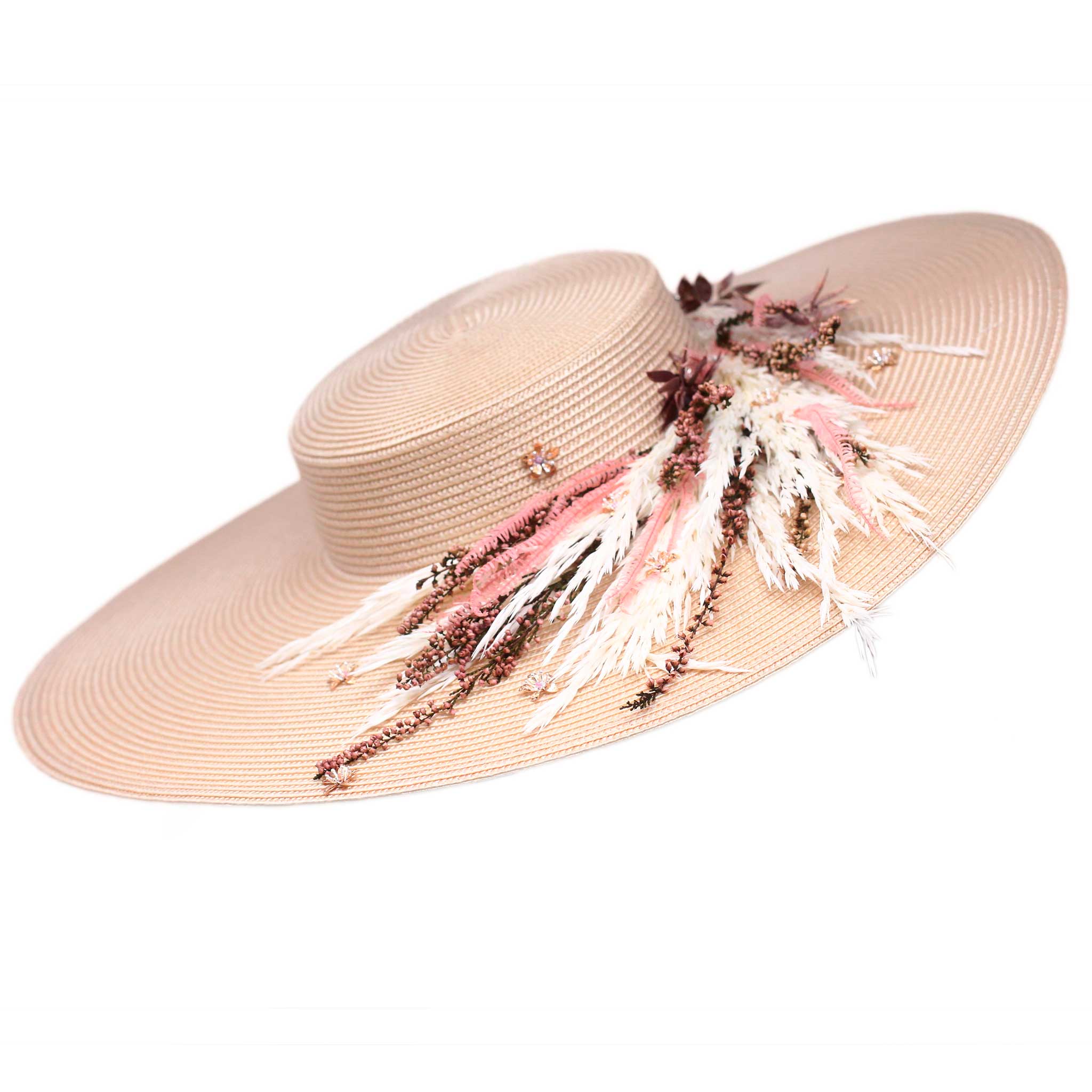 Pamela elaborada totalmente de manera artesanal con una preciosa base en beige, decorada con piezas joya y flores naturales preservadas. Para poder adaptarla bien a la cabeza se le ha añadido una diadema metálica súper cómoda para una mayor sujeción.
