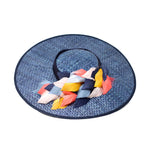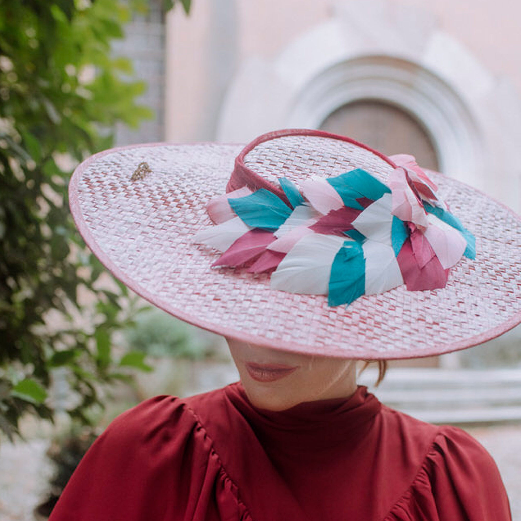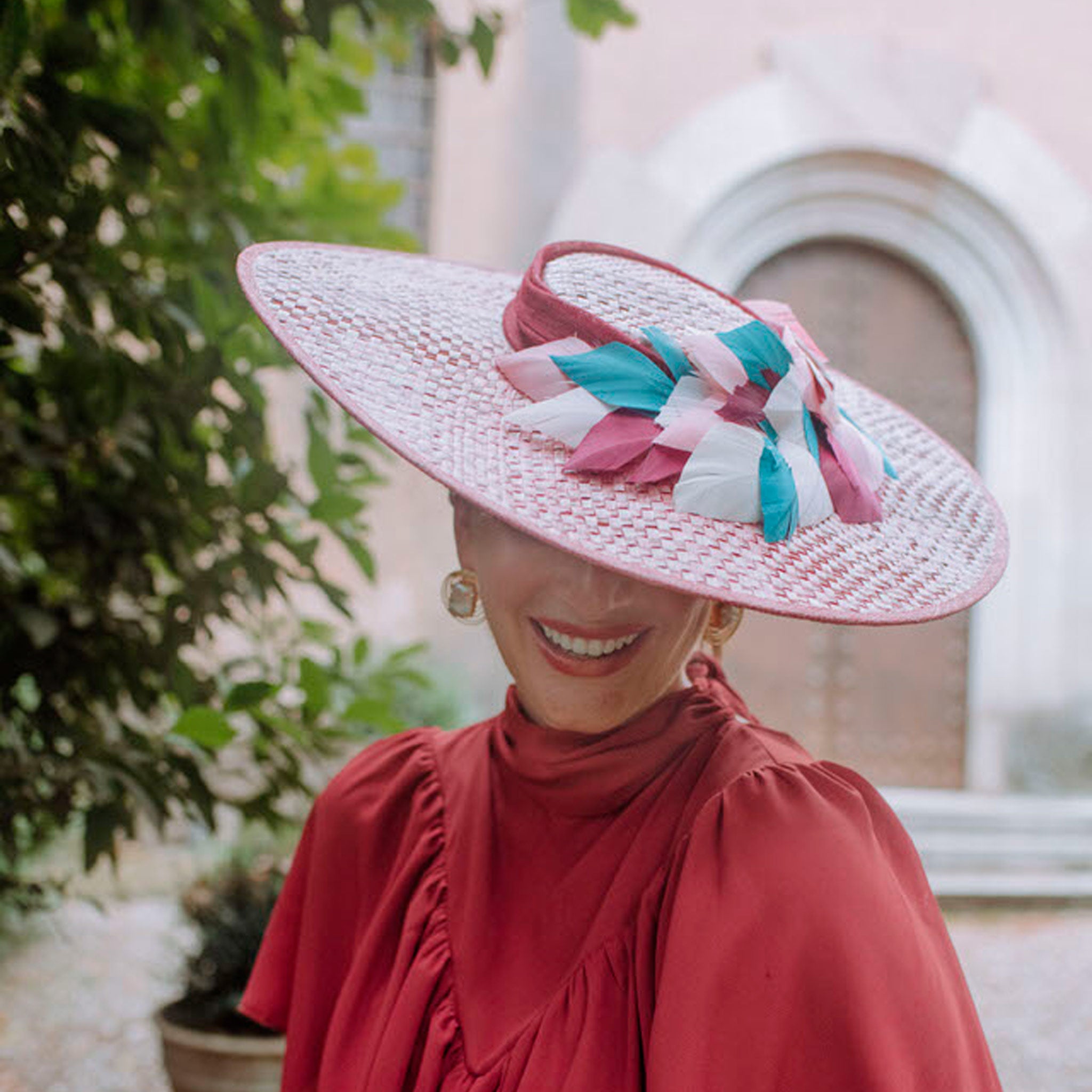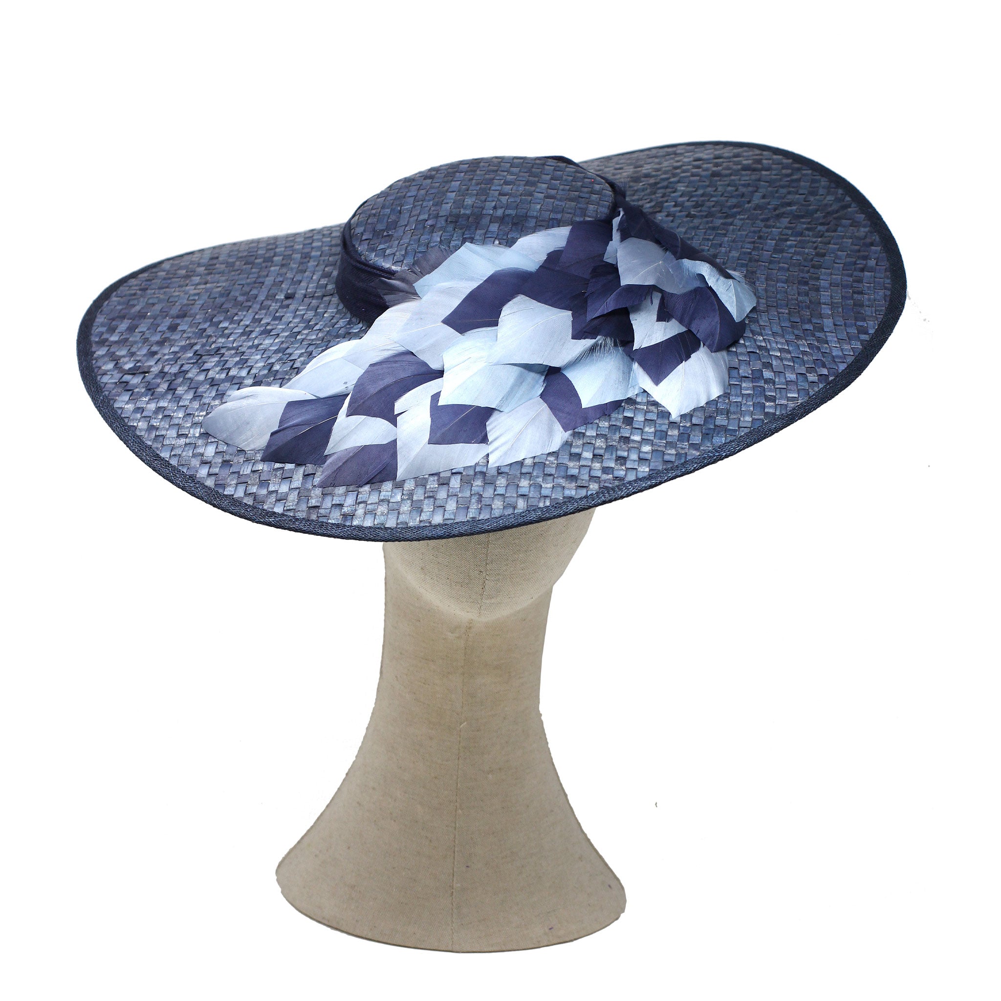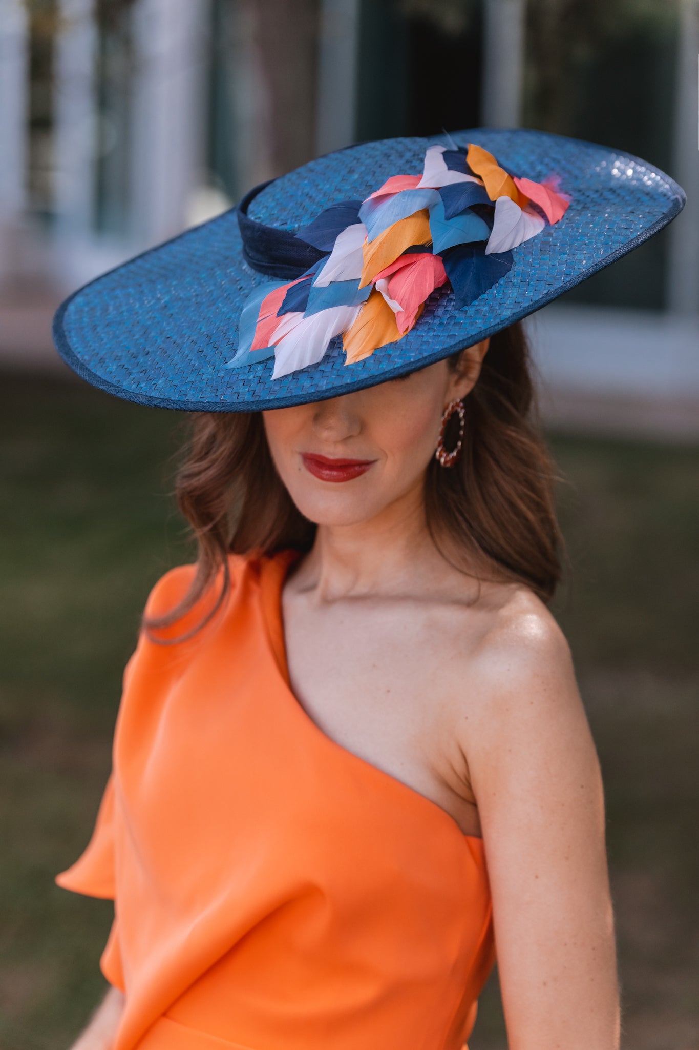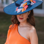 Pamela estilo plato de base azul marino trenzado con diadema interior para mayor comodidad y sujeción, decorada con una gran cascada de plumas de diferentes colores.