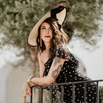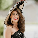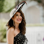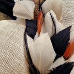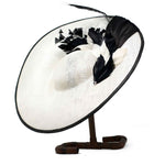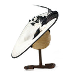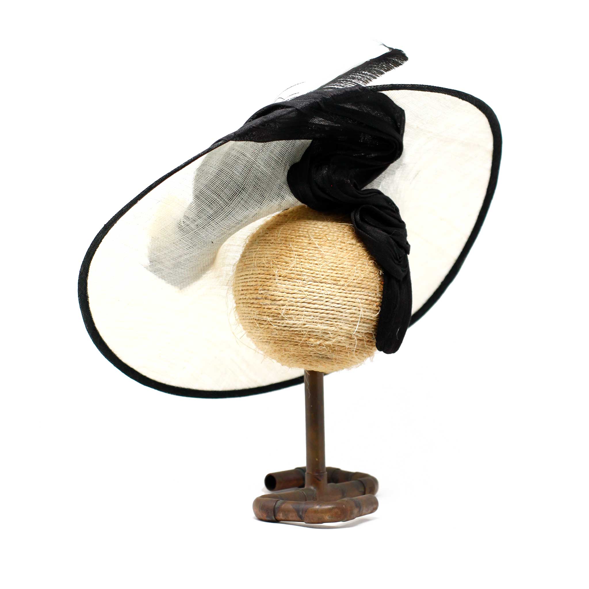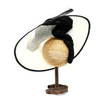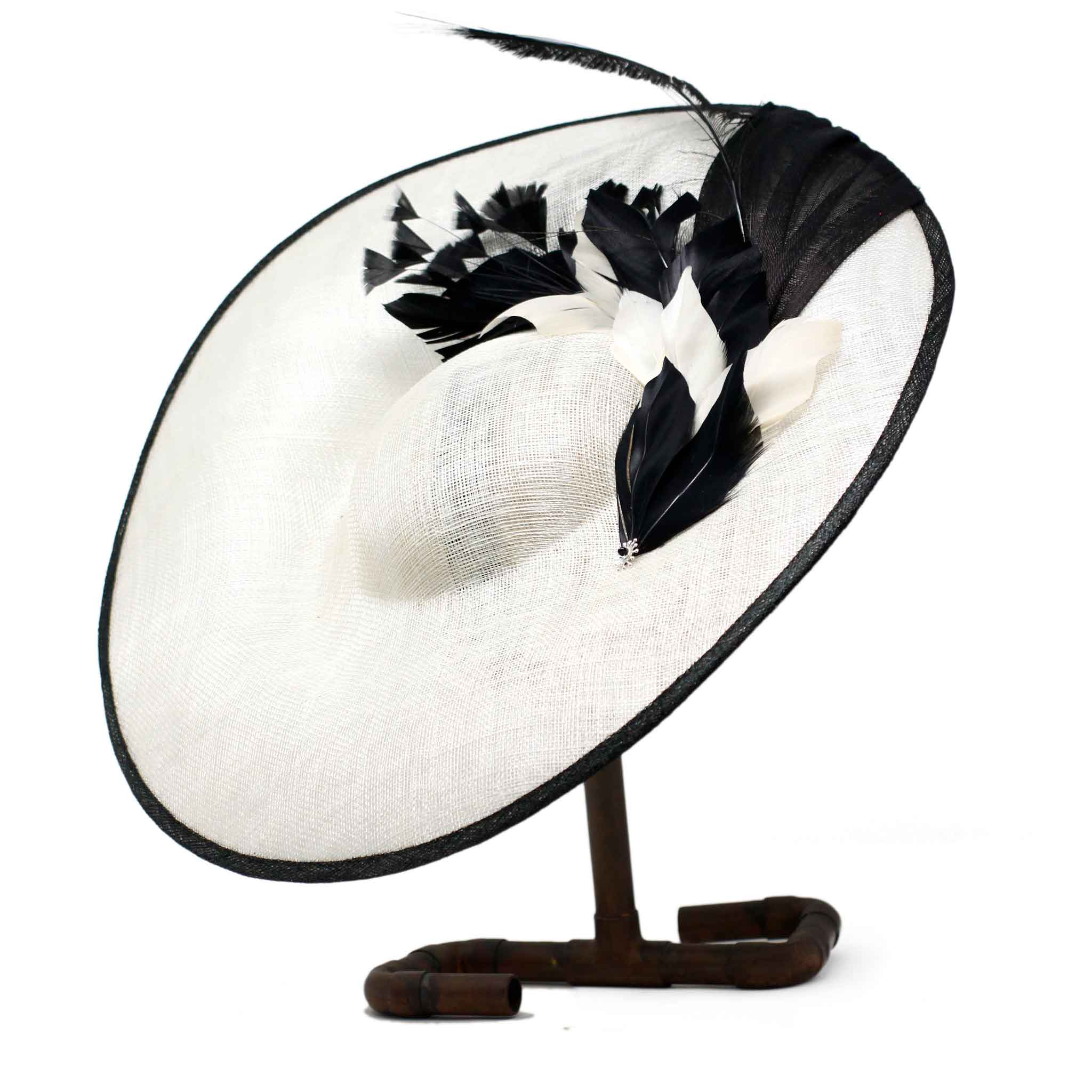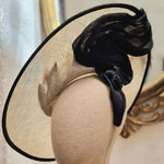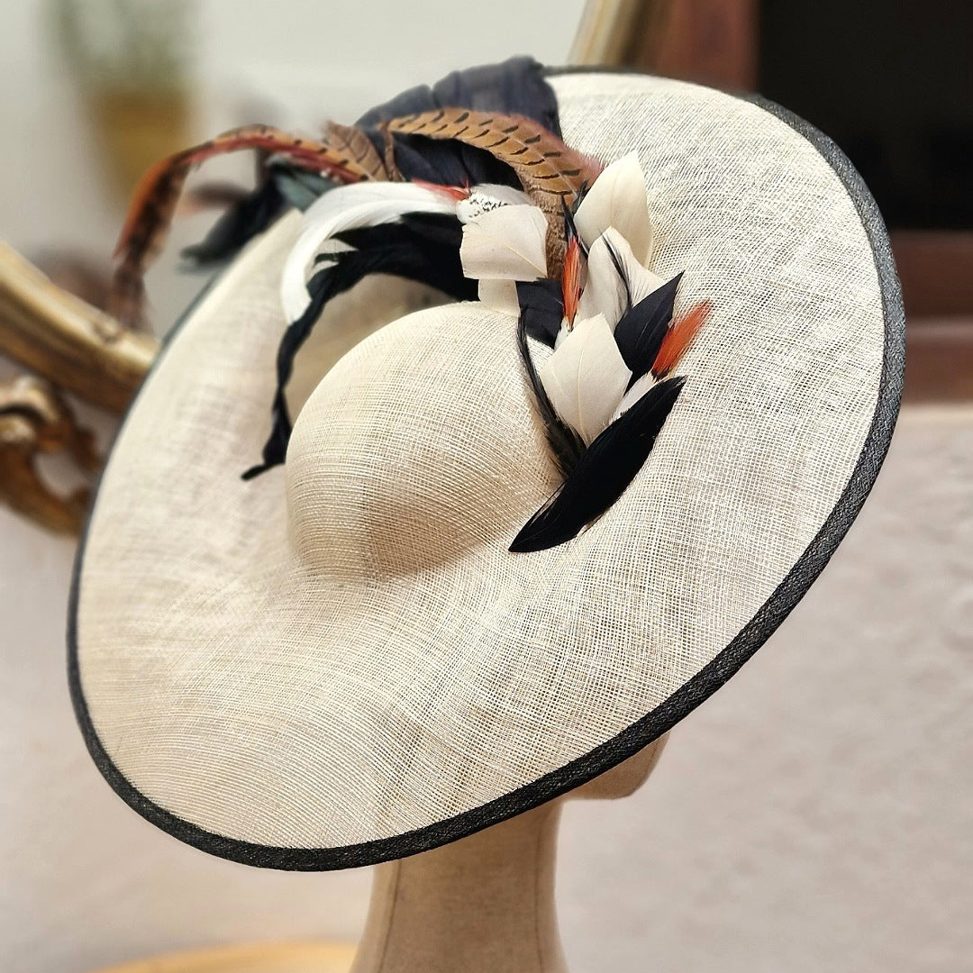 Pamela estilo plato de base cruda o beige y bordes negros totalmente elaborada de manera artesana. Lleva incorporada una diadema que hará que tenga una sujeción total. Decorada con una gran variedad de plumas, y terminada con detalles de sinamay texturizado.