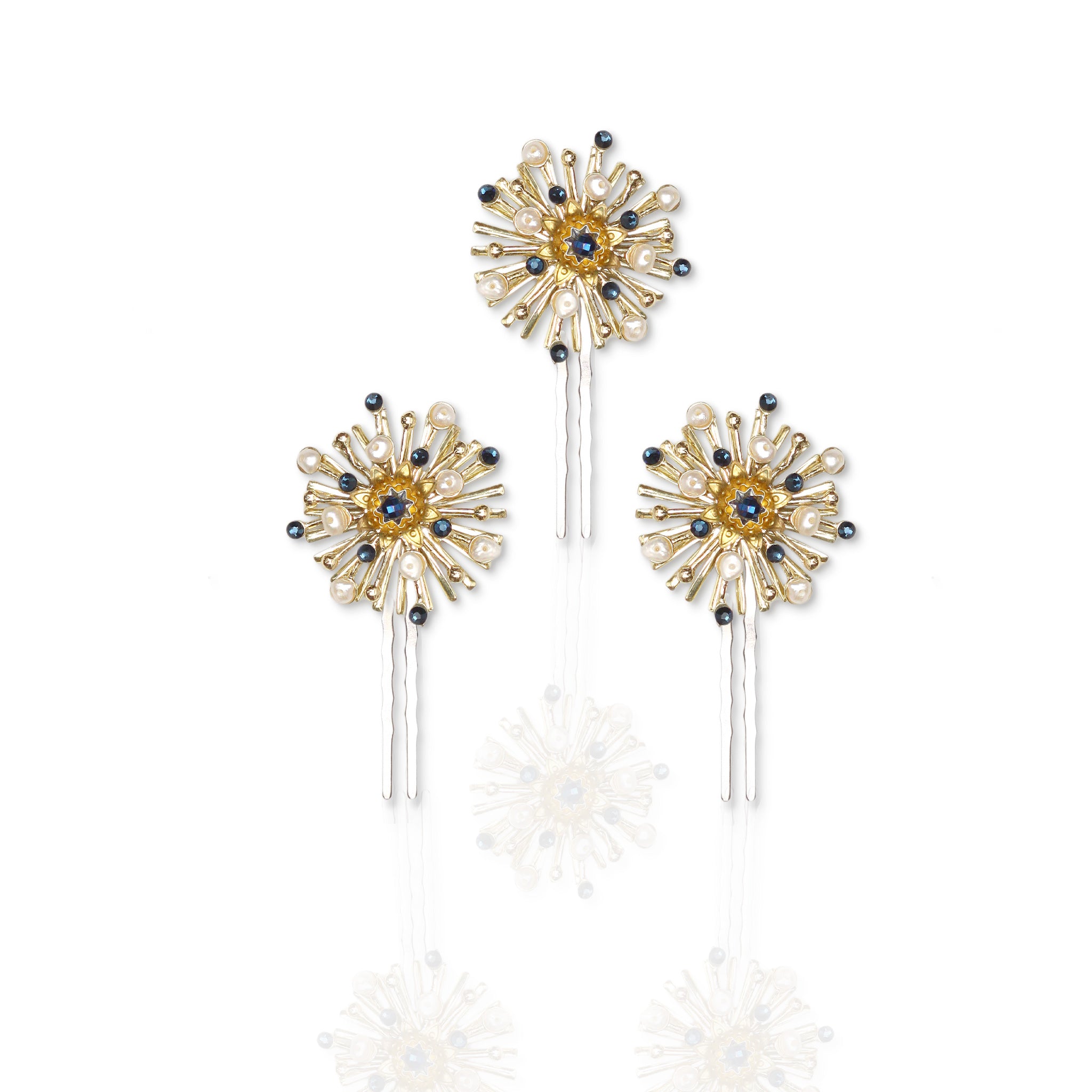 Peinas decoradas con piezas joya en forma de sol, con detalles en perlas y brillantes.