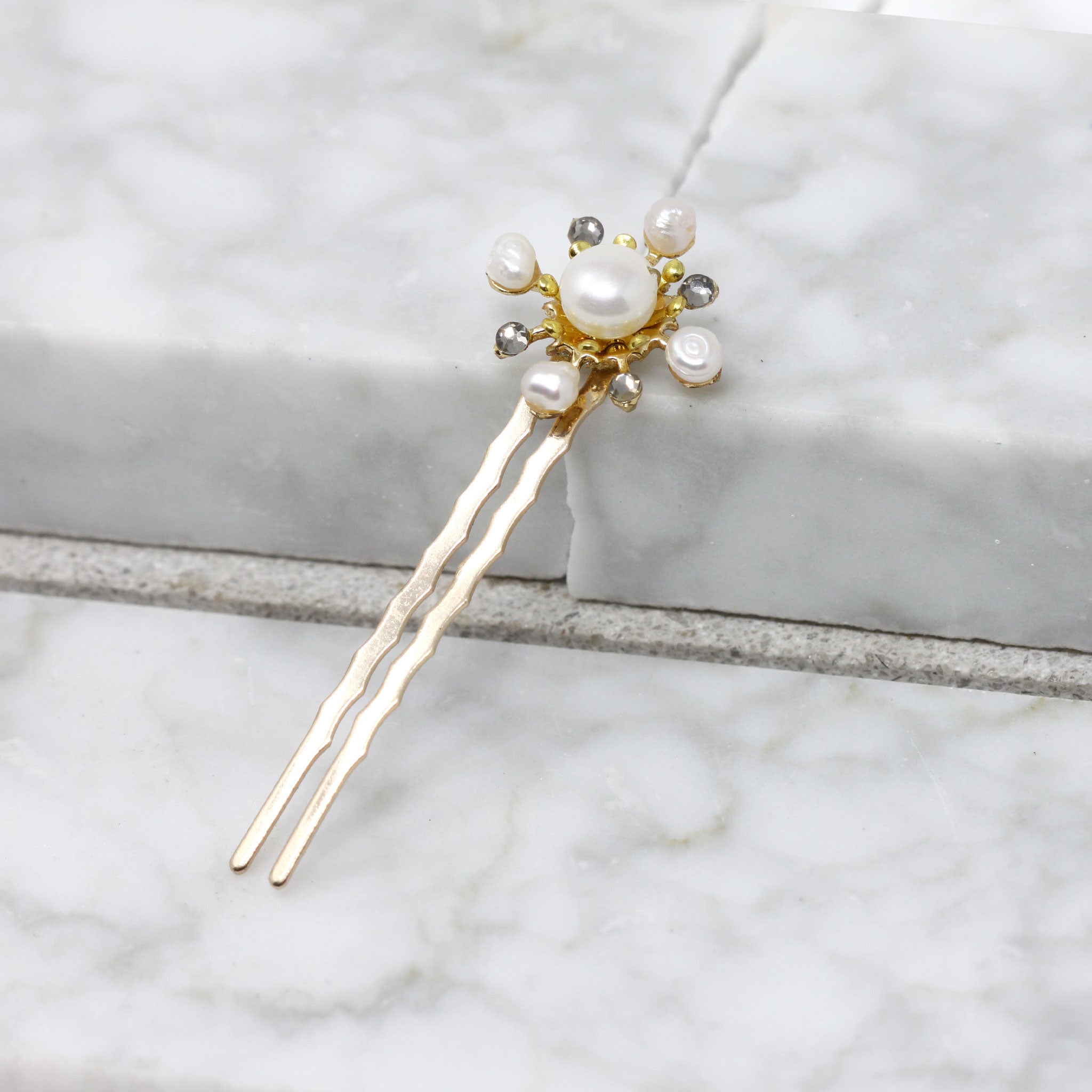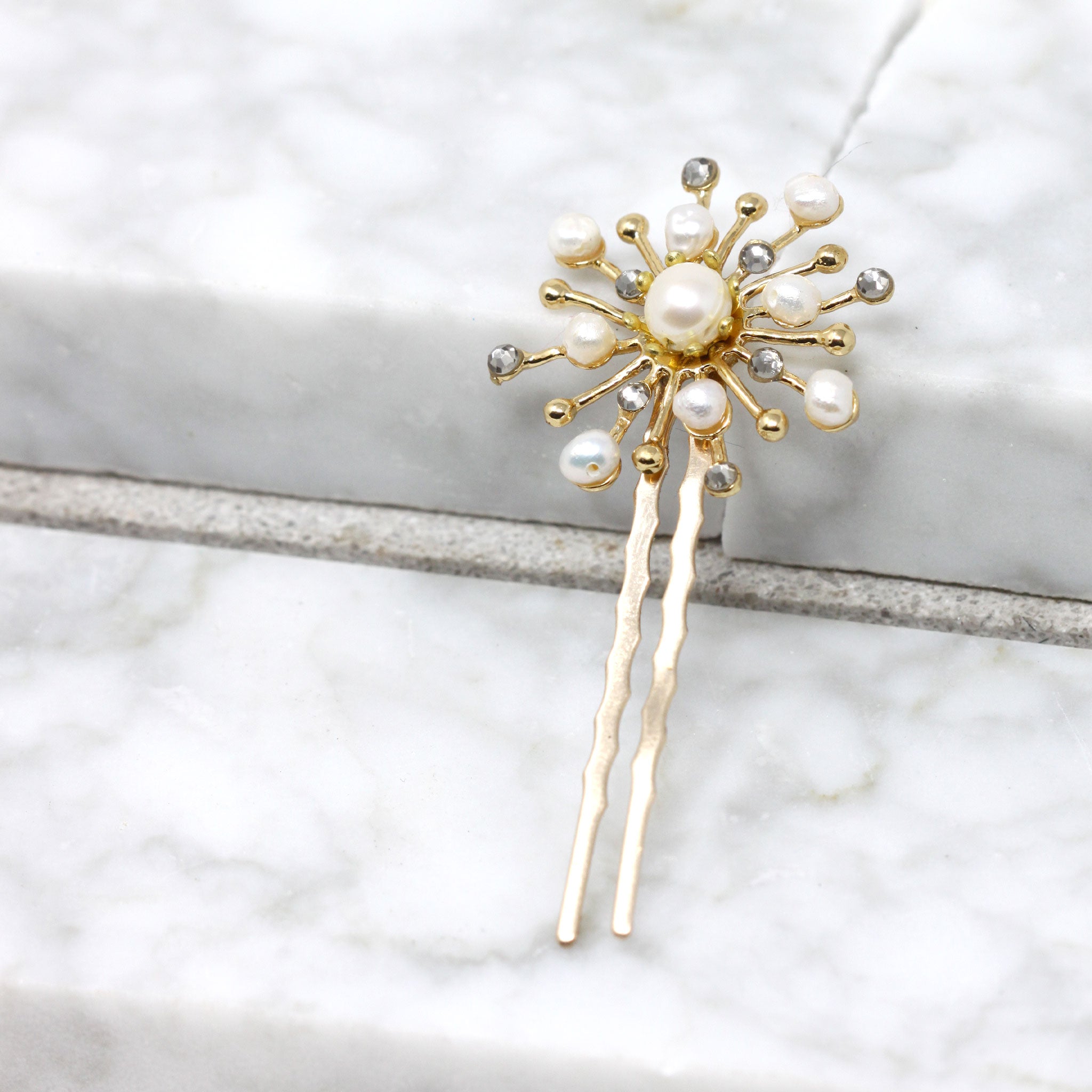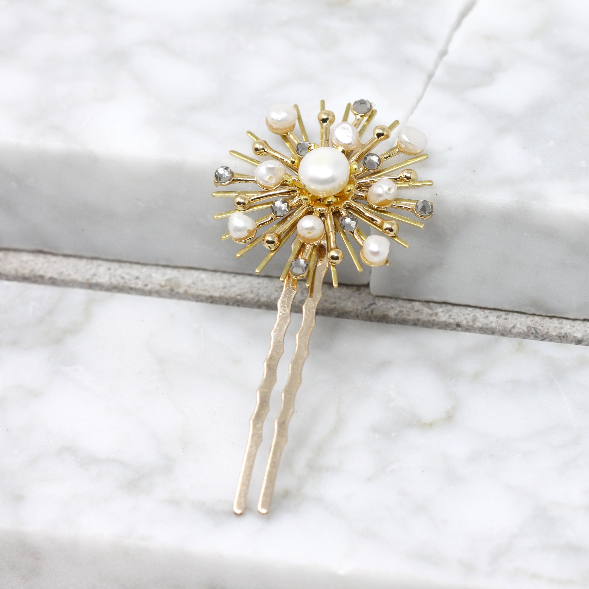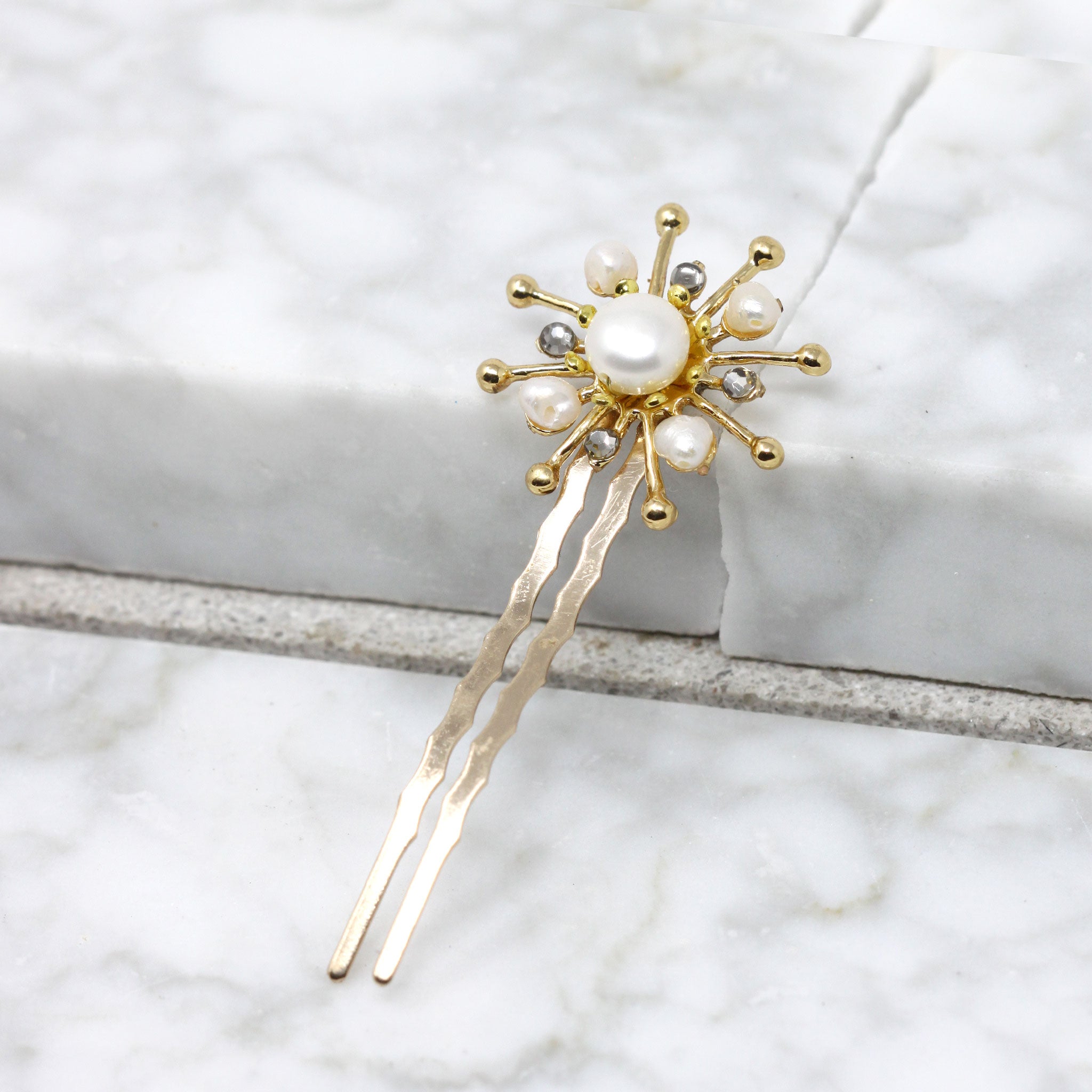 Peinas decoradas con piezas joya en forma de sol, con detalles en perlas y brillantes plateados.