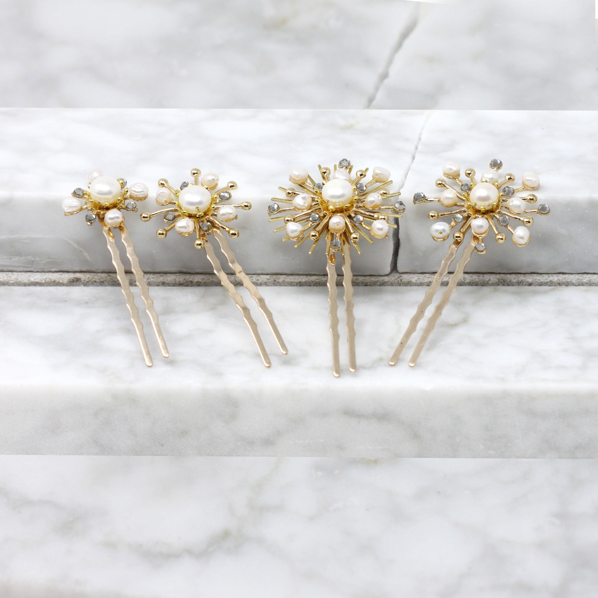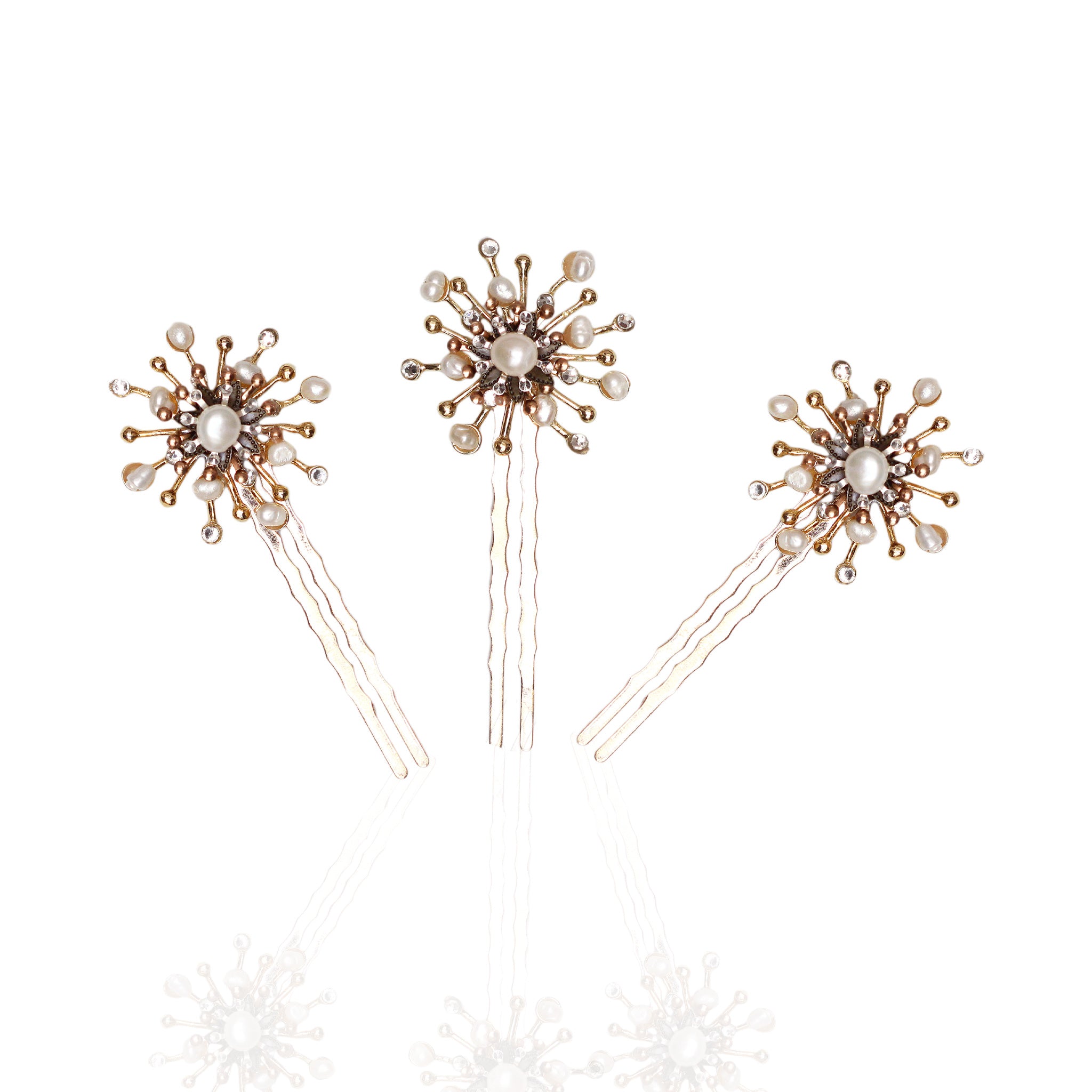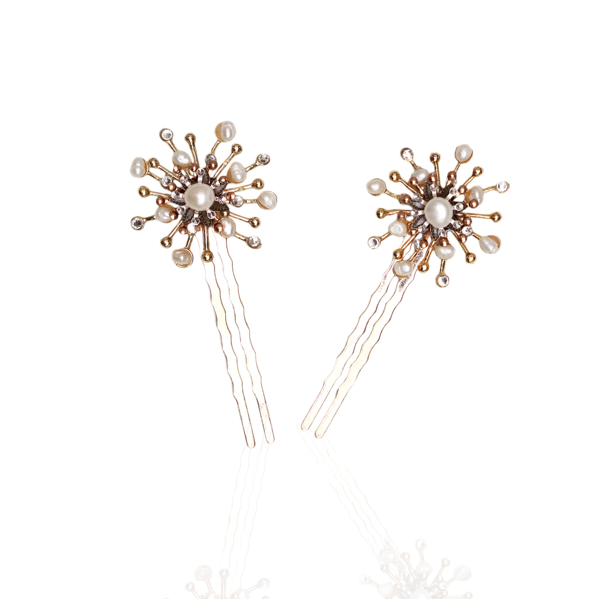 Peinas decoradas con piezas joya en forma de sol, con detalles en perlas y brillantes.