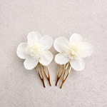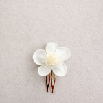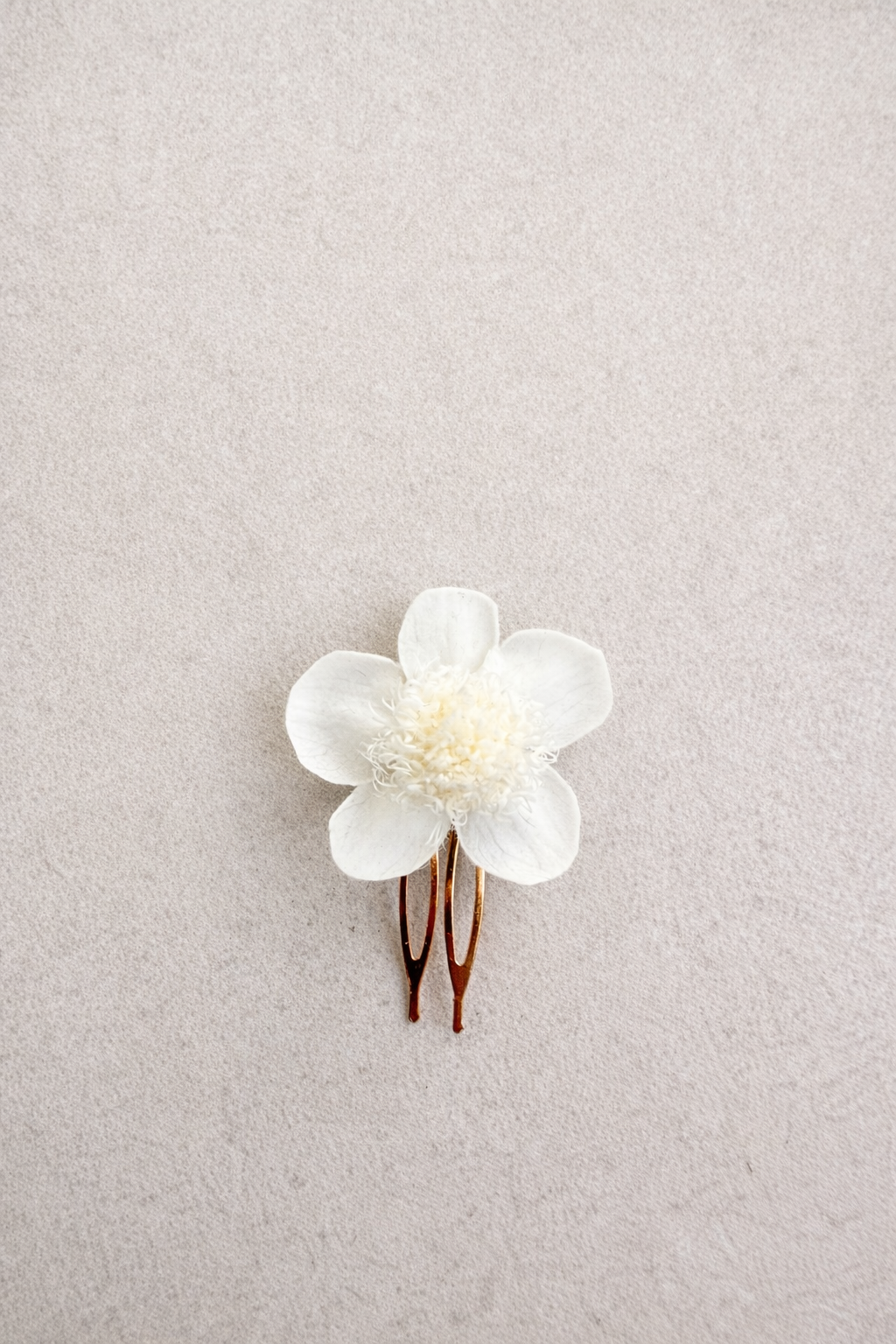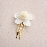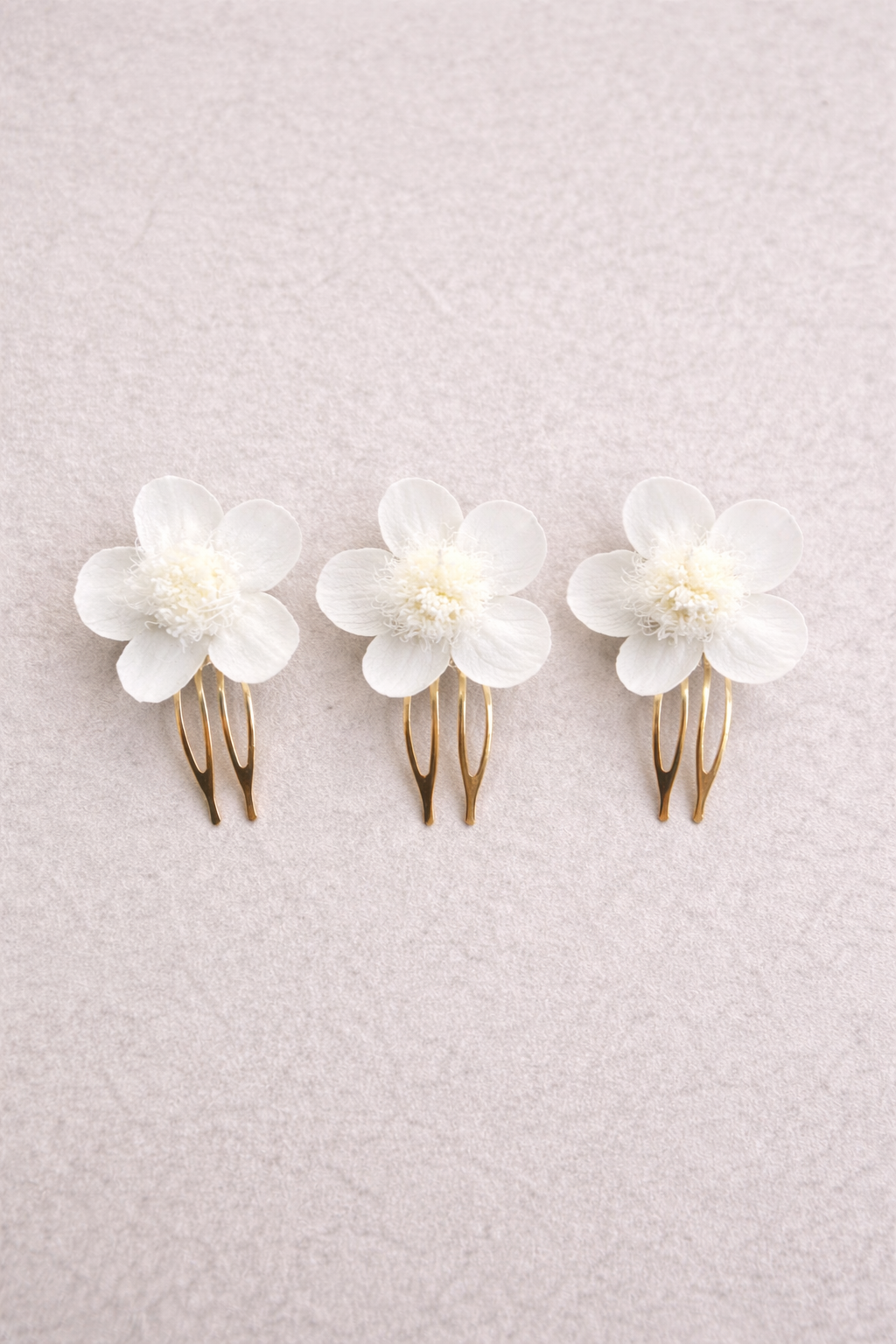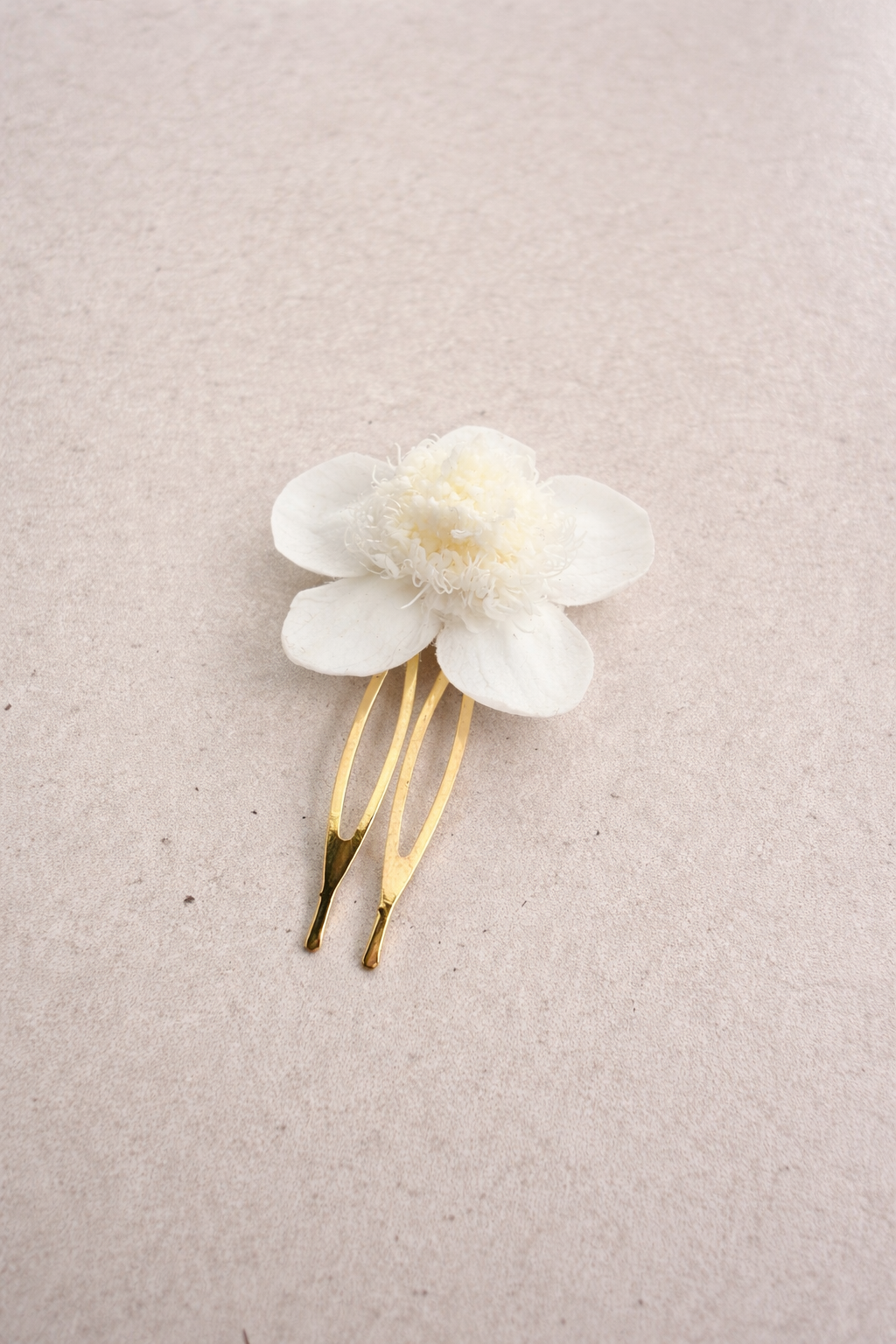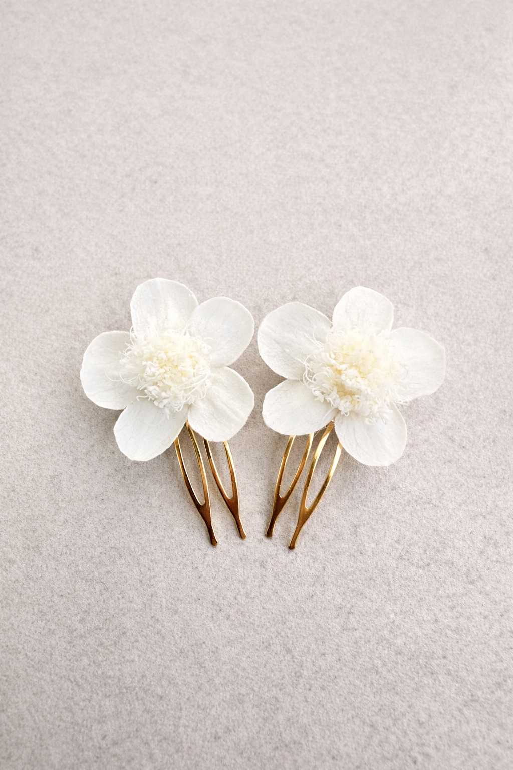 Su diseño pequeño y equilibrado las hace perfectas para aportar un toque floral sutil. La flor preservada mantiene su color y textura, creando una pieza delicada, elegante y atemporal que se integra con naturalidad en el peinado.