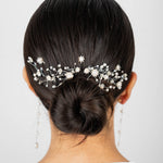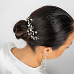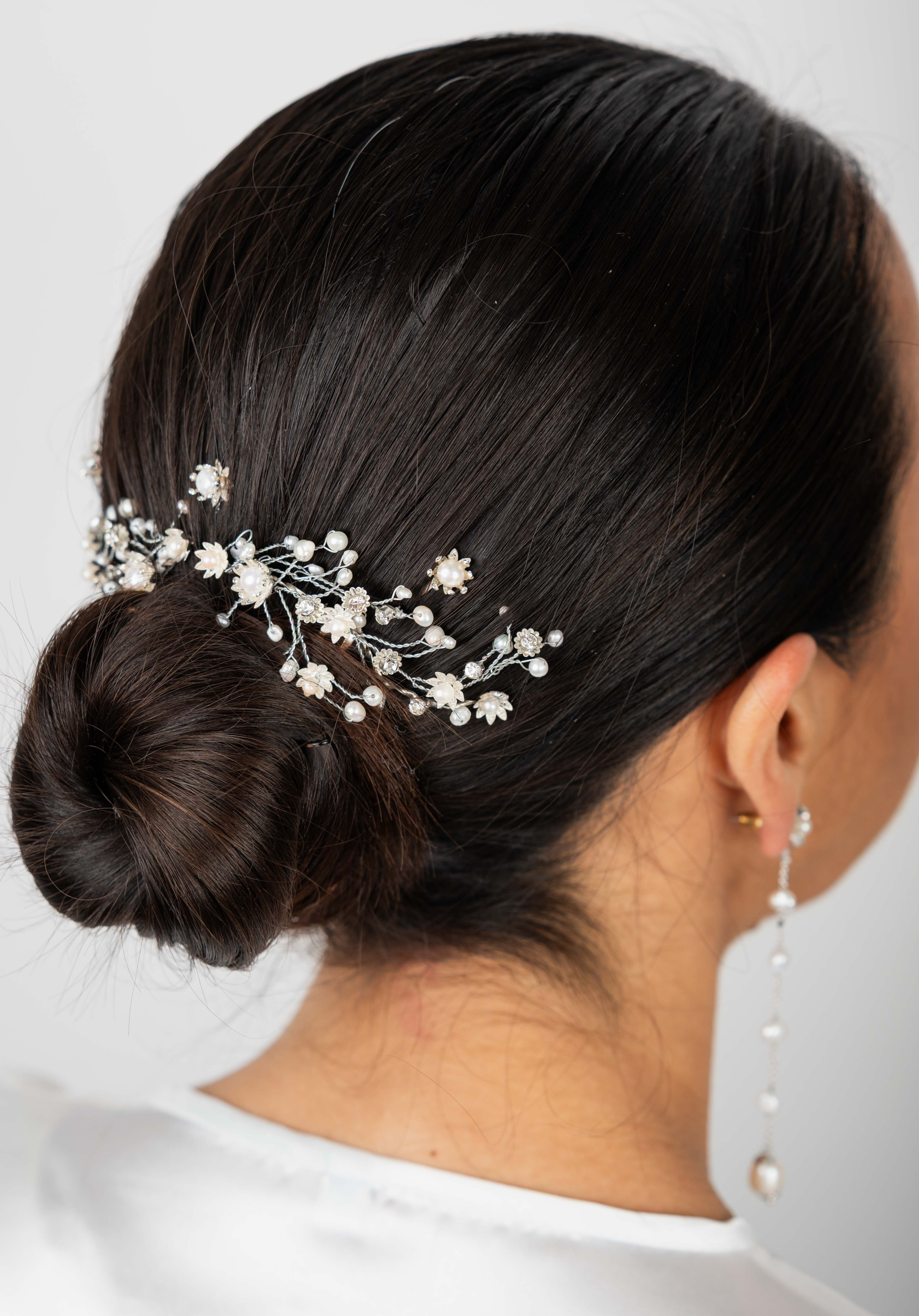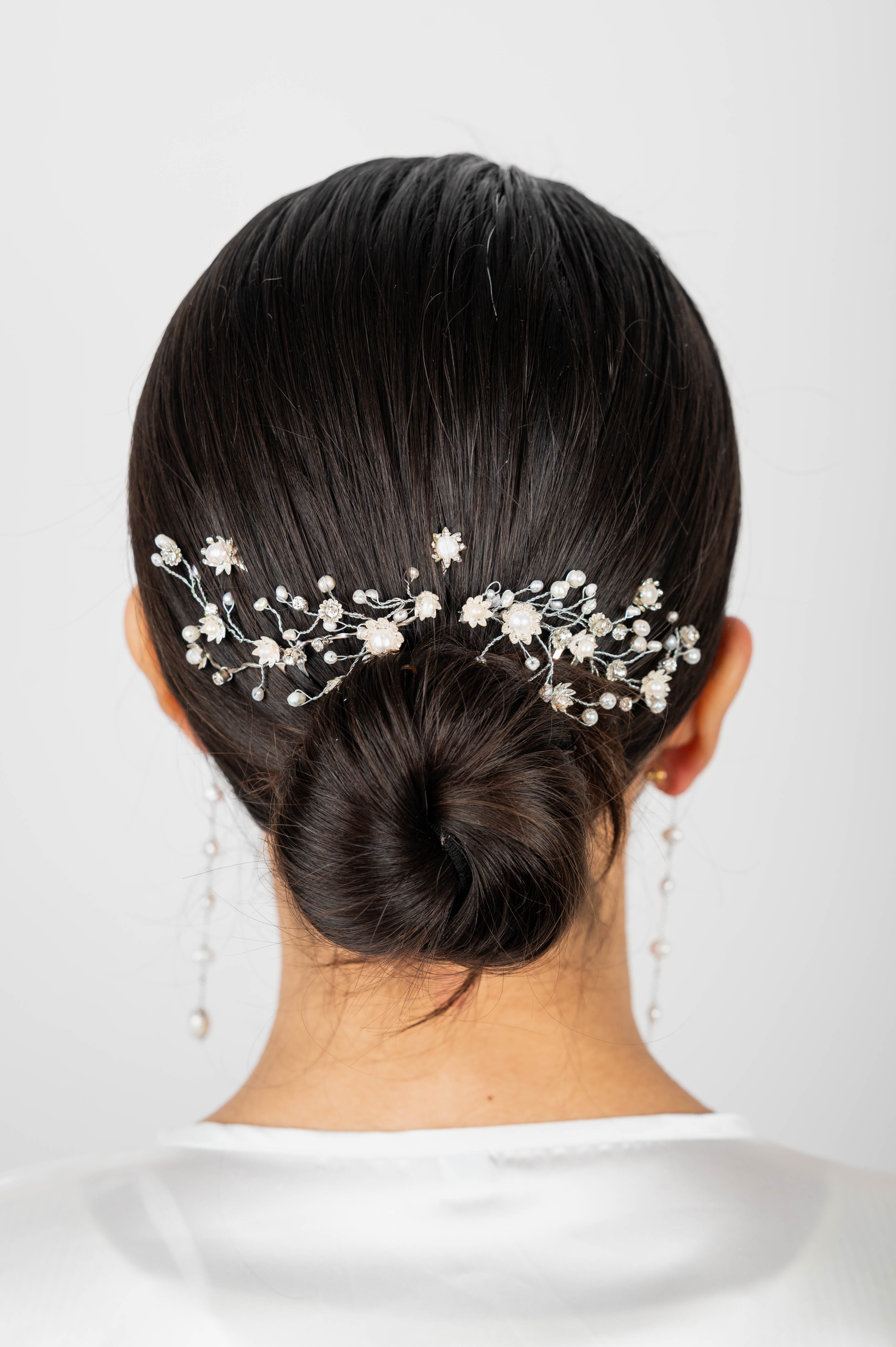 Cada pieza está hecha a mano con perlas de río cuidadosamente seleccionadas, reflejando la luz con una belleza sutil y atemporal. Su estructura flexible permite ajustarlas a recogidos bajos, moños románticos, trenzas boho o semirrecogidos con ondas, adaptándose perfectamente a tu estilo.