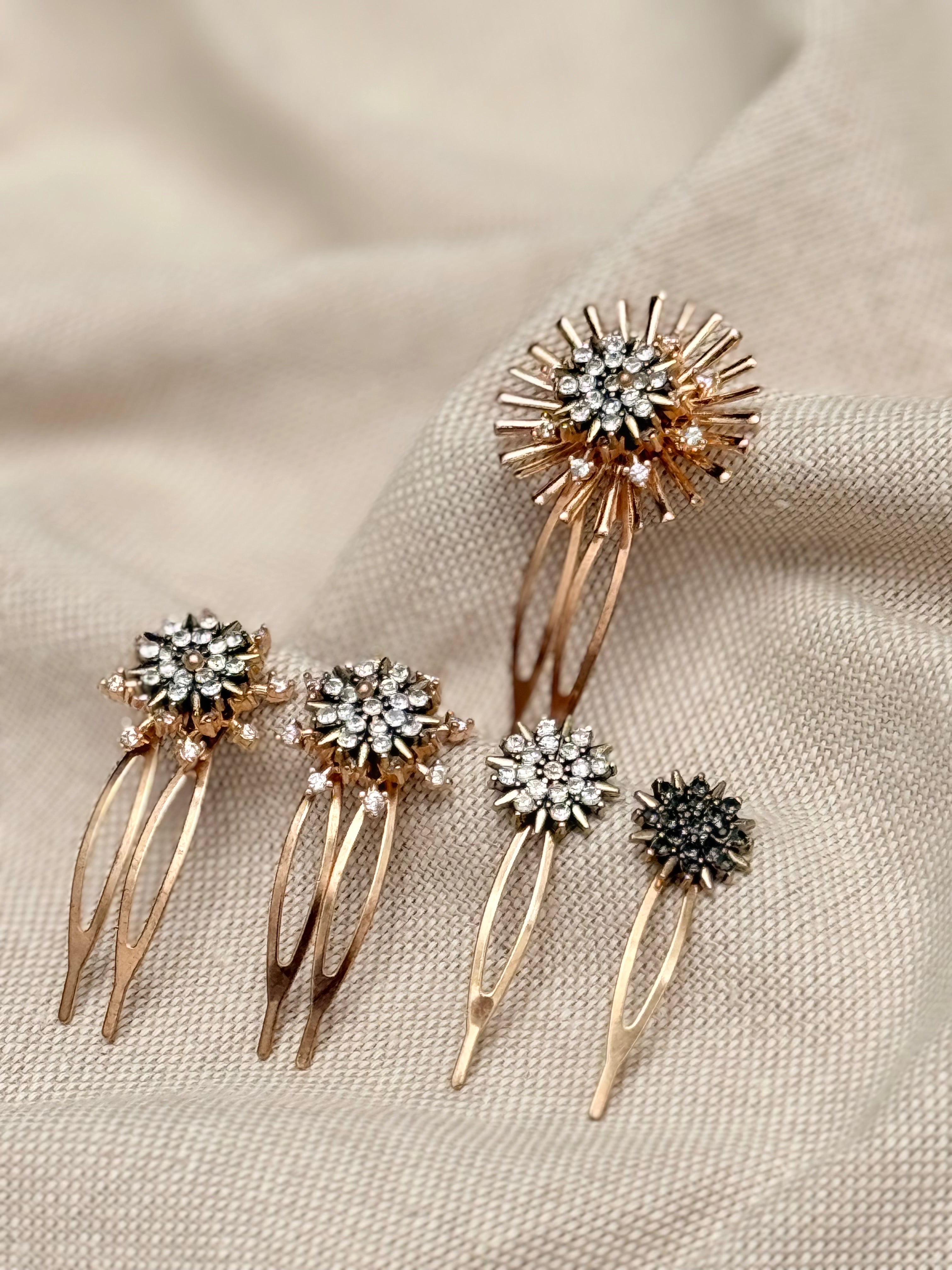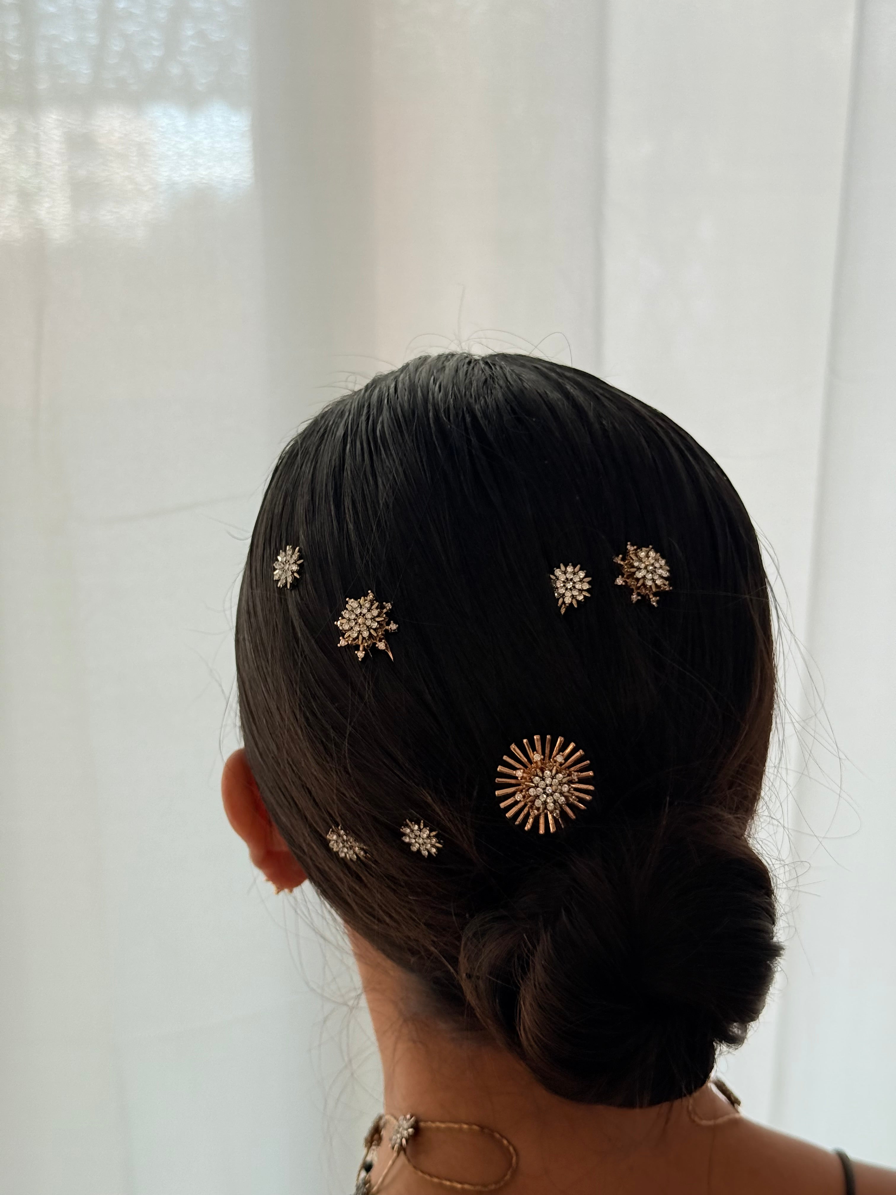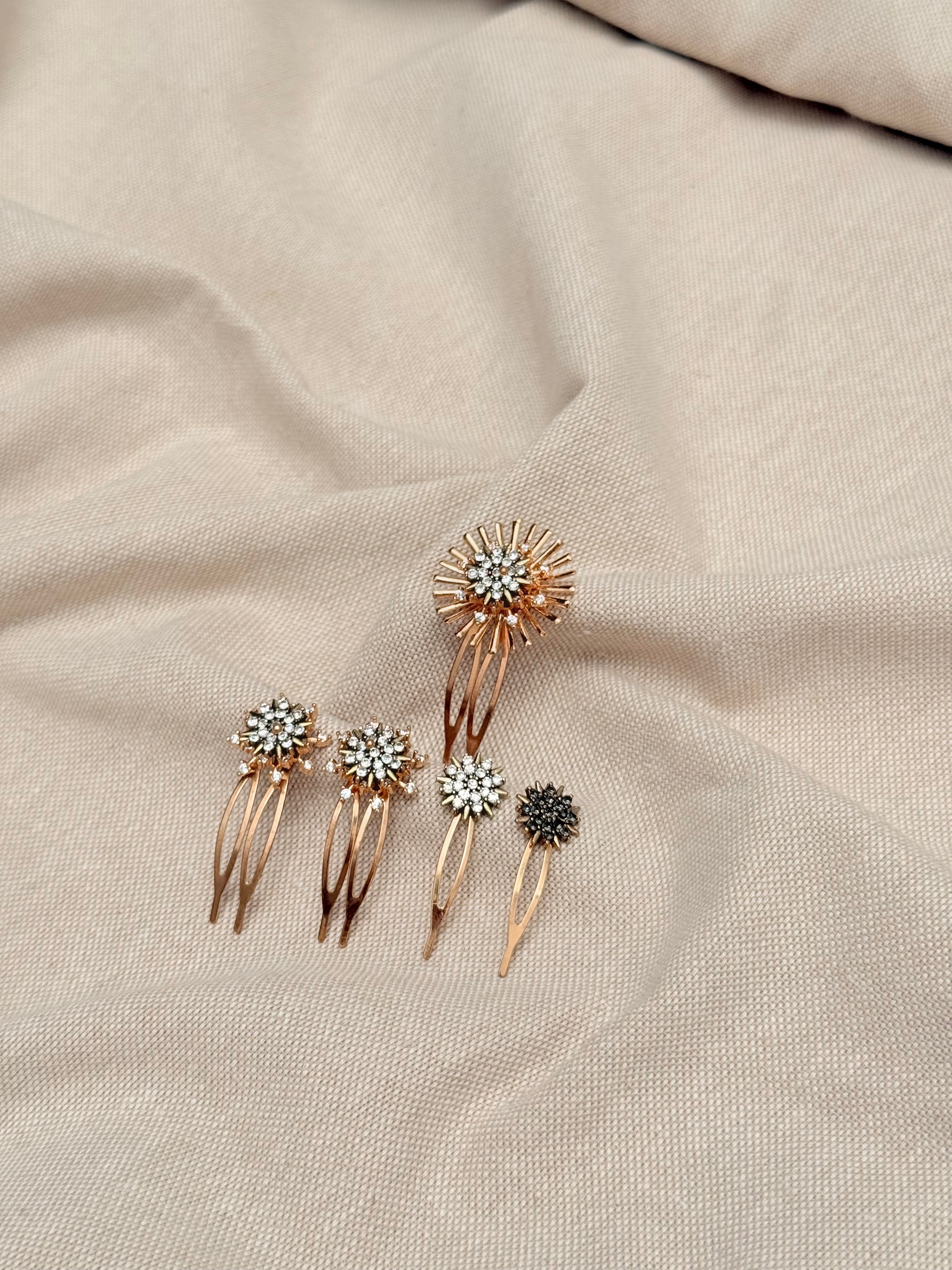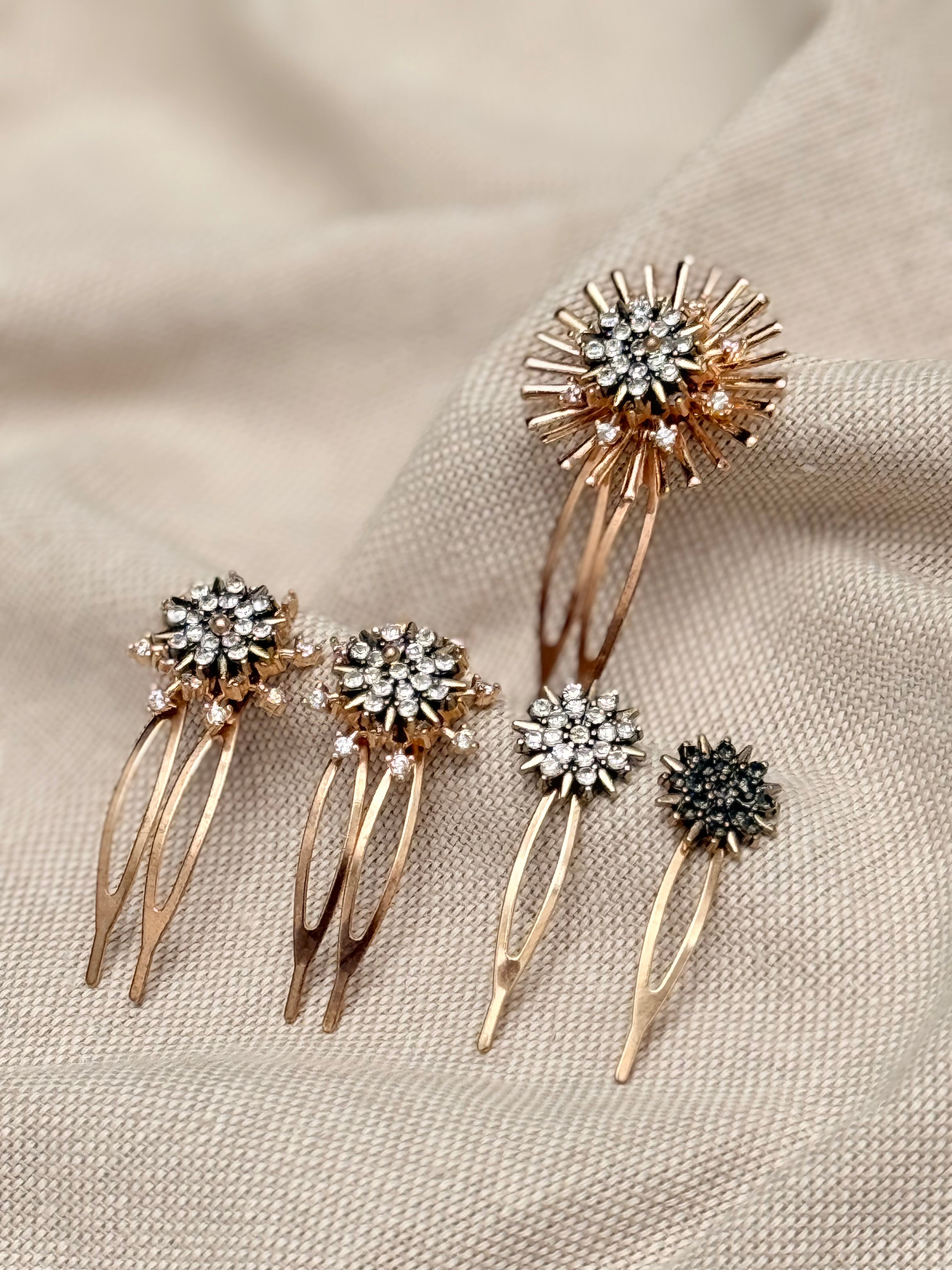 Nuestra colección Elmira no podía terminar de otra manera que con unos detalle que destellen como estrellas este maravilloso juego de peinas, elige las tuyas y haz tu conjunto.