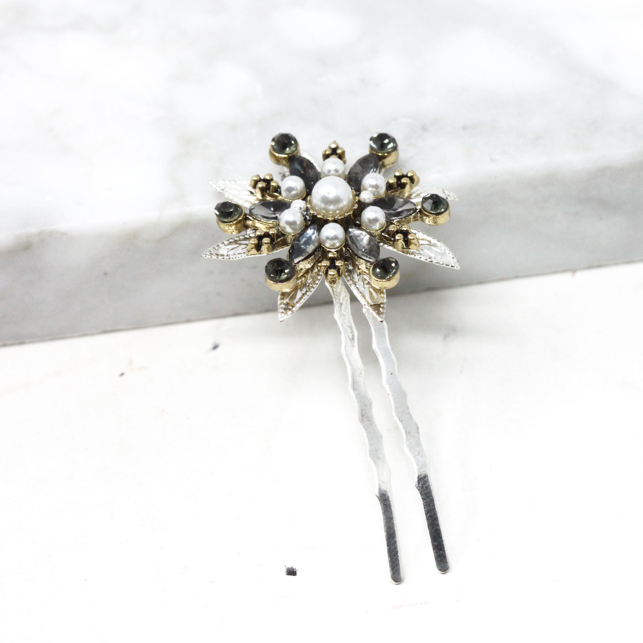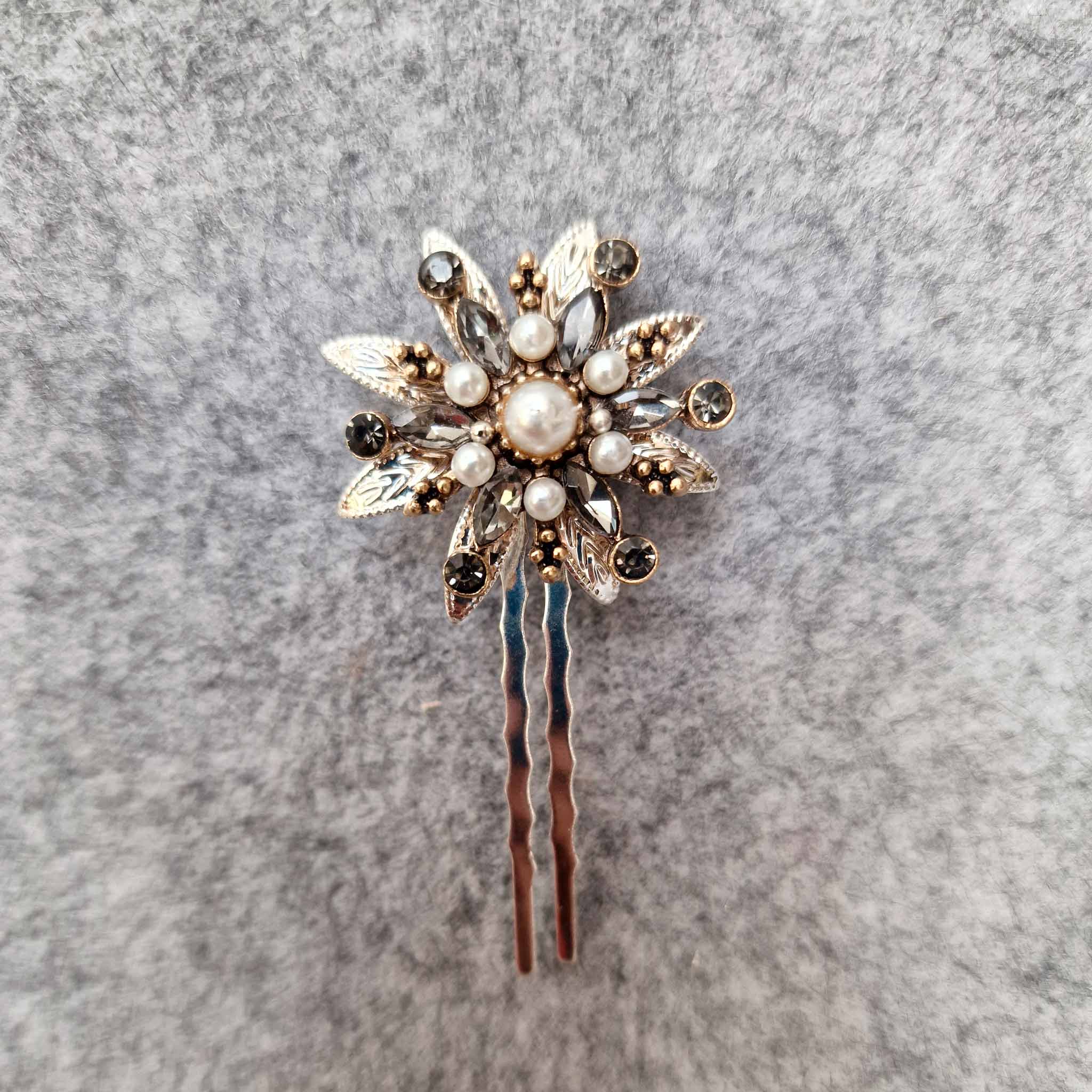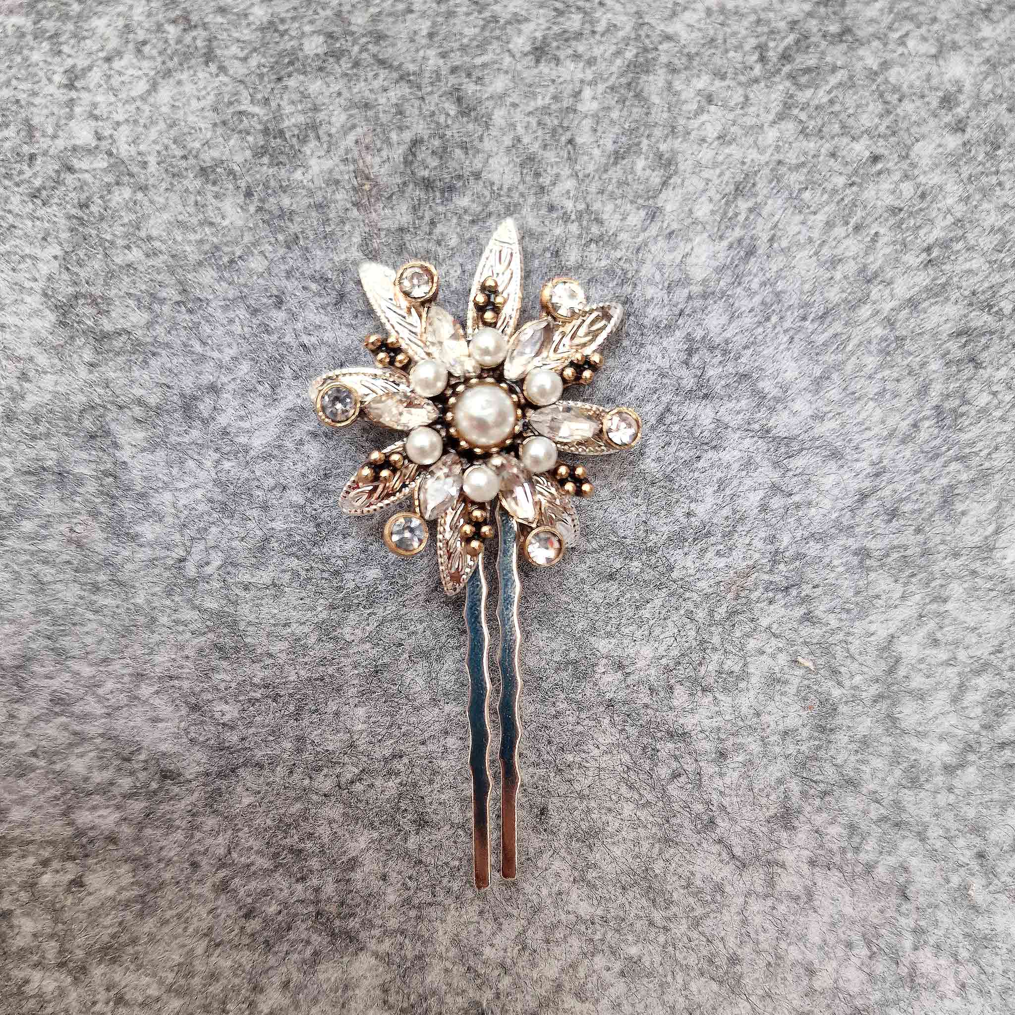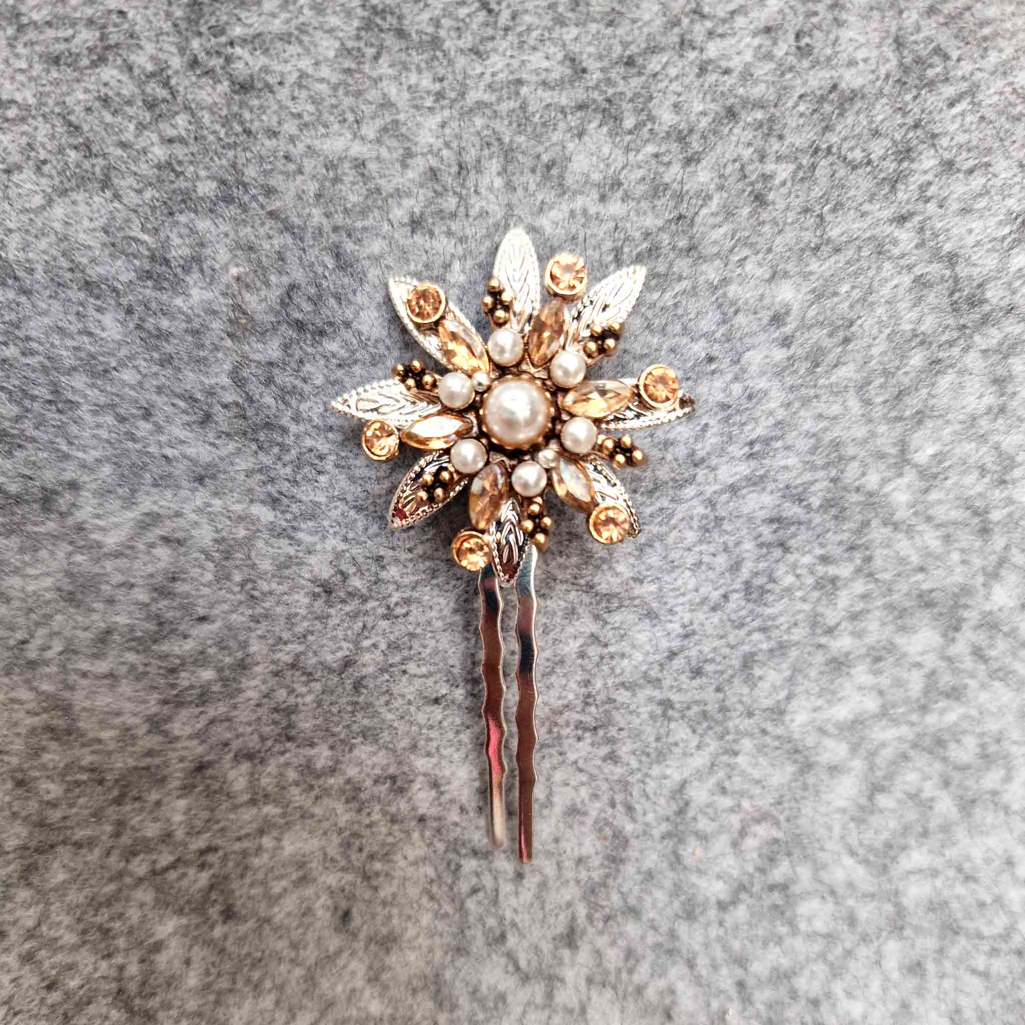 Peinas decoradas con piezas joya en forma de flor, con detalles en perlitas y brillantes. Disponibles en diferentes metales.