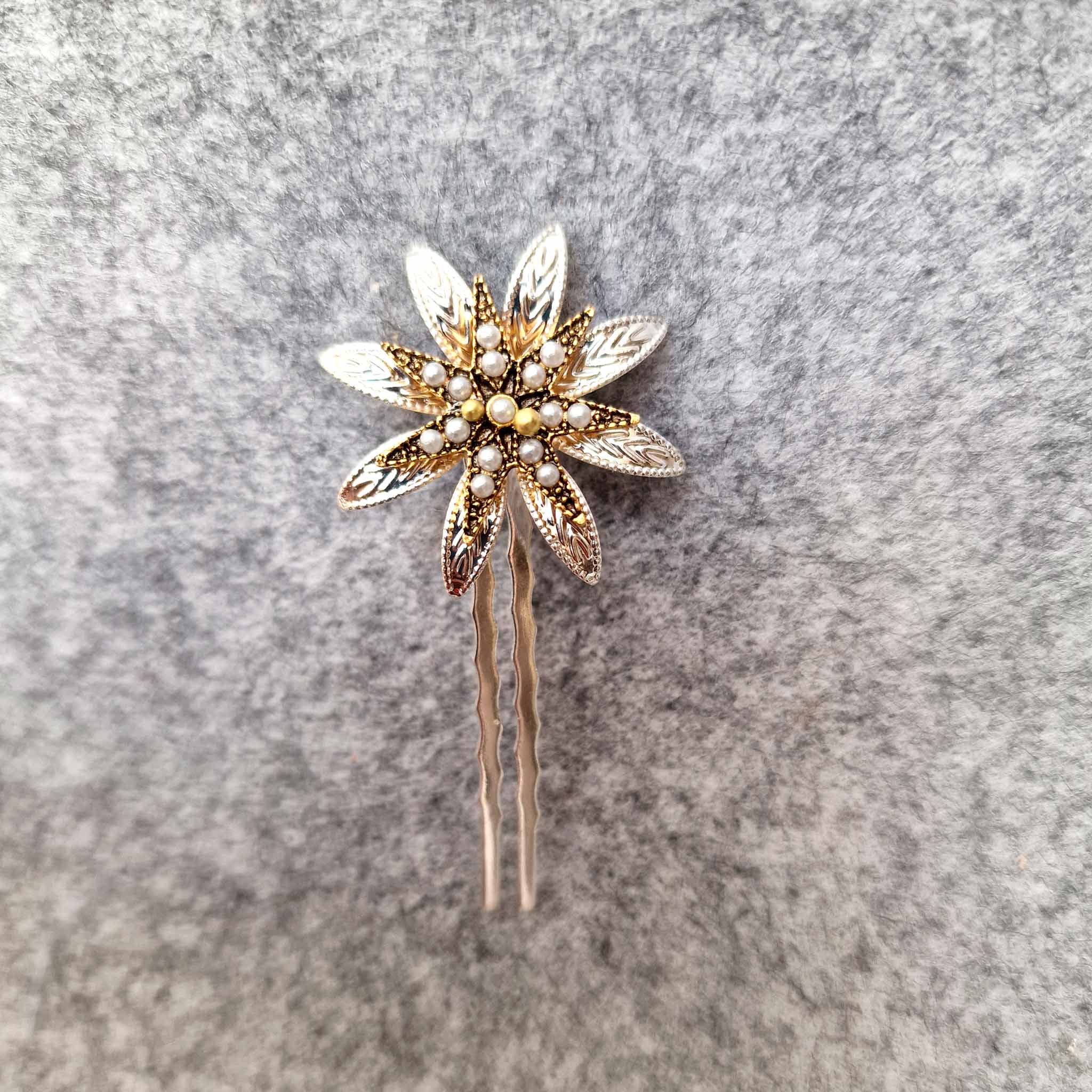 Peinas decoradas con piezas joya en forma de estrella (disponible en color blanco y negro) superpuesta sobre una flor con detalles en perlitas y brillantes. Disponibles en diferentes metales.