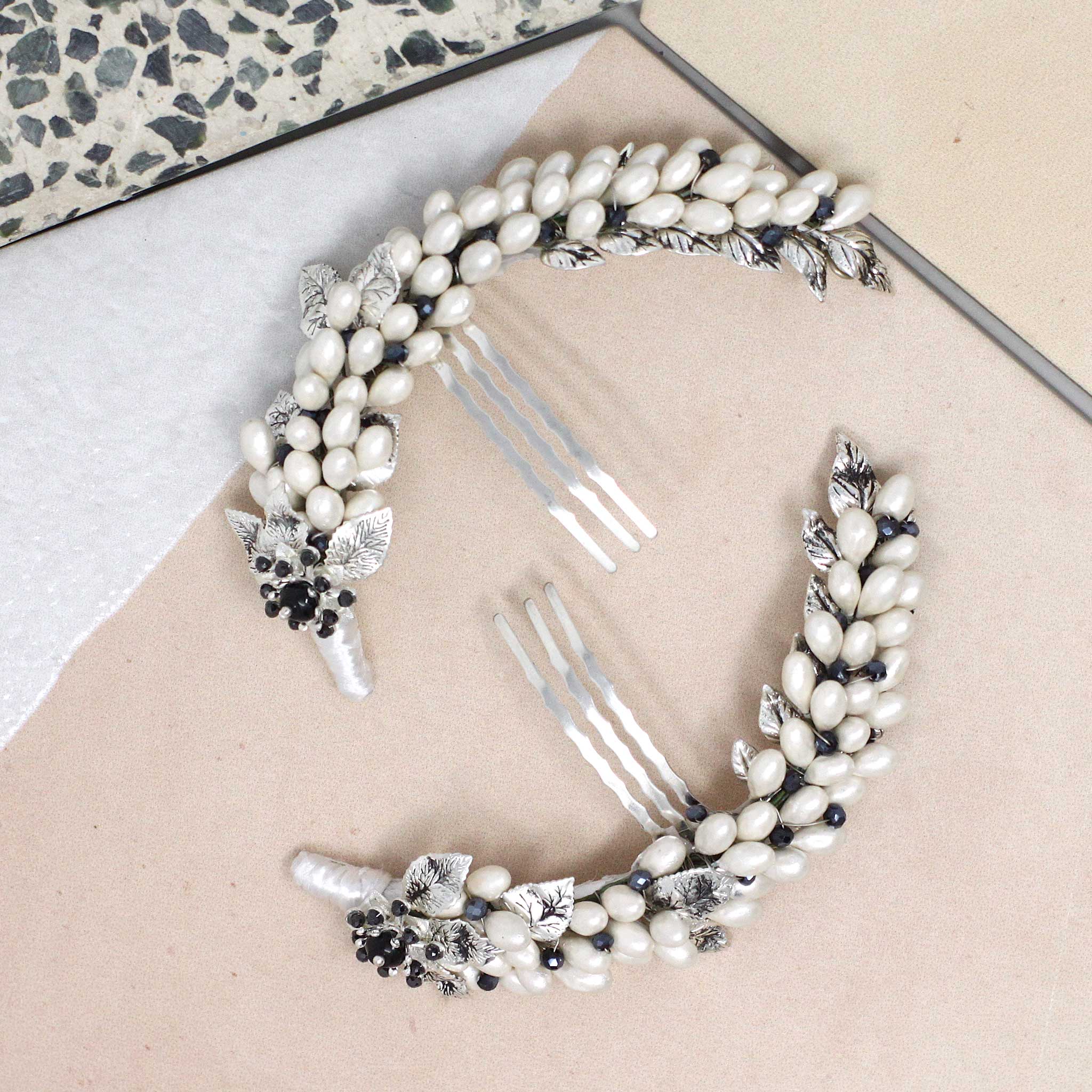 Peinas totalmente elaboradas a mano a base de en pistilos de porcelana blanco y detalles florales en tono plata.