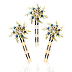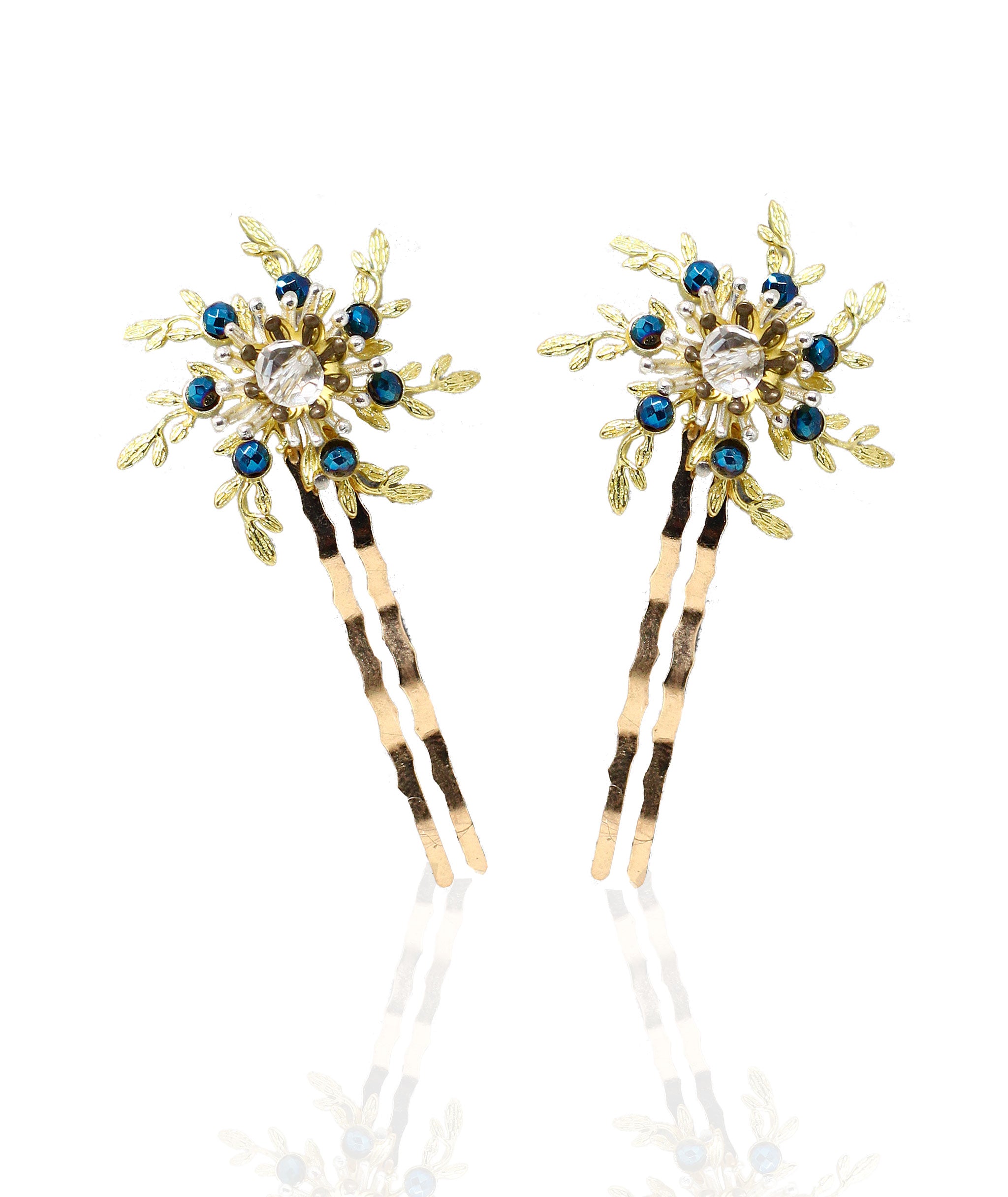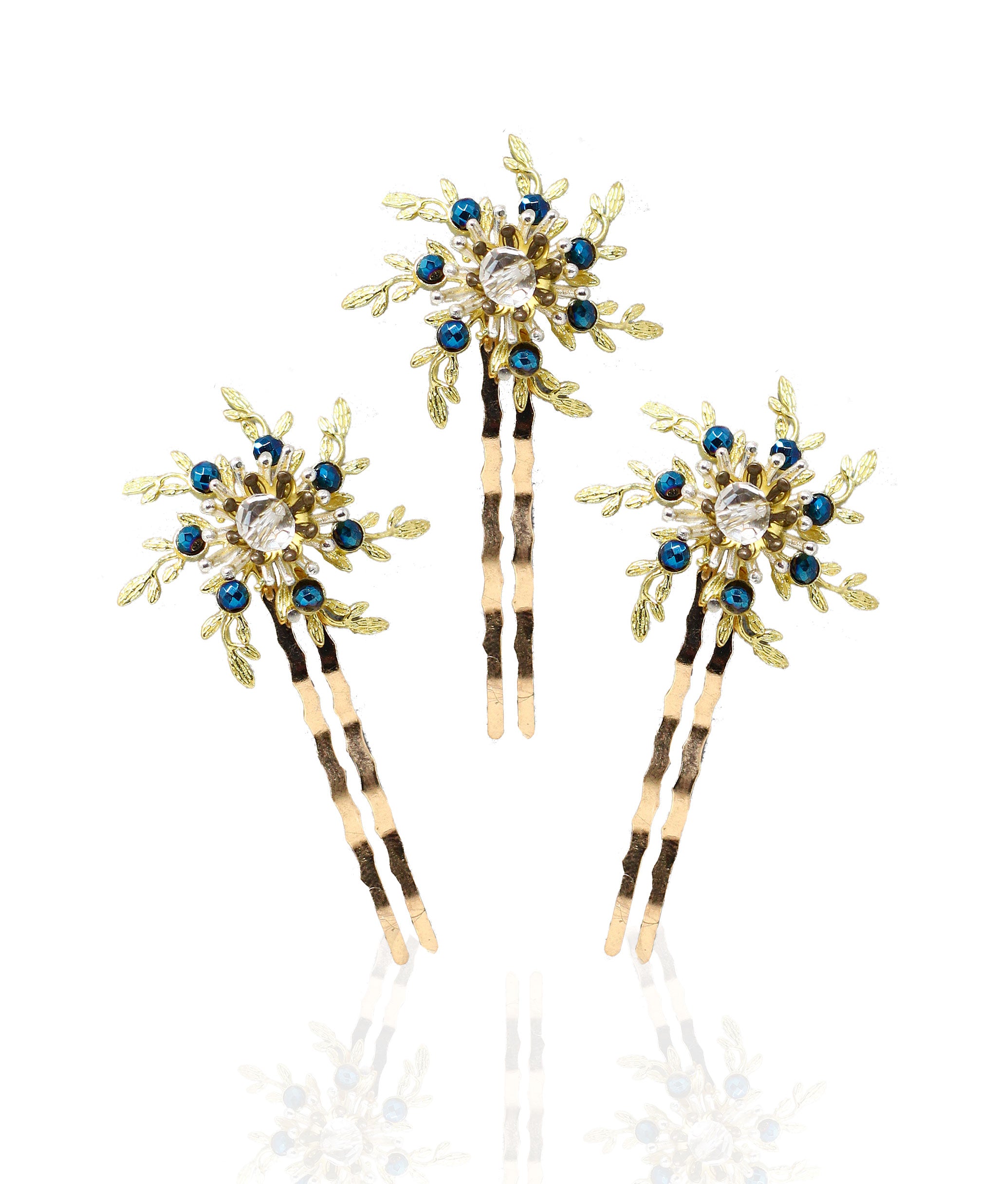 Peinas totalmente elaboradas en tonos dorados y con piedrecitas en azul con motivos florales.