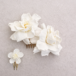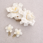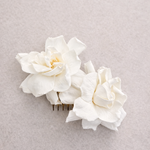 Cada peineta incorpora flores de entre 6 y 9 cm de diámetro, lo que la convierte en un complemento protagonista, perfecto para aportar un toque floral natural y sofisticado al peinado sin perder ligereza ni armonía.